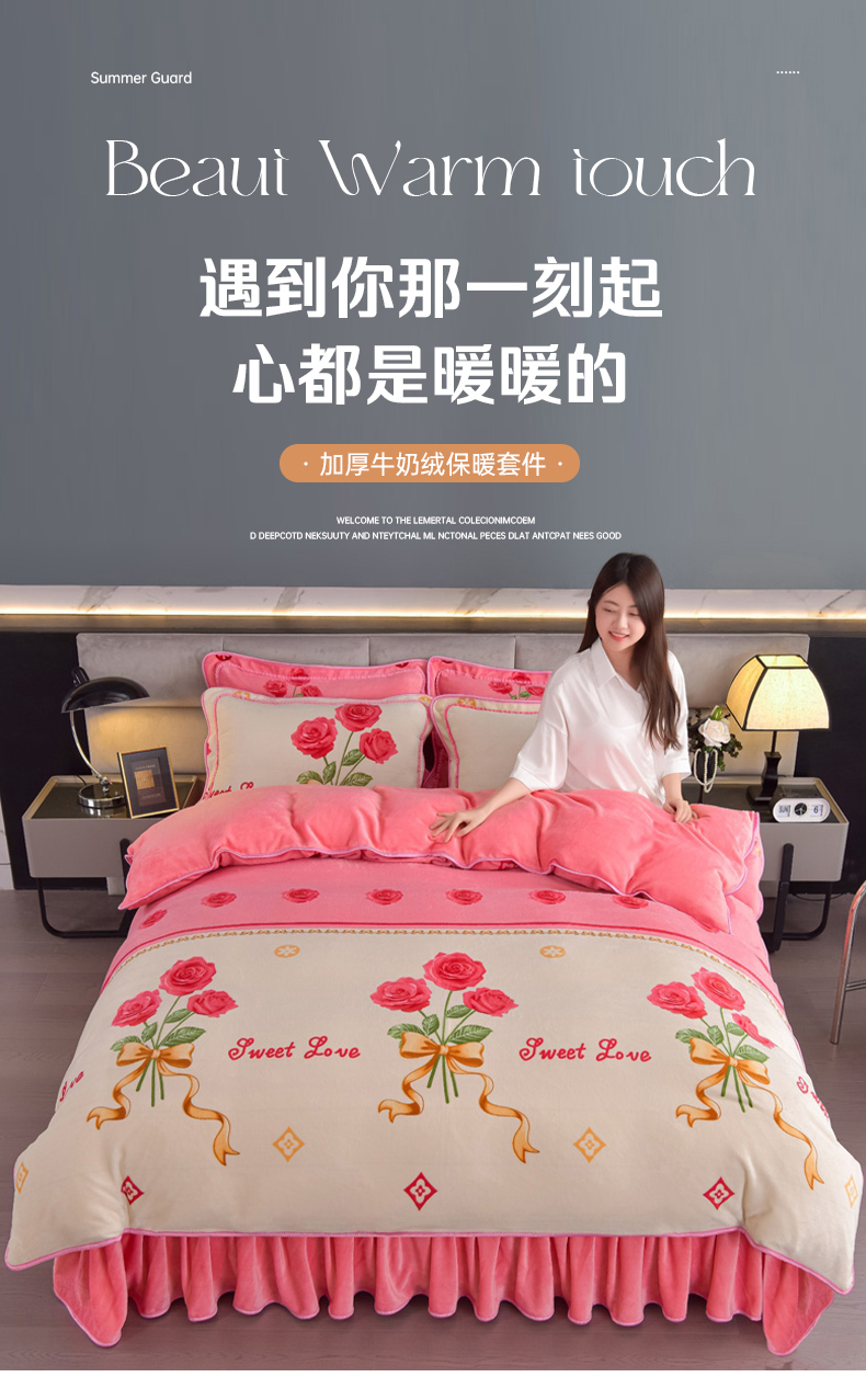 锦铭源2025年7斤加厚印花牛奶绒四件套水晶法莱金貂绒床裙款粉玫瑰