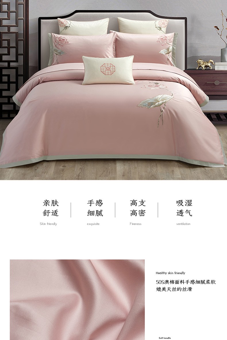 50S50支澳棉刺绣长绒棉四件套全棉新中式花卉直播爆款线下批发 清澈