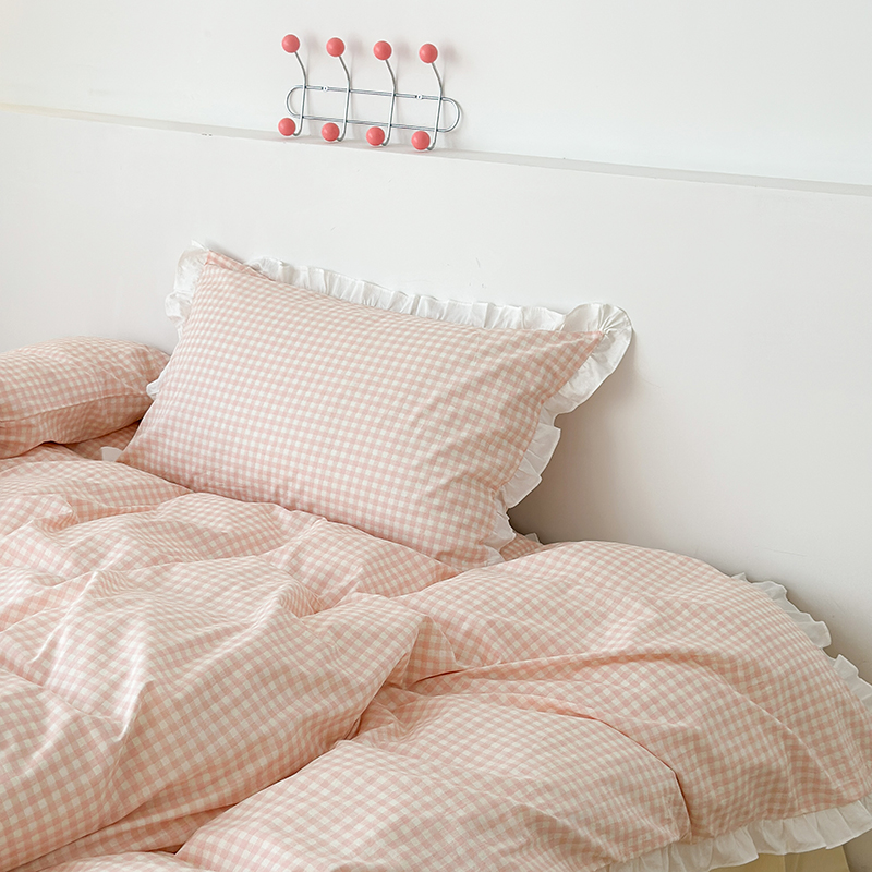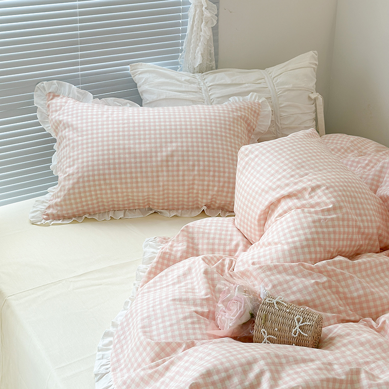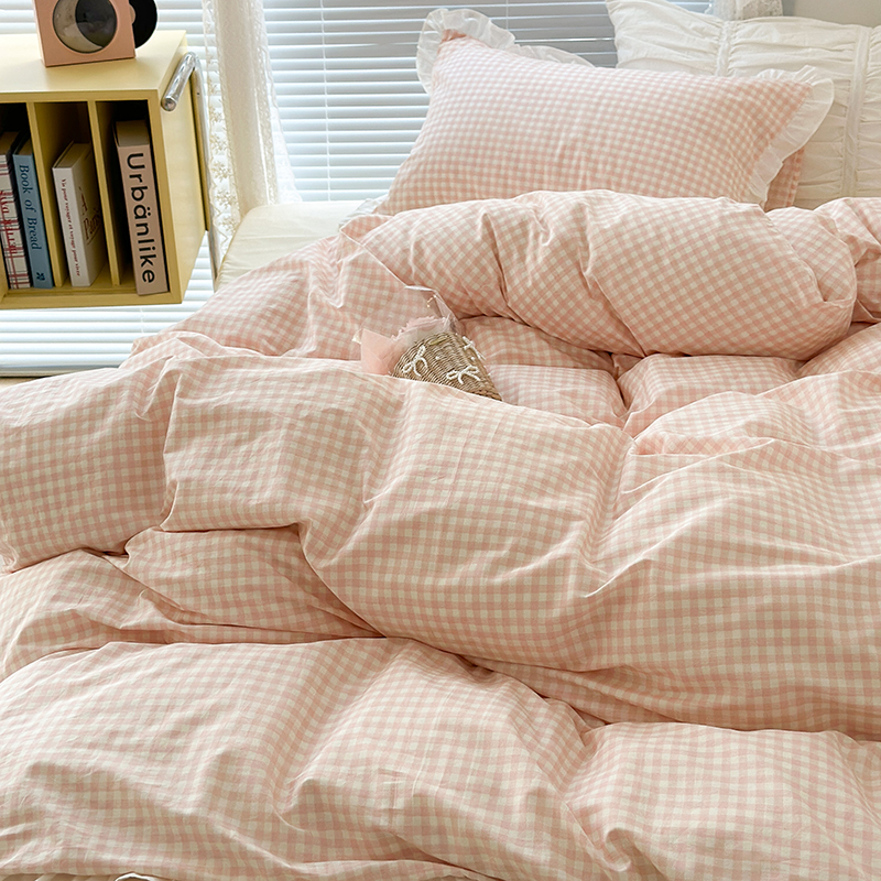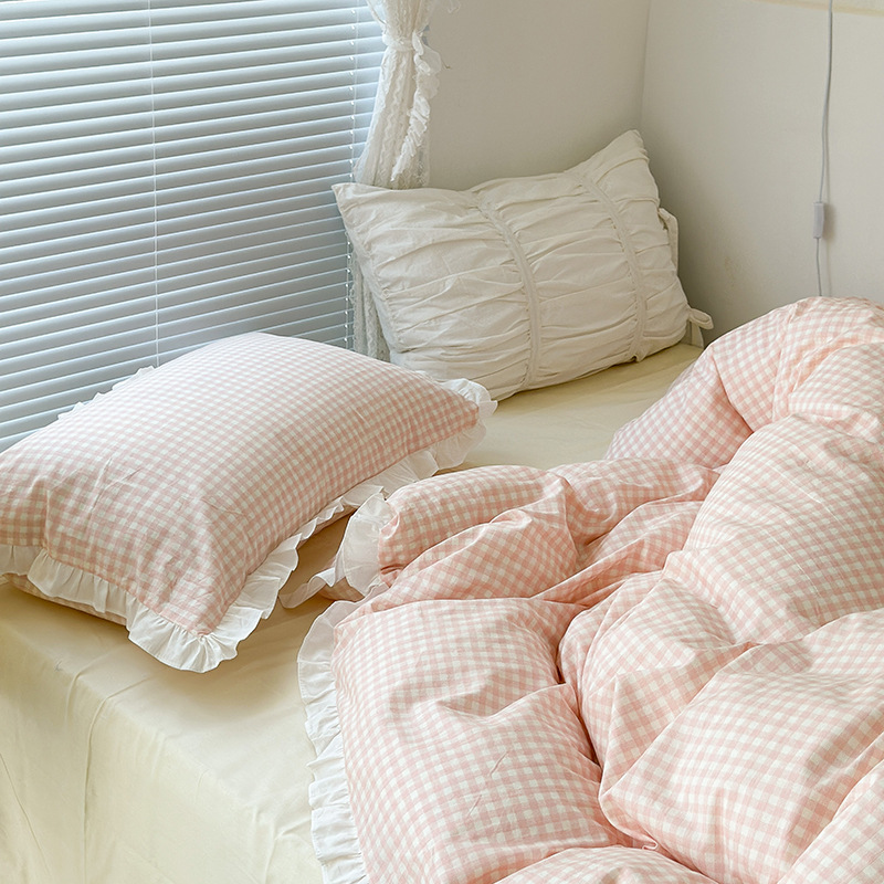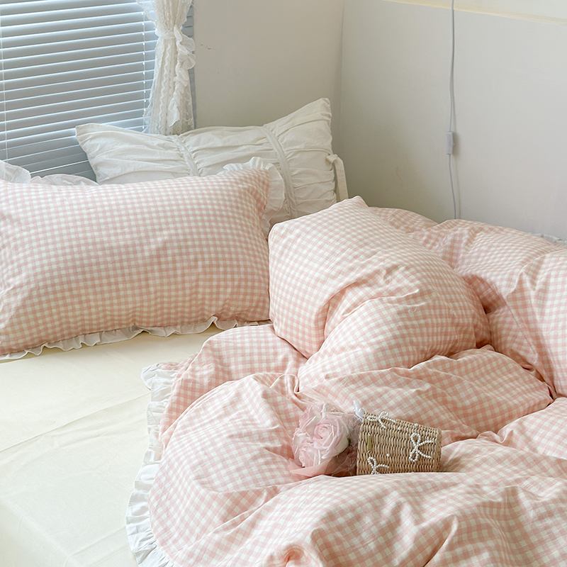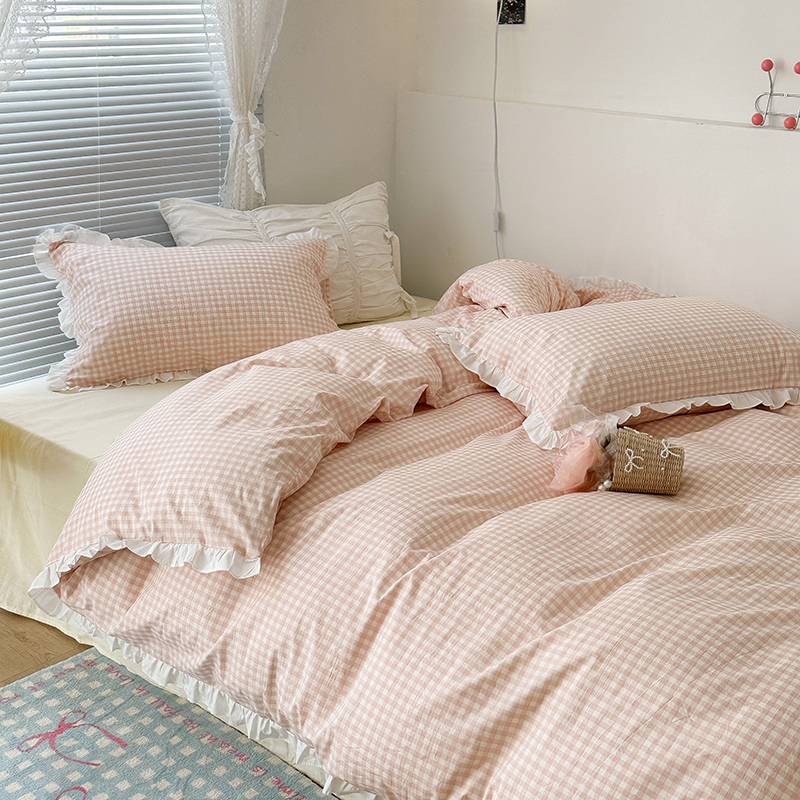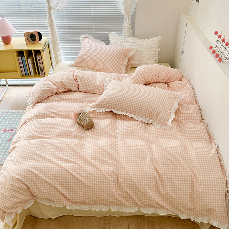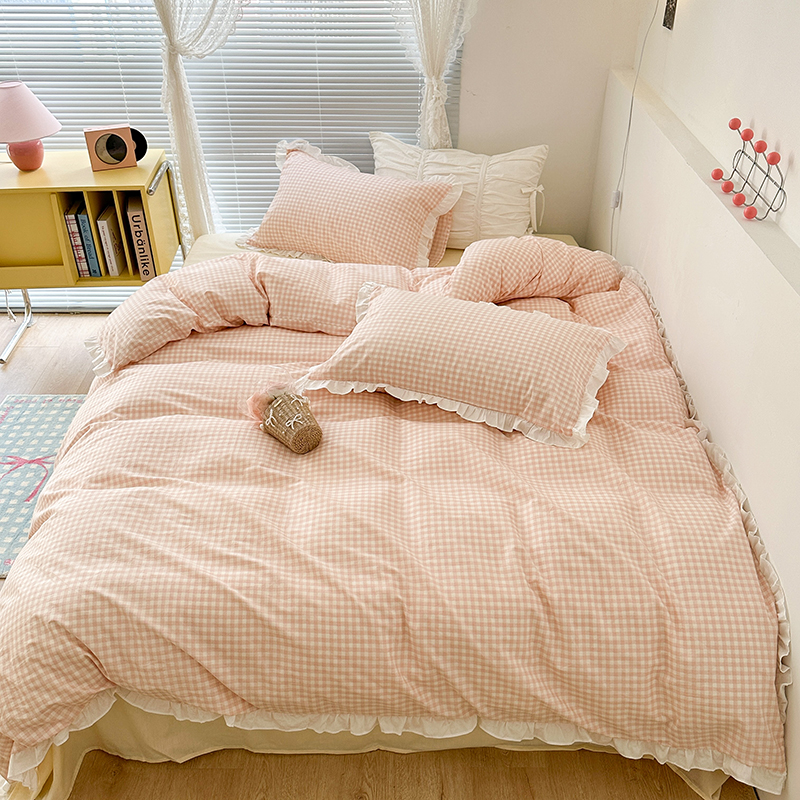 商品名称:昔可家纺 2023新款全棉花边款小格子四件套 粉粉格