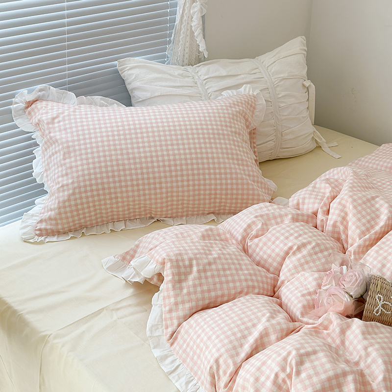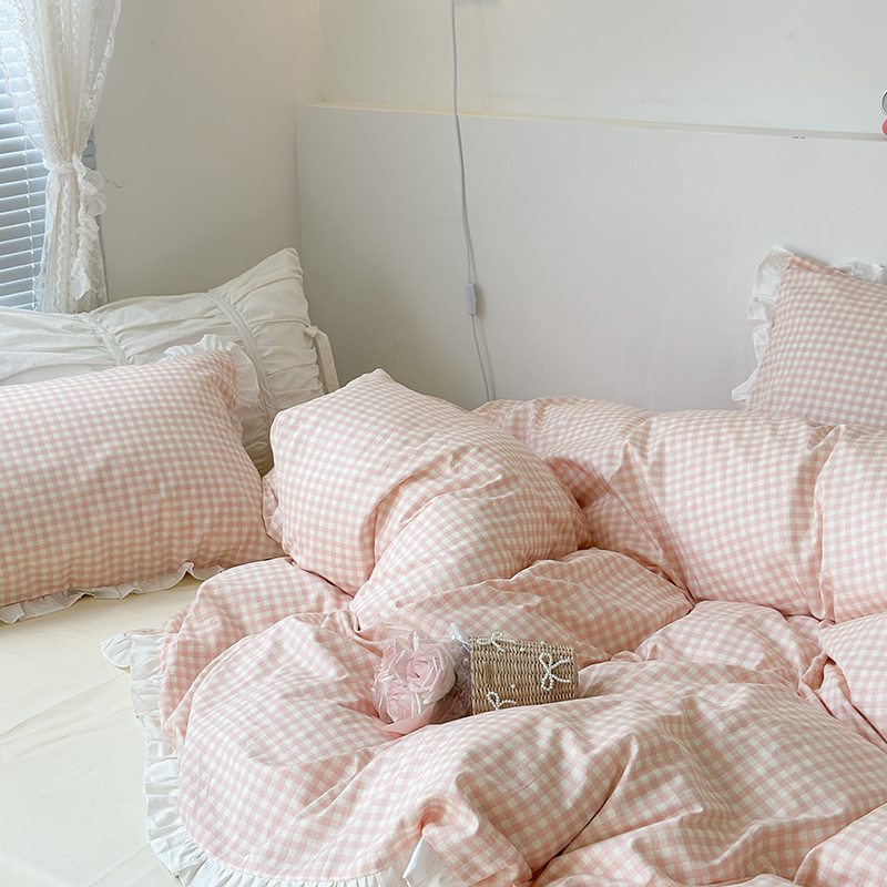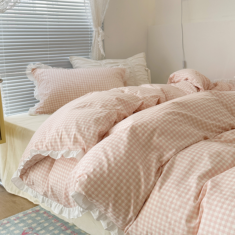 昔可家纺 2023新款全棉花边款小格子四件套 粉粉格