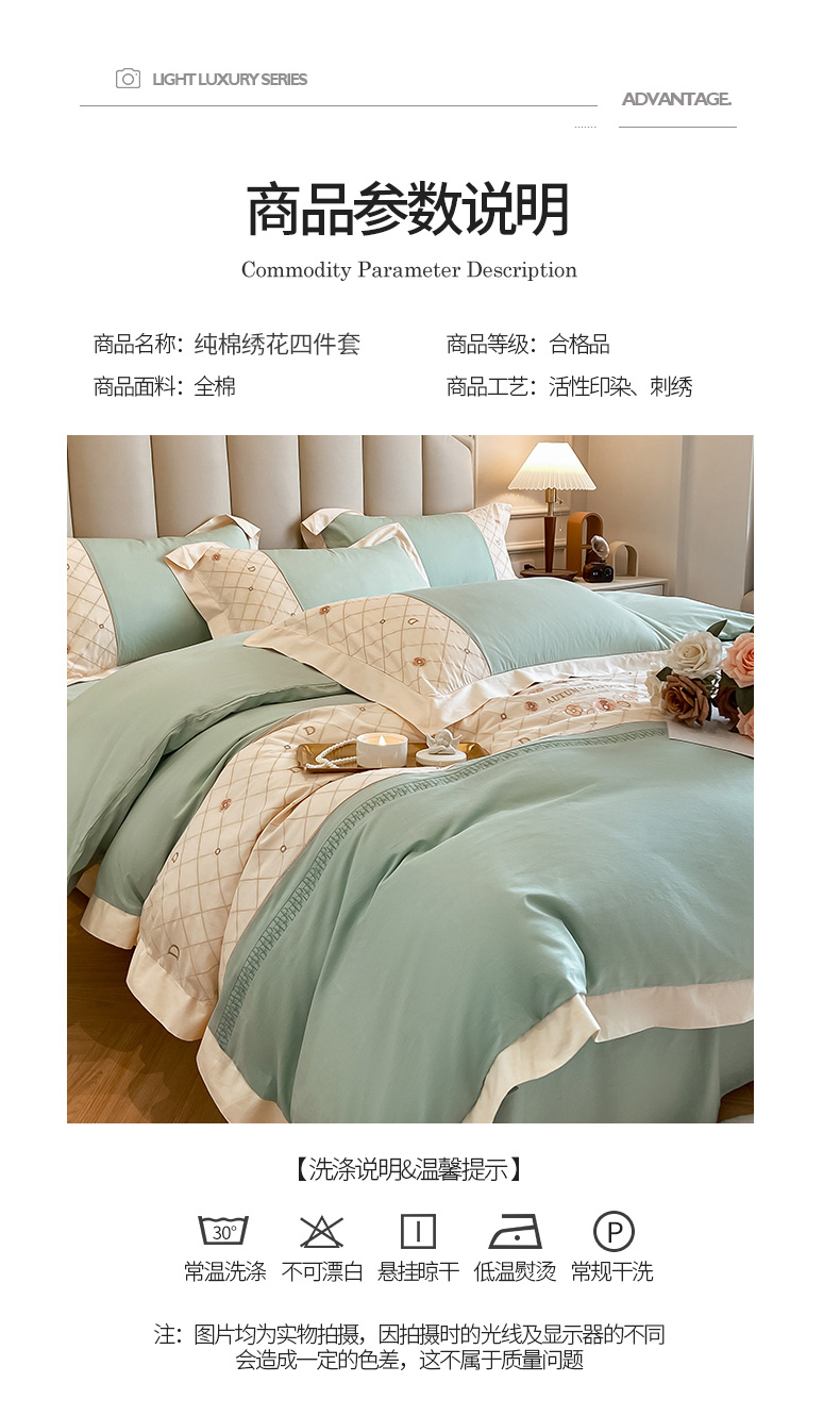 商品名称:丝印良品 2023秋冬保暖60S全棉刺绣拼接菲曼系列四件套 菲曼-薄荷绿