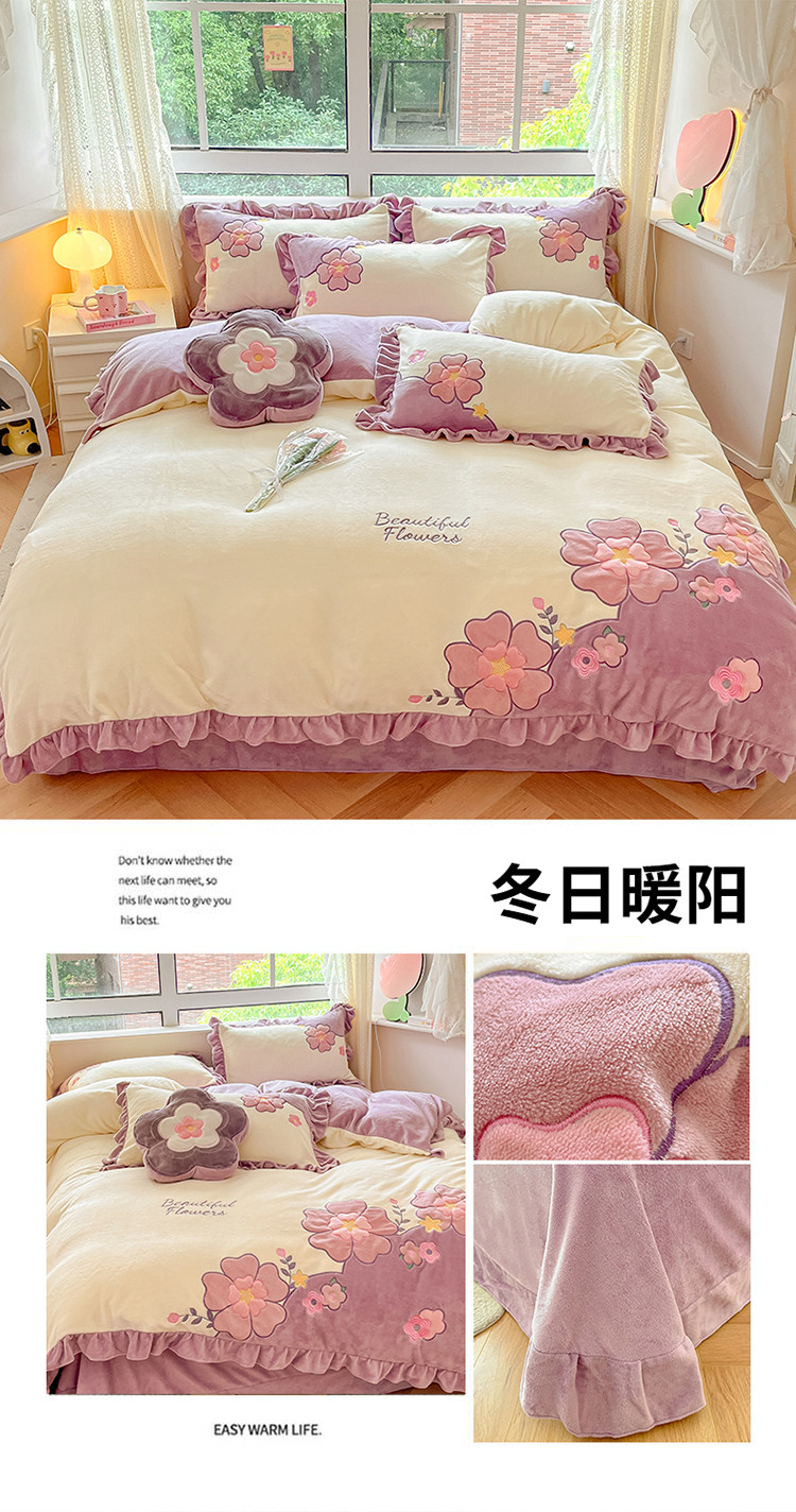 商品名称:舒梦琪2023专版花型重工刺绣高克重牛奶绒贴布绣四件套 冬日暖阳