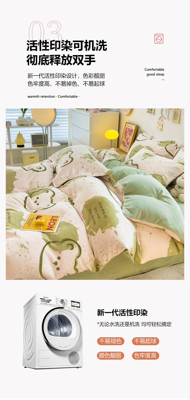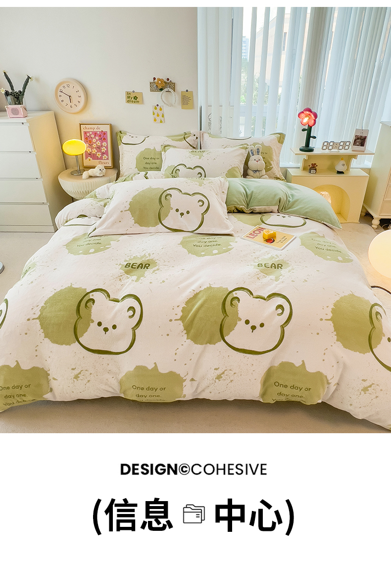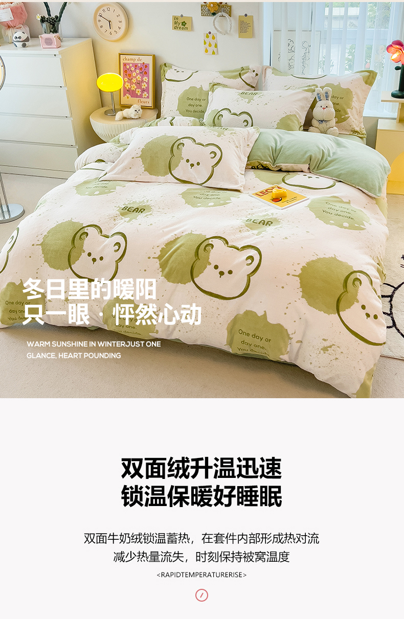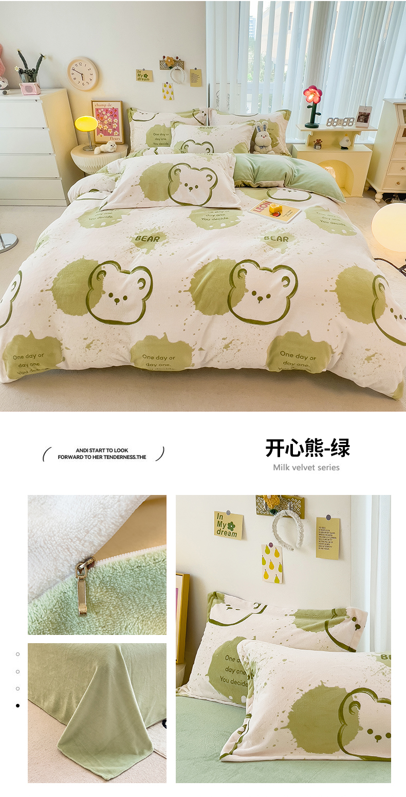 商品名称:全季家居2023新款小清新A类高克重加厚印花牛奶绒四件套 开心熊-绿