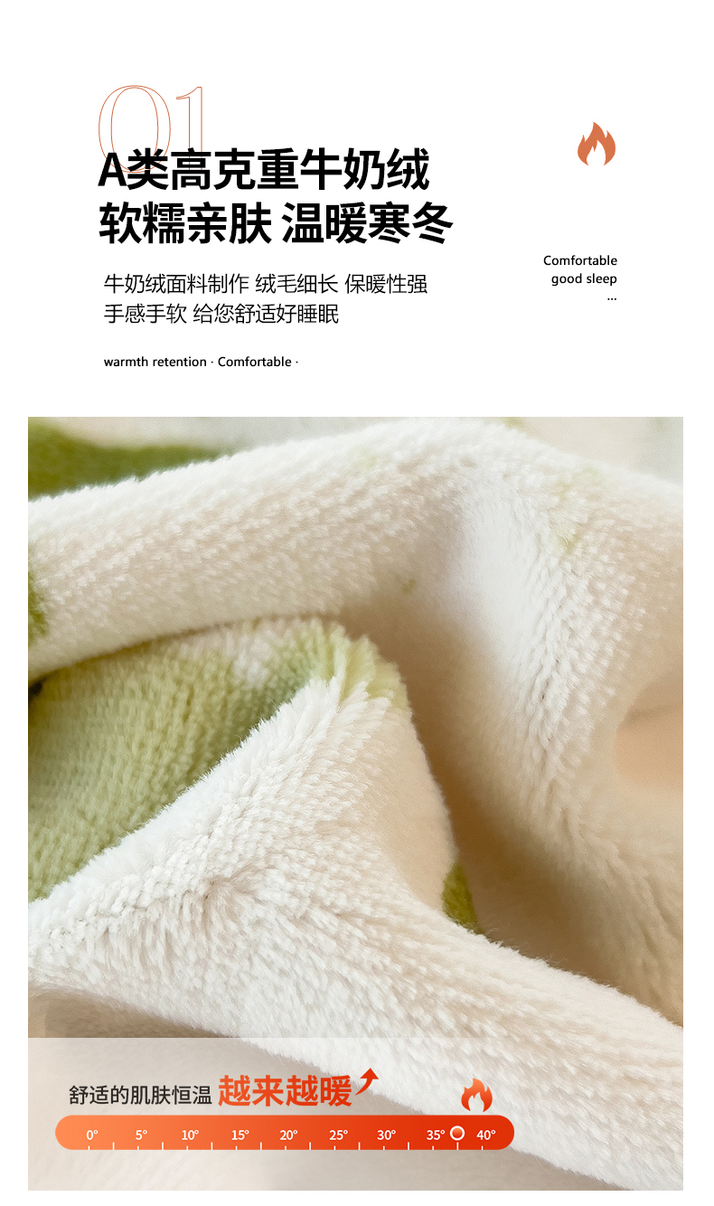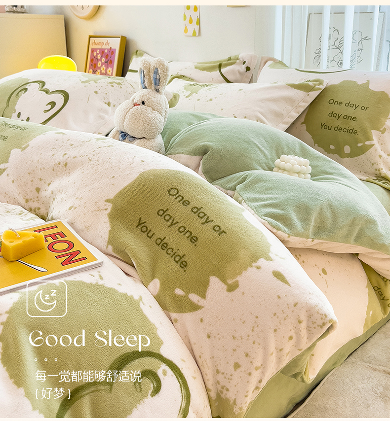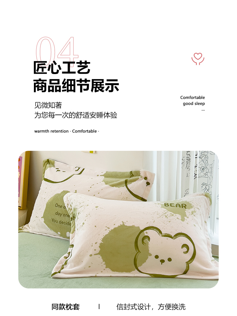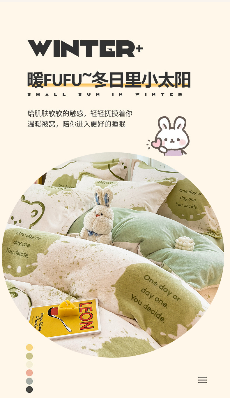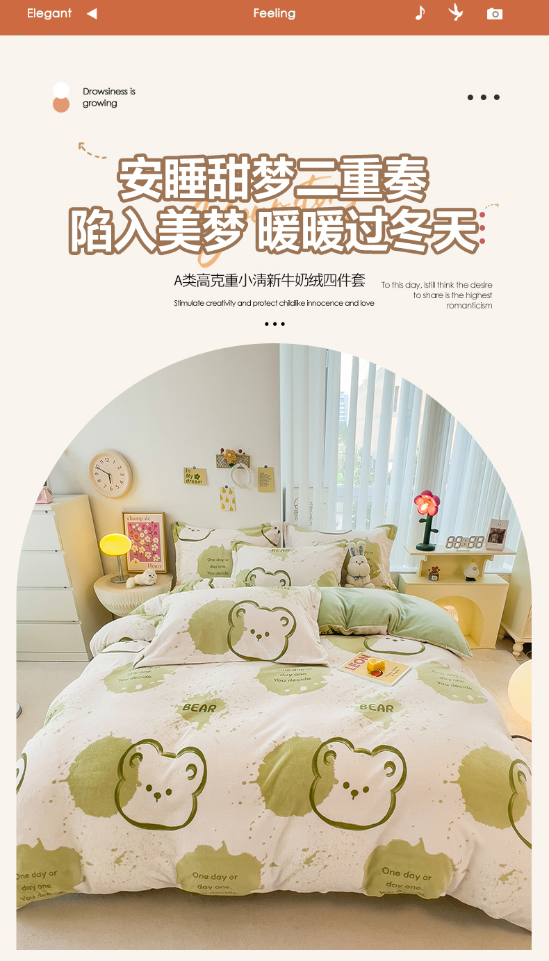 商品名称:全季家居2023新款小清新A类高克重加厚印花牛奶绒四件套 开心熊-绿