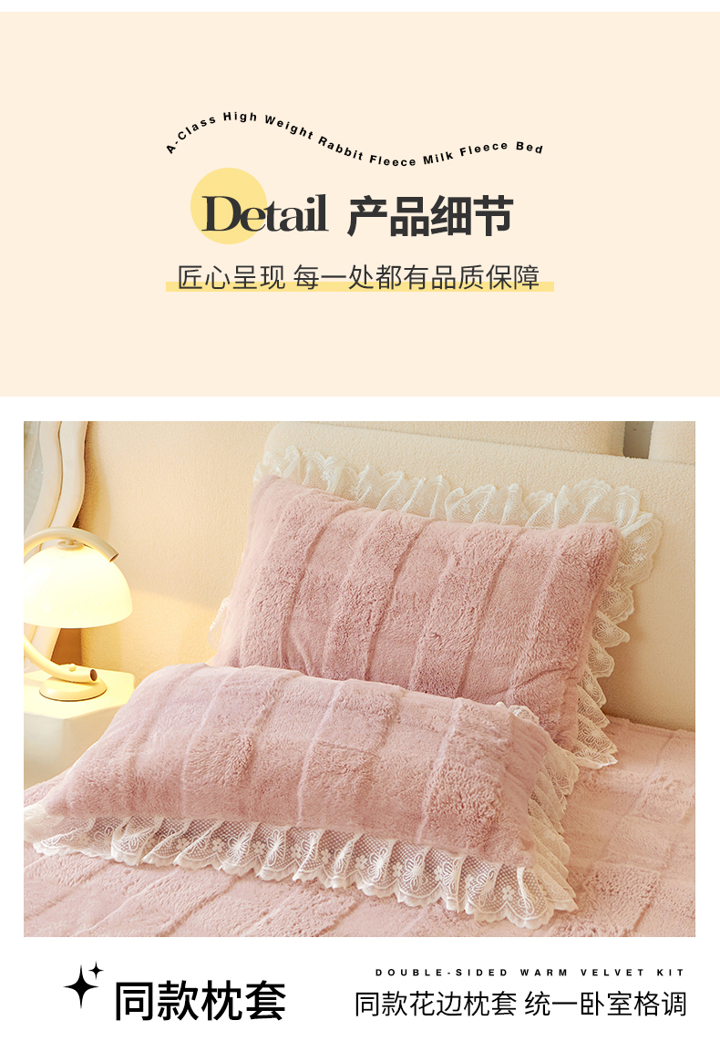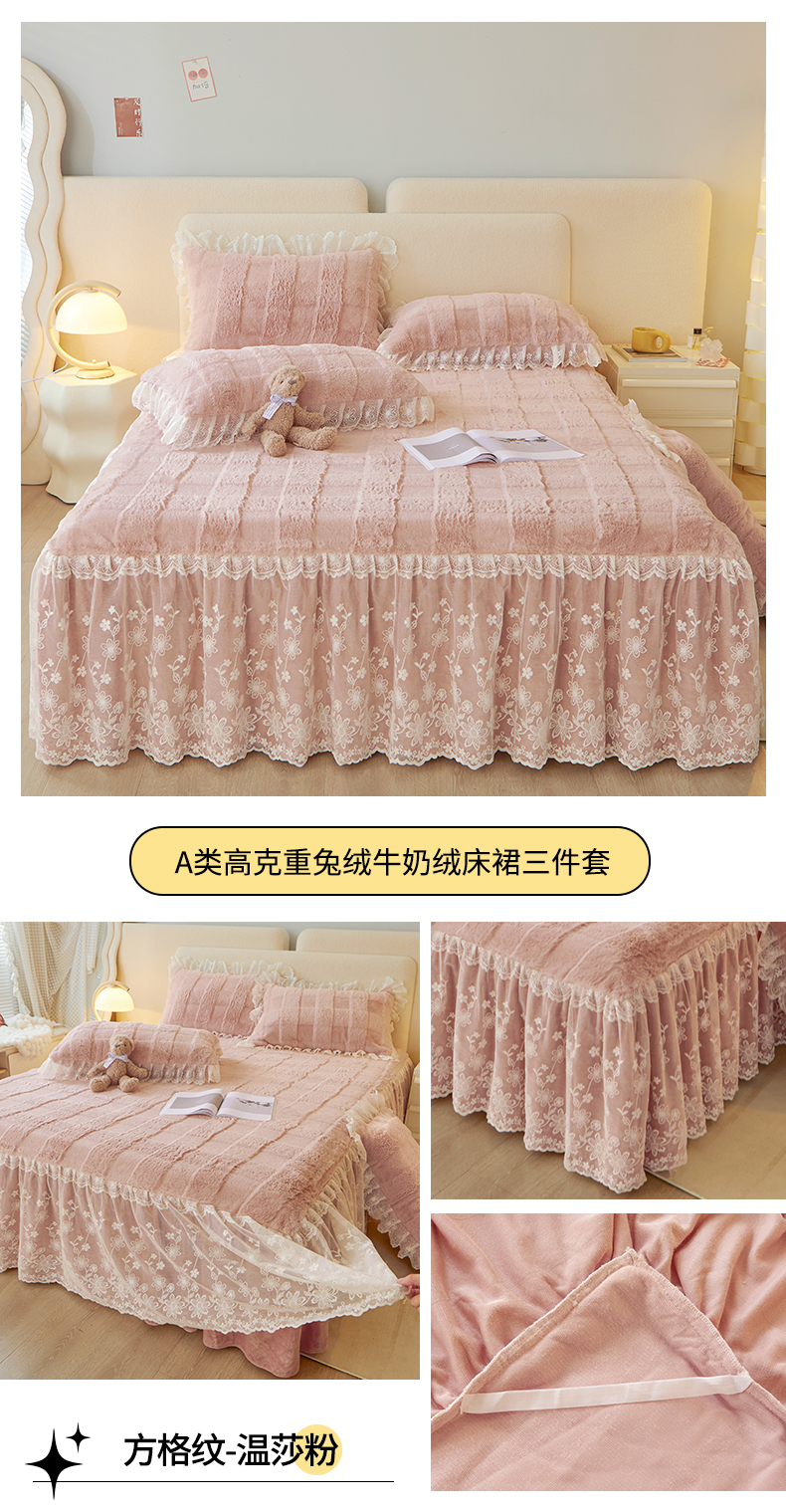 商品名称:宜凡家纺 2023新款高克重兔绒牛奶绒床裙三件套 方格纹-温莎粉