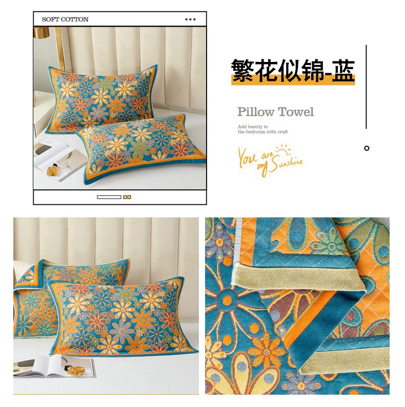 • 91家纺网 家纺一手货源 找家纺 朴尔 2023全棉四层纱布色织提花宽边时尚枕巾 繁花似锦-蓝