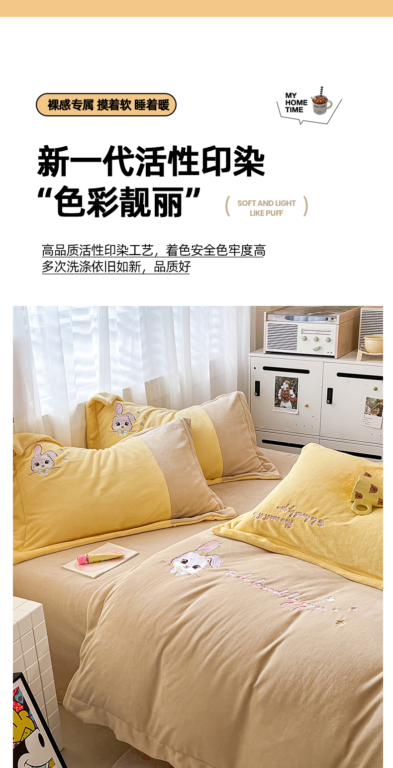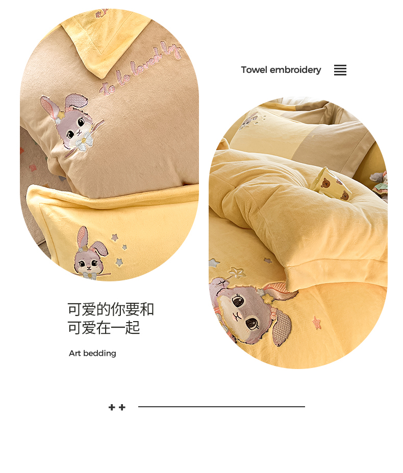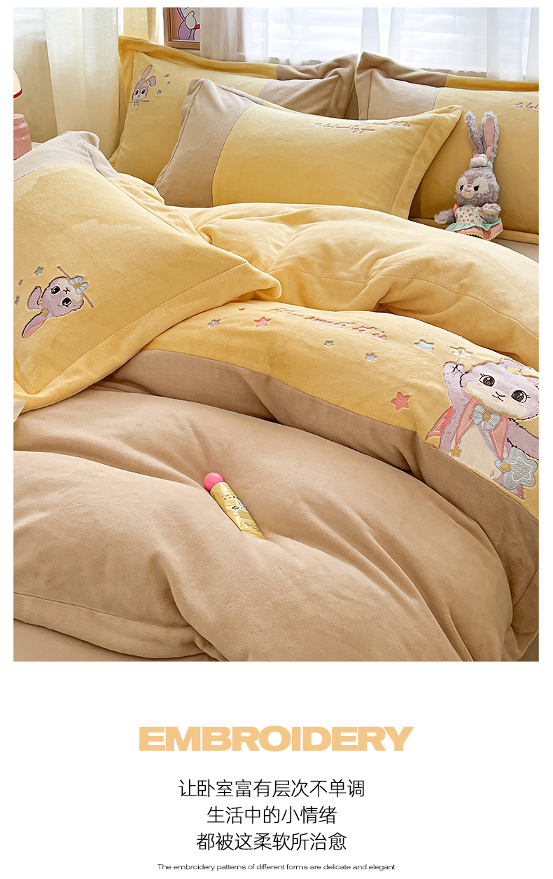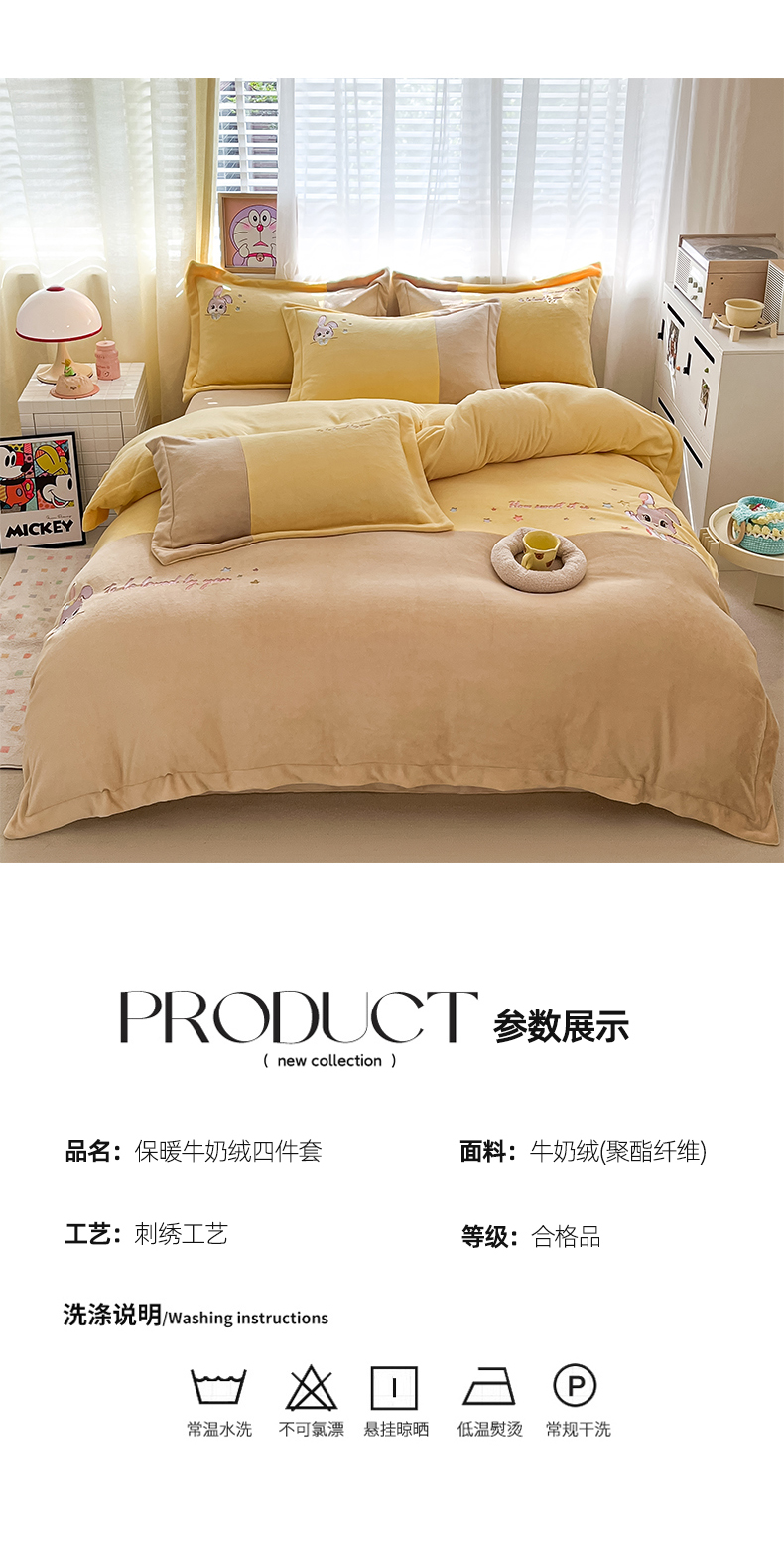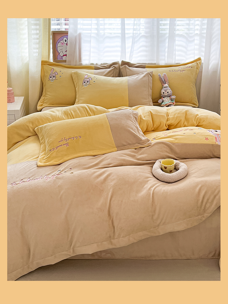 当前位置: 91家纺网 > 商品网购 > 床品套件 > 四件套 > 牛奶绒四件套 > 爱上家居 2023新款保暖加厚卡通刺绣牛奶绒四件套 兔眠-卡其拼黄