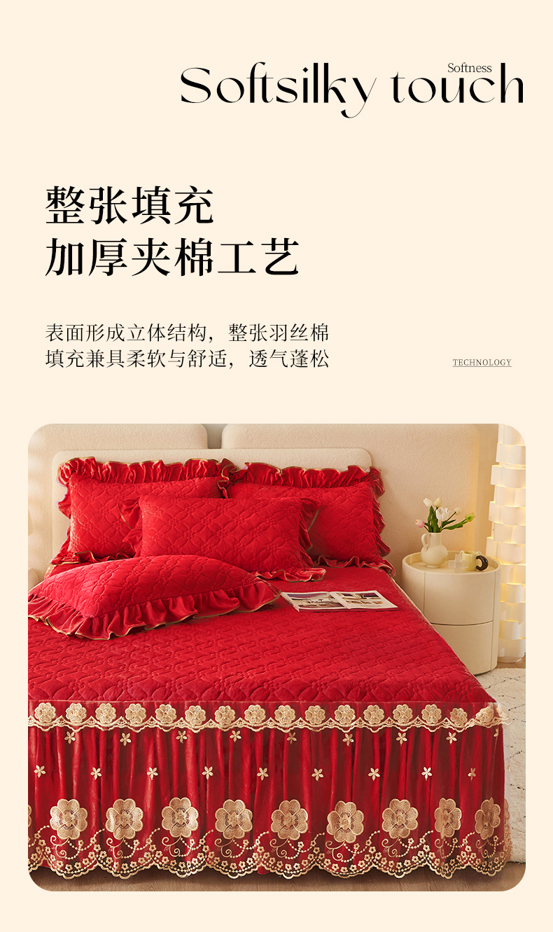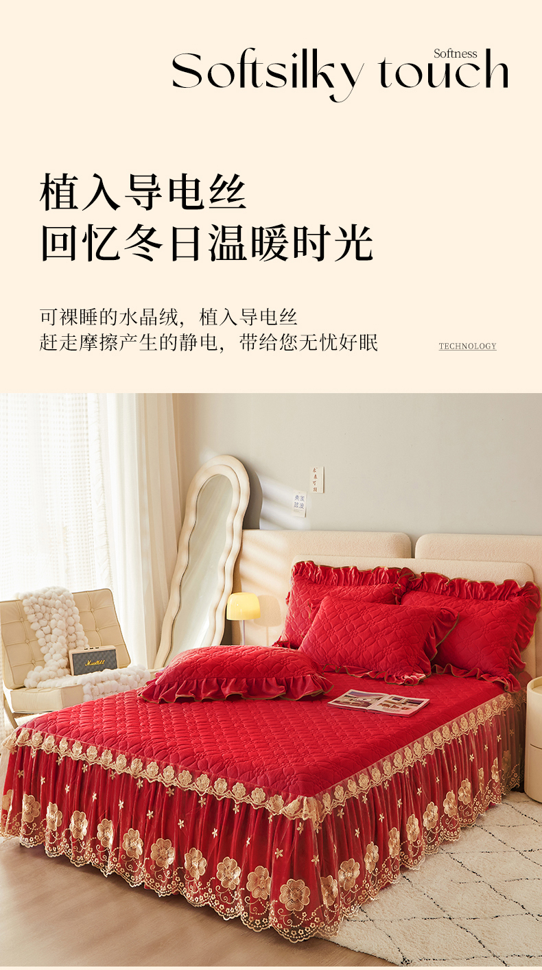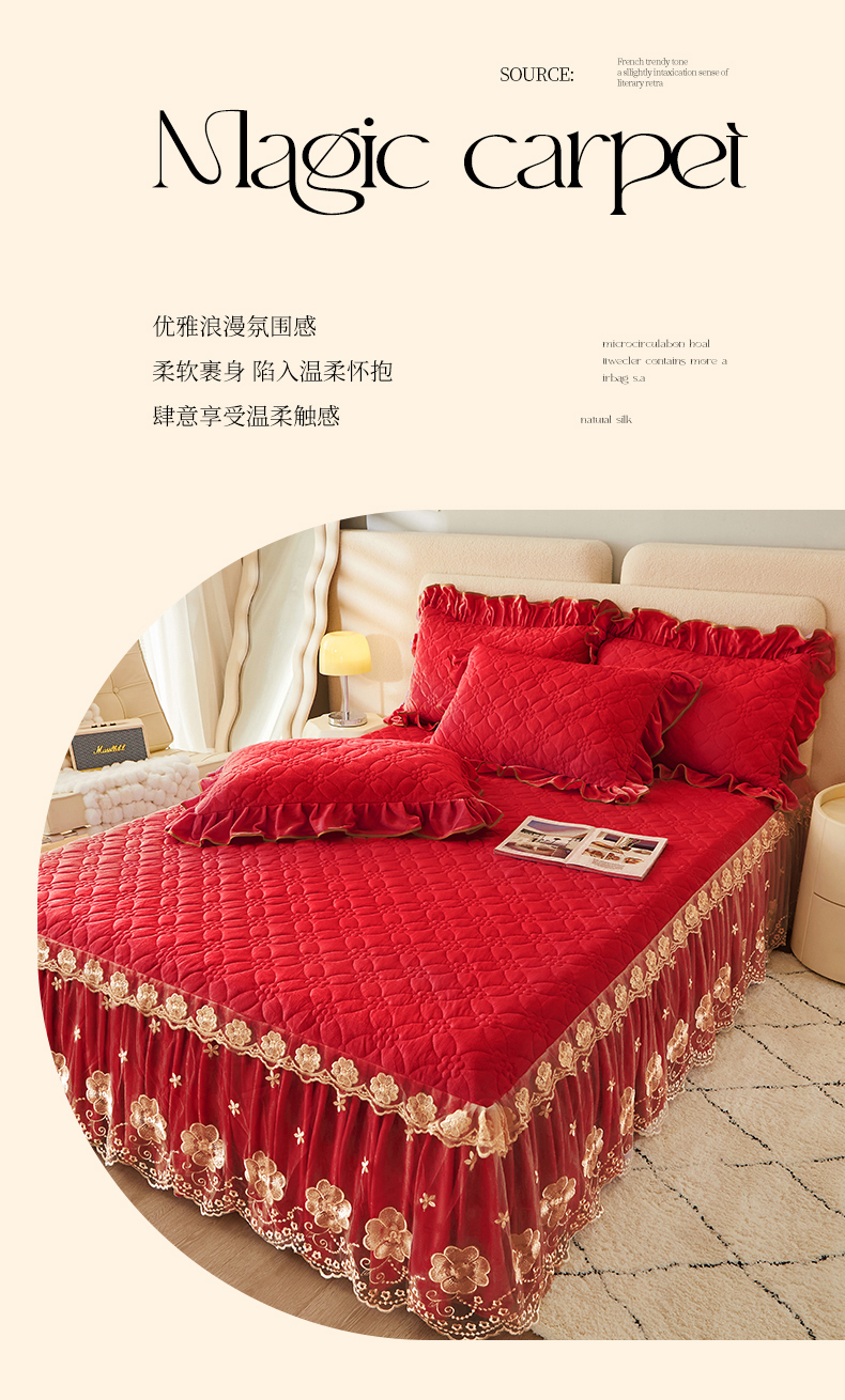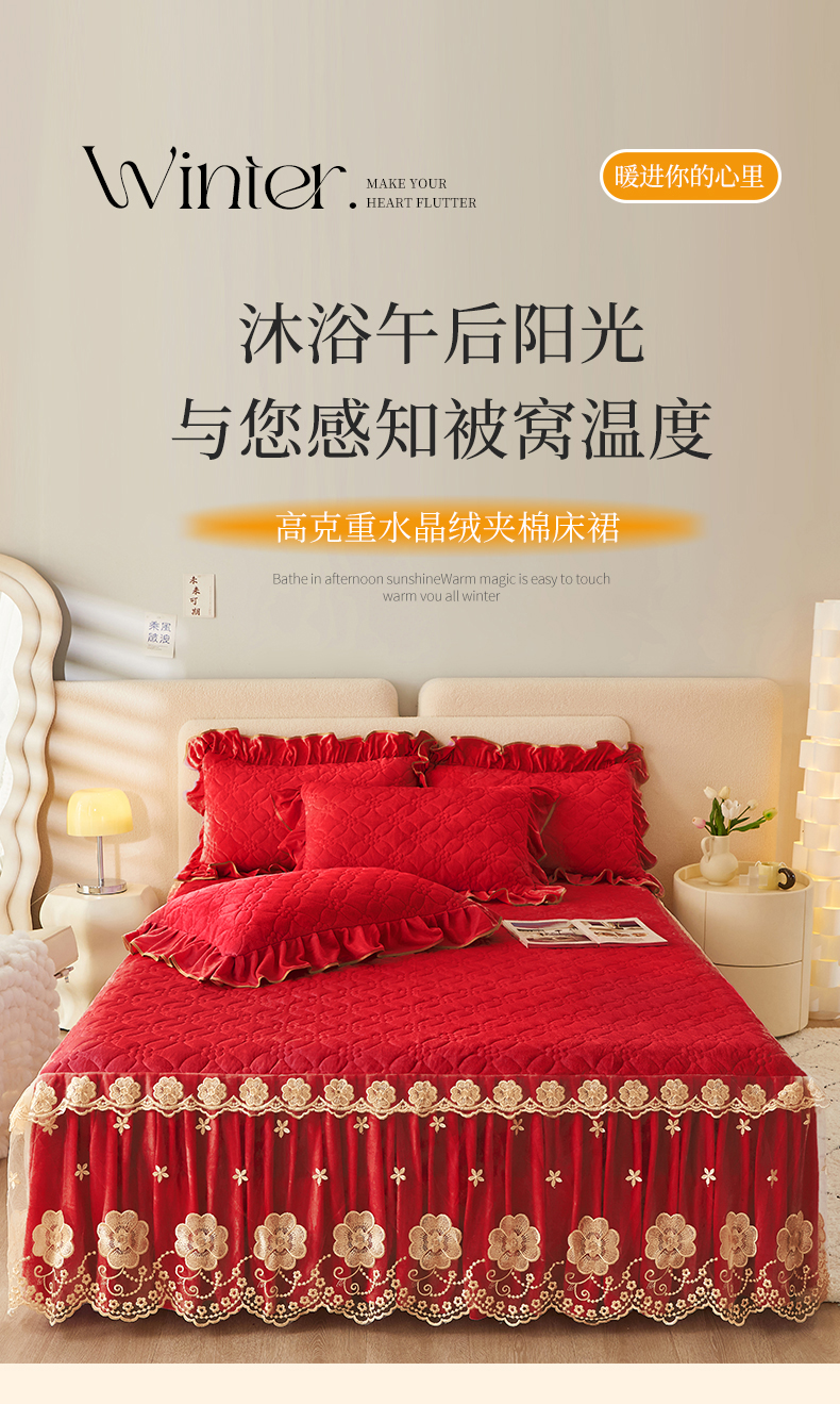 当前位置: 91家纺网 > 商品网购 > 床品套件 > 四件套 > 全棉普通四件套 > 罗艺轩 2024秋冬新款水晶绒花样年华全夹棉加厚床裙四件套 花样年华-中国红