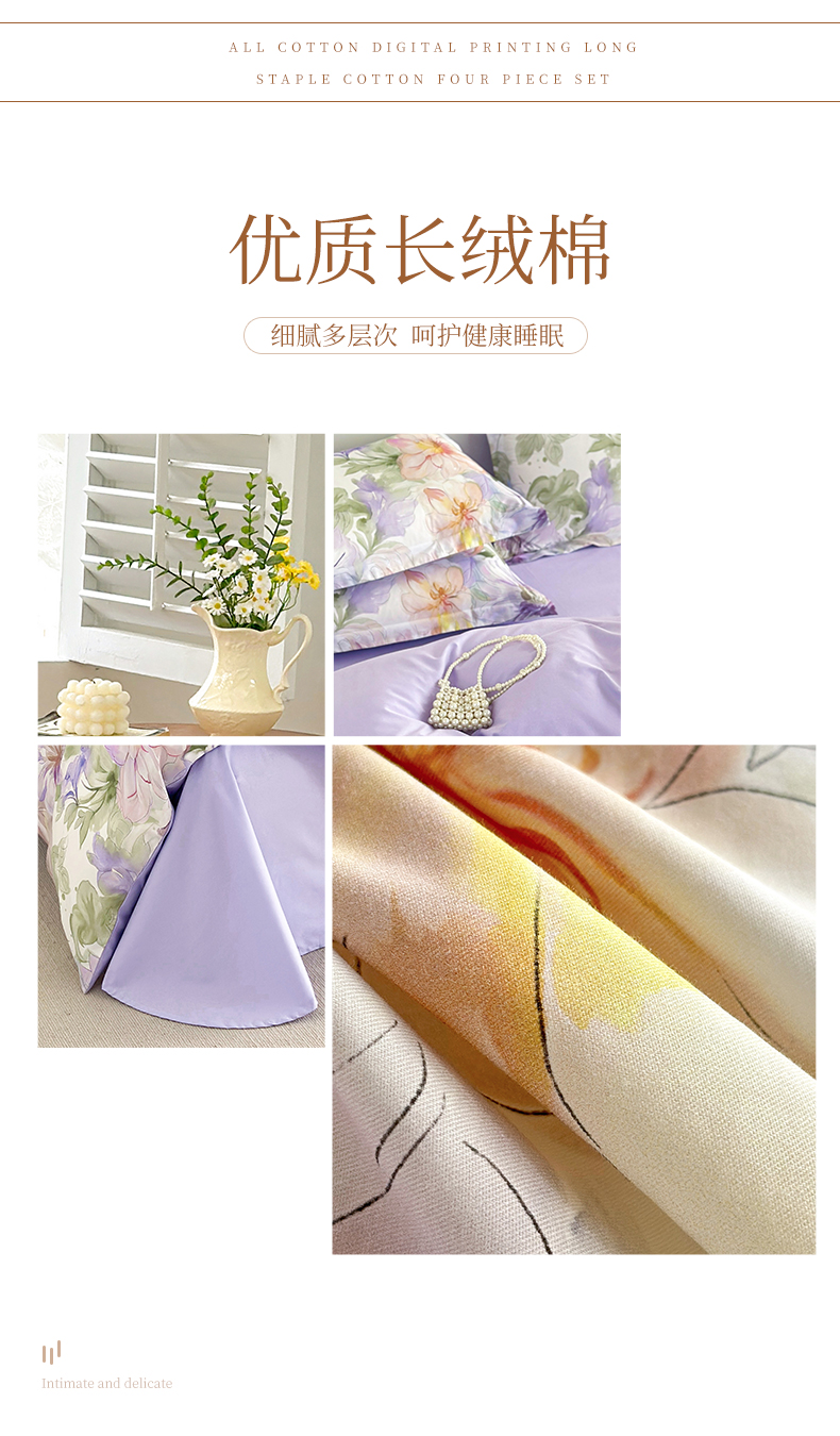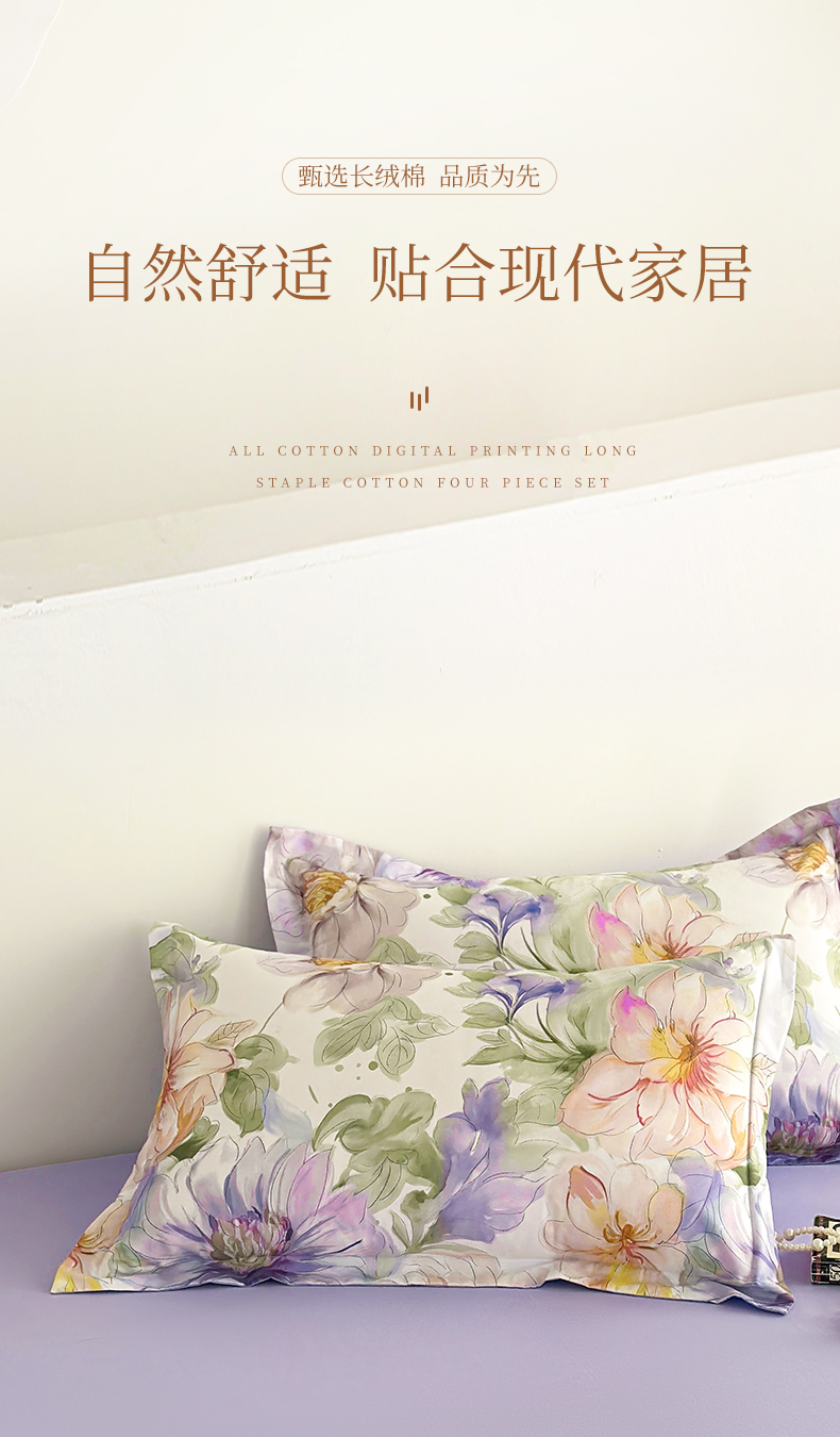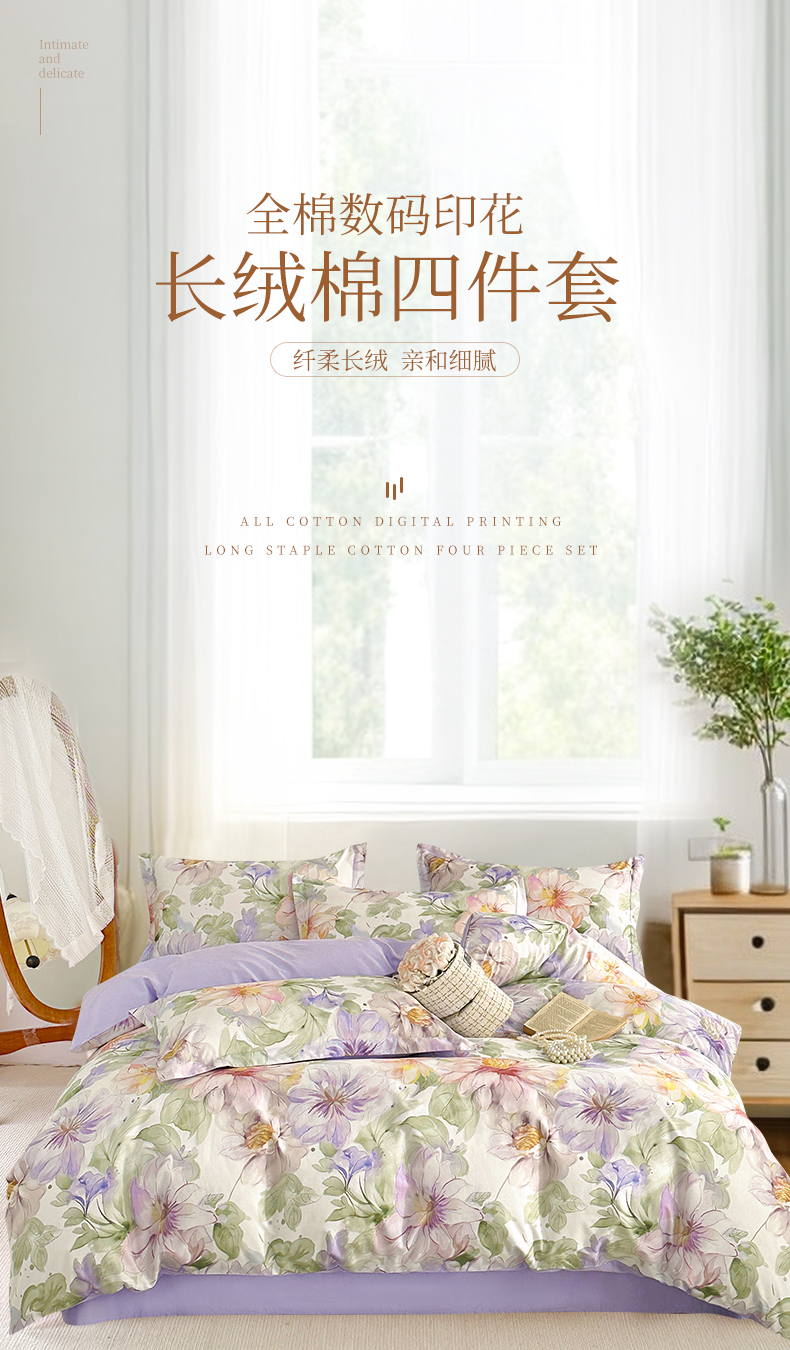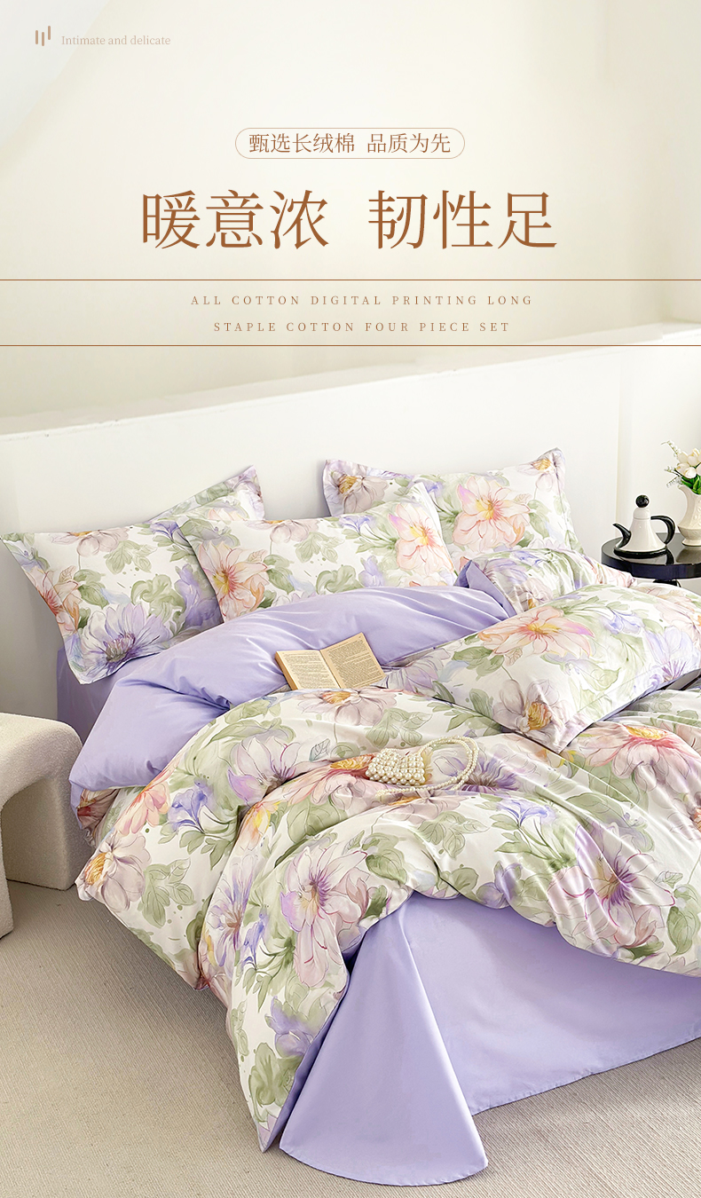 商品名称: 元元被芯 2024新款全棉长绒棉数码印花四件套全棉四件套纯棉四件套 花的旅途-紫
