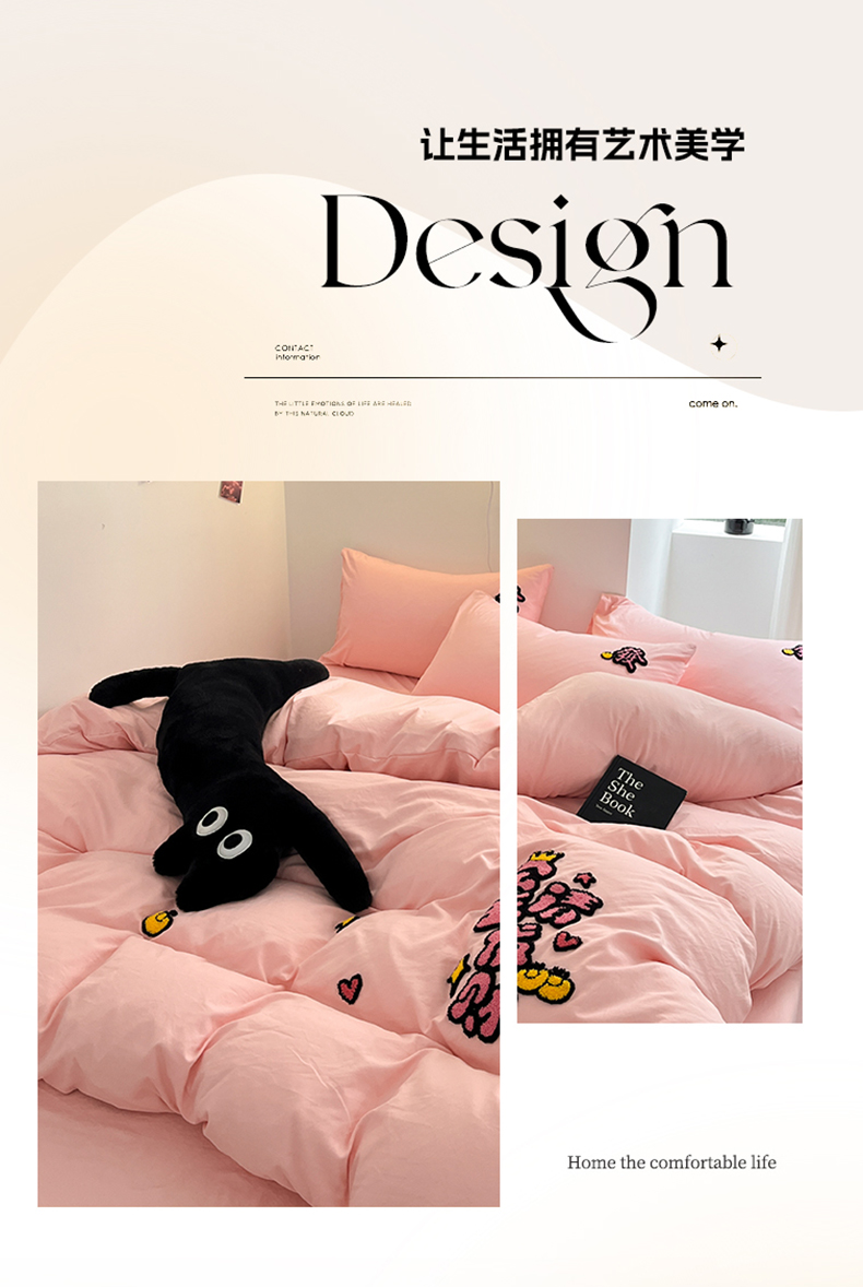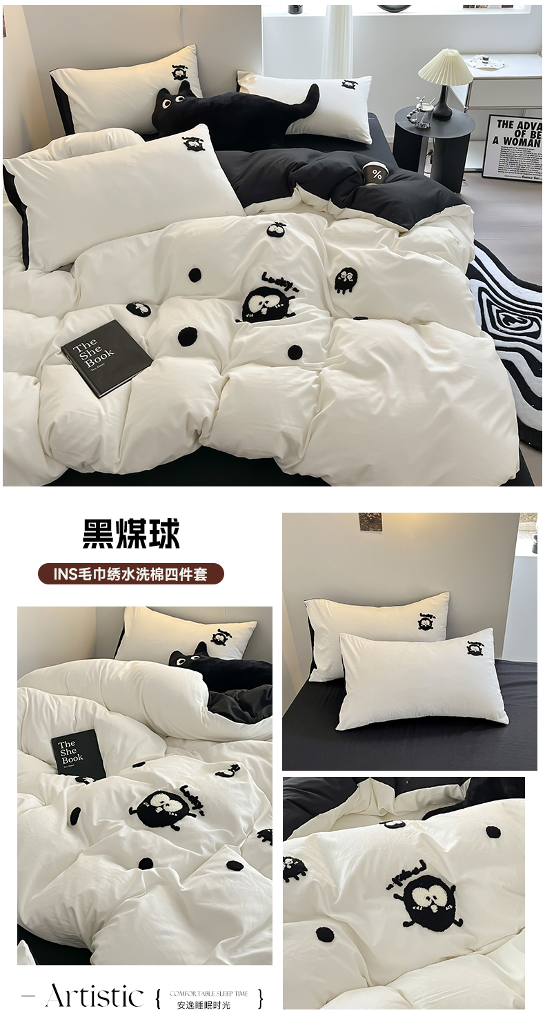 耀达家居 2024新款ins毛巾绣水洗棉四件套 黑煤球,黑煤球