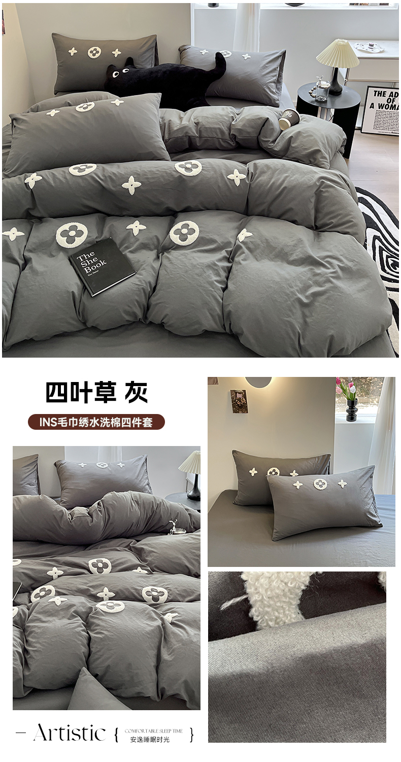 耀达家居 2024新款ins毛巾绣水洗棉四件套 四叶草 灰,四叶草 灰