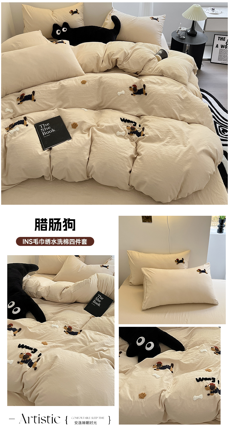 耀达家居 2024新款ins毛巾绣水洗棉四件套 腊肠狗,腊肠狗