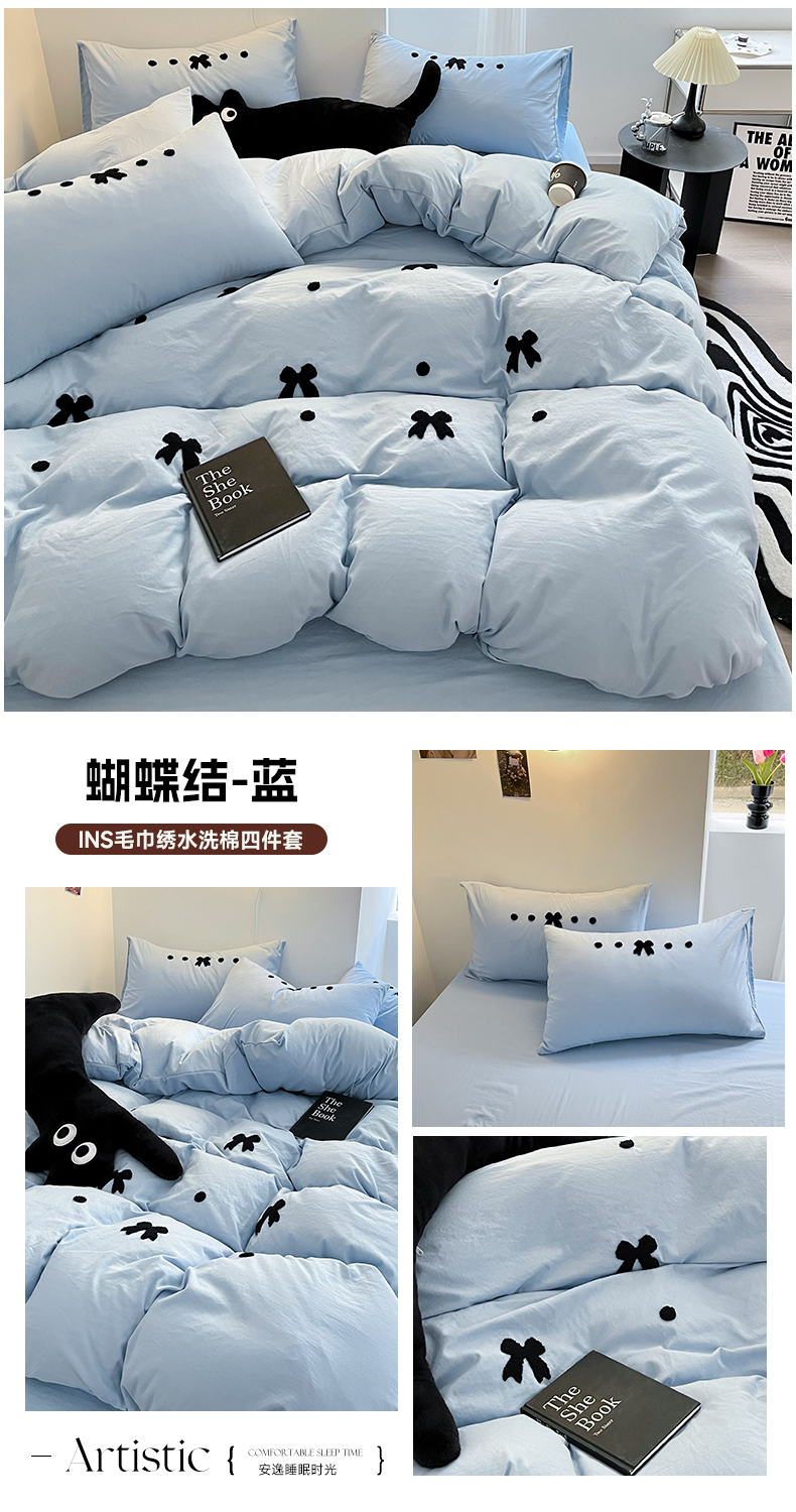 耀达家居 2024新款ins毛巾绣水洗棉四件套 蝴蝶结-蓝,蝴蝶结-蓝