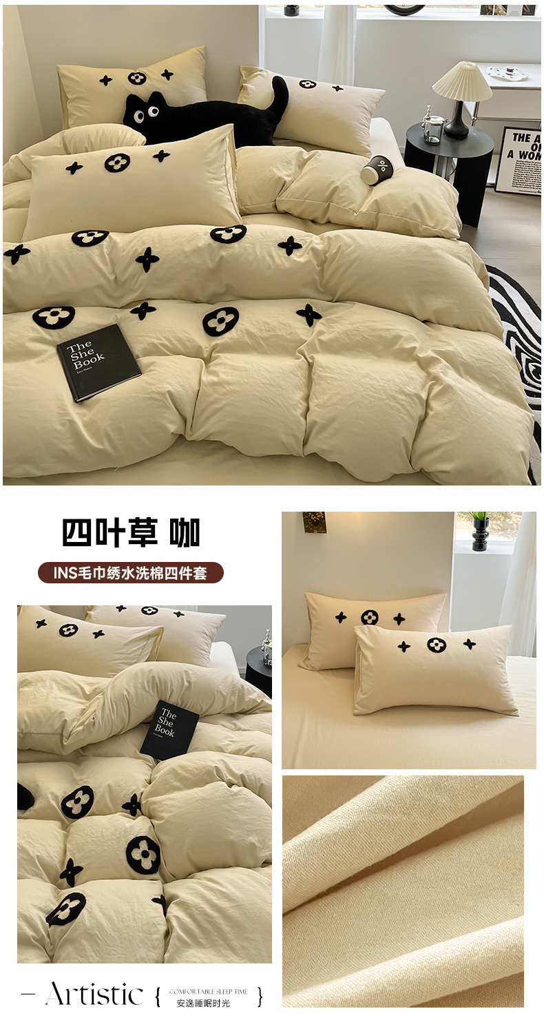 耀达家居 2024新款ins毛巾绣水洗棉四件套 四叶草 咖,四叶草 咖
