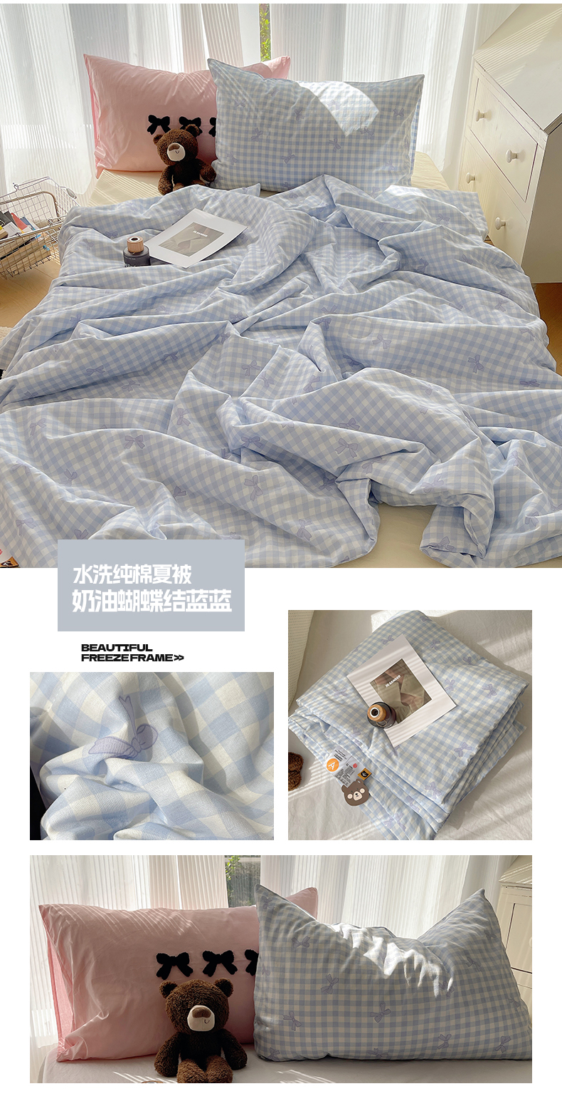 • 91家纺网 家纺一手货源 找家纺 桃子家居 2024新款A类纯棉水洗棉毛巾绣奶油蝴蝶结夏被四件套单夏被单品系列 水洗纯棉夏被-奶油蝴蝶结蓝蓝