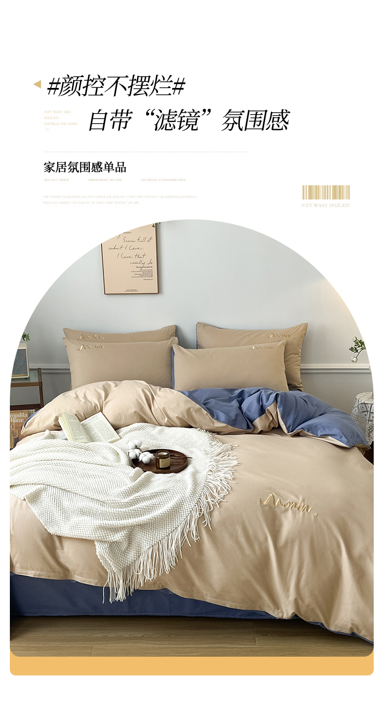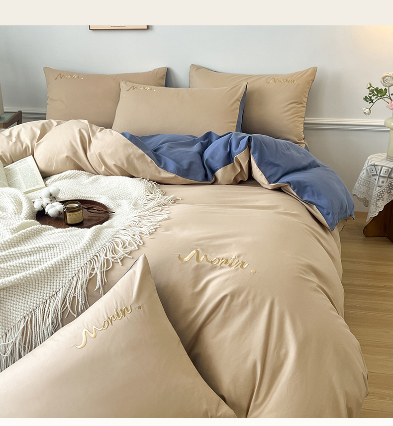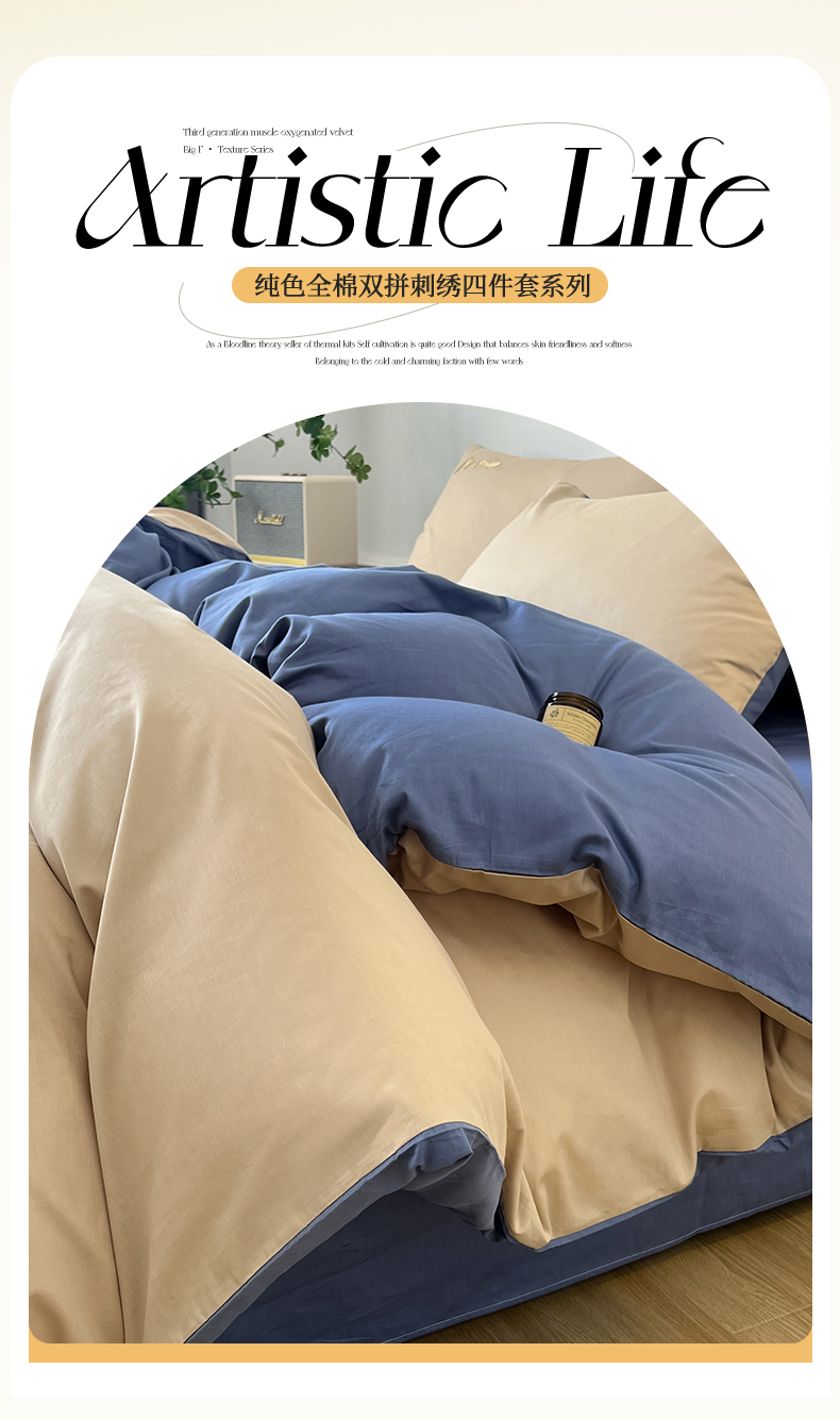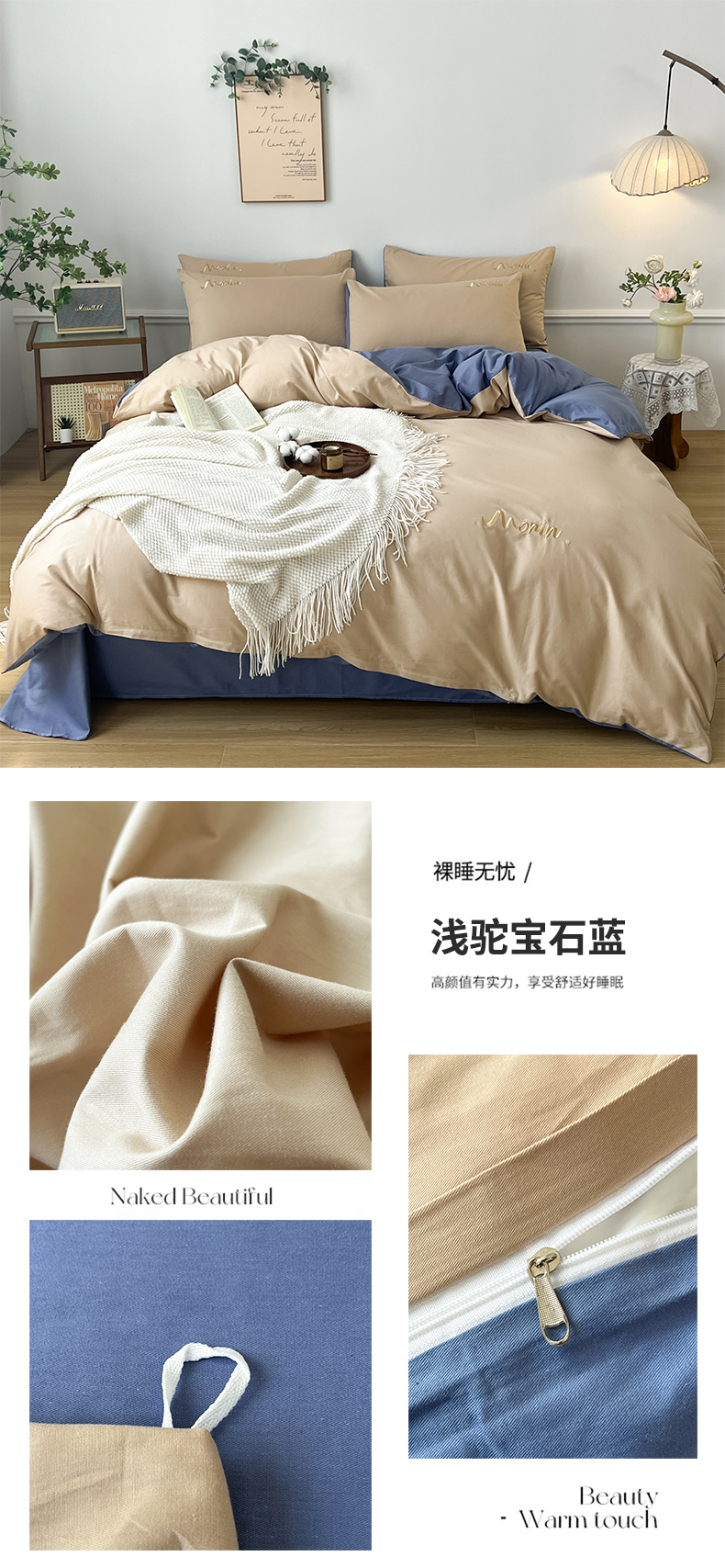 多品家纺 2024新款全棉纯色双拼刺绣四件套 浅驼宝石蓝