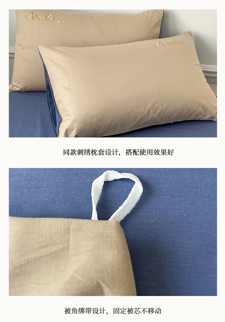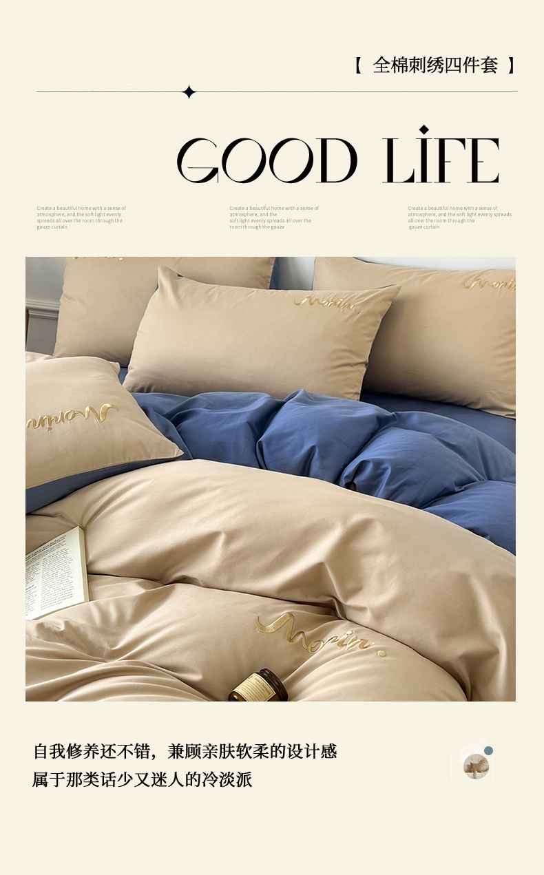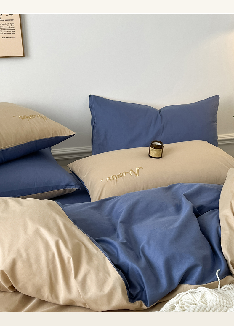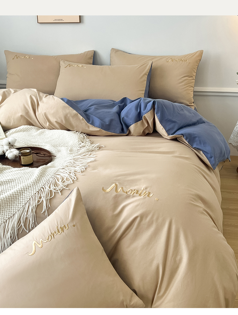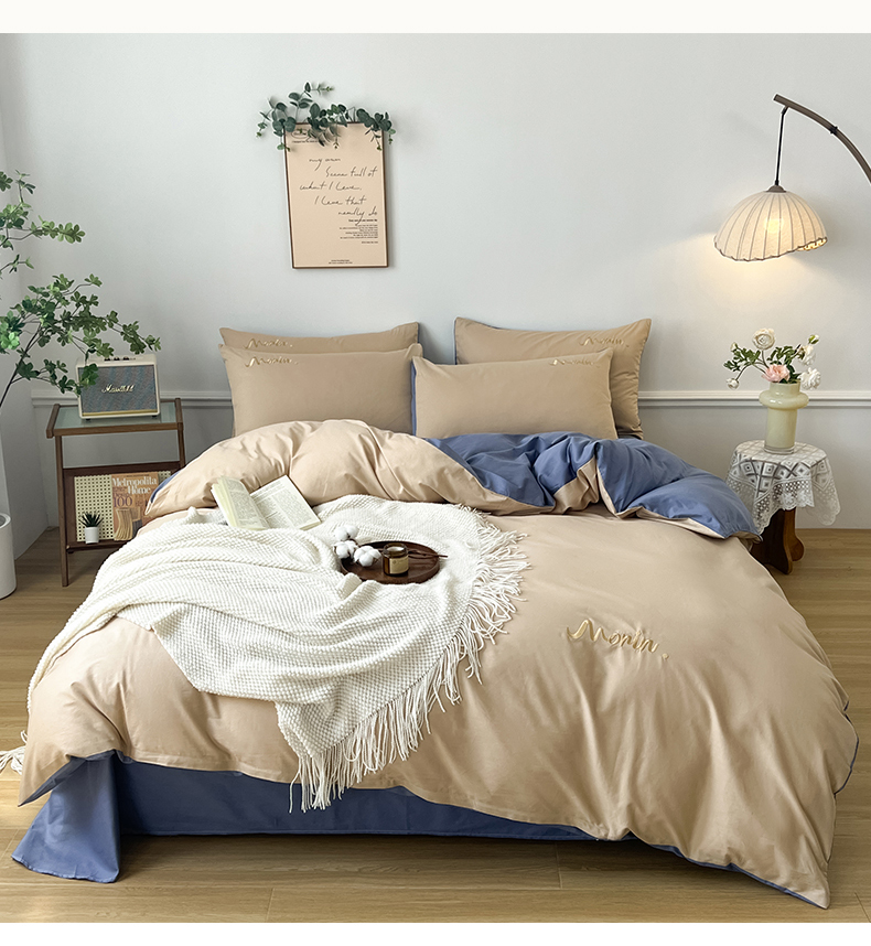 多品家纺 2024新款全棉纯色双拼刺绣四件套 浅驼宝石蓝