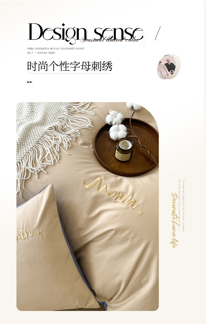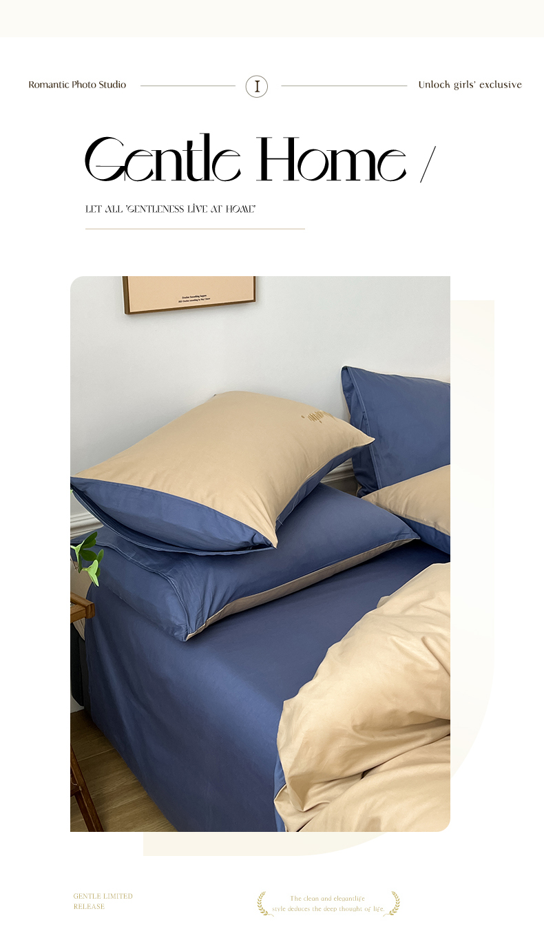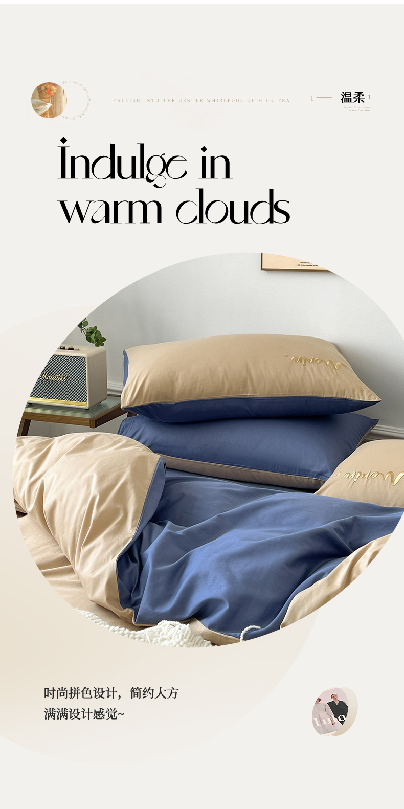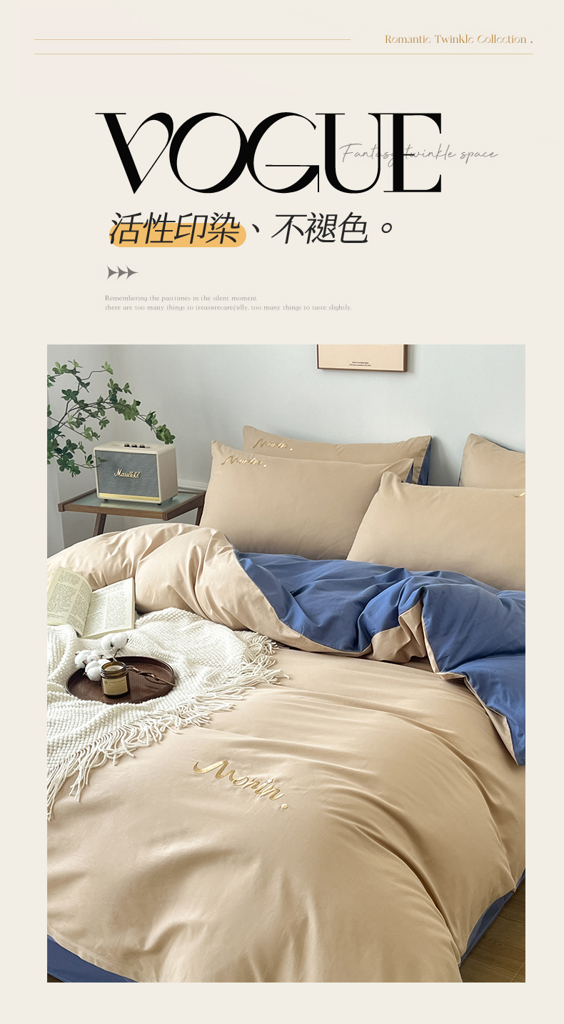 多品家纺 2024新款全棉纯色双拼刺绣四件套 浅驼宝石蓝