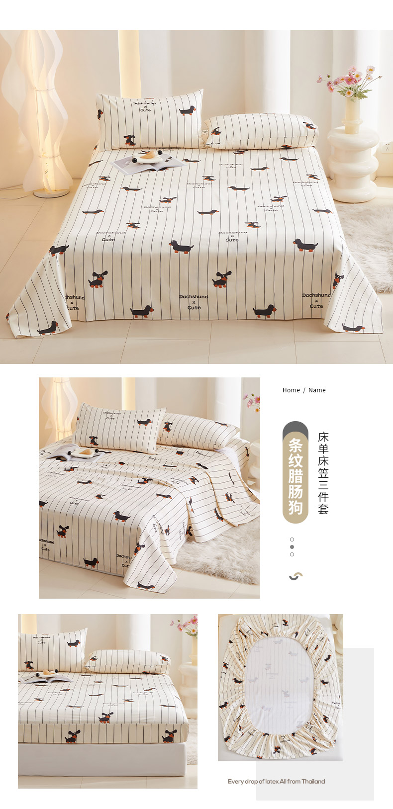 怡家居 2024新款A类老粗布枕套床单床笠单品组合三件套 条纹腊肠狗