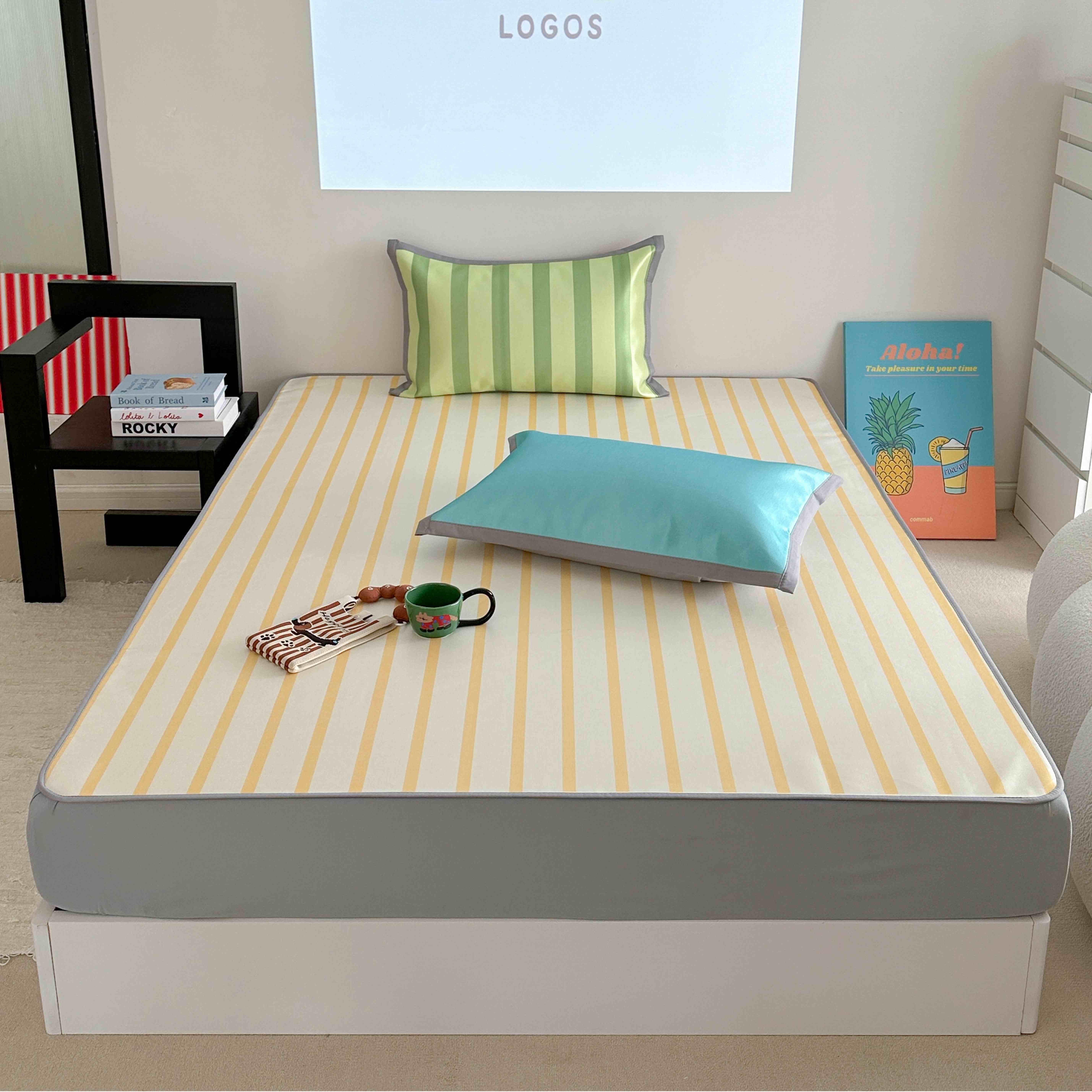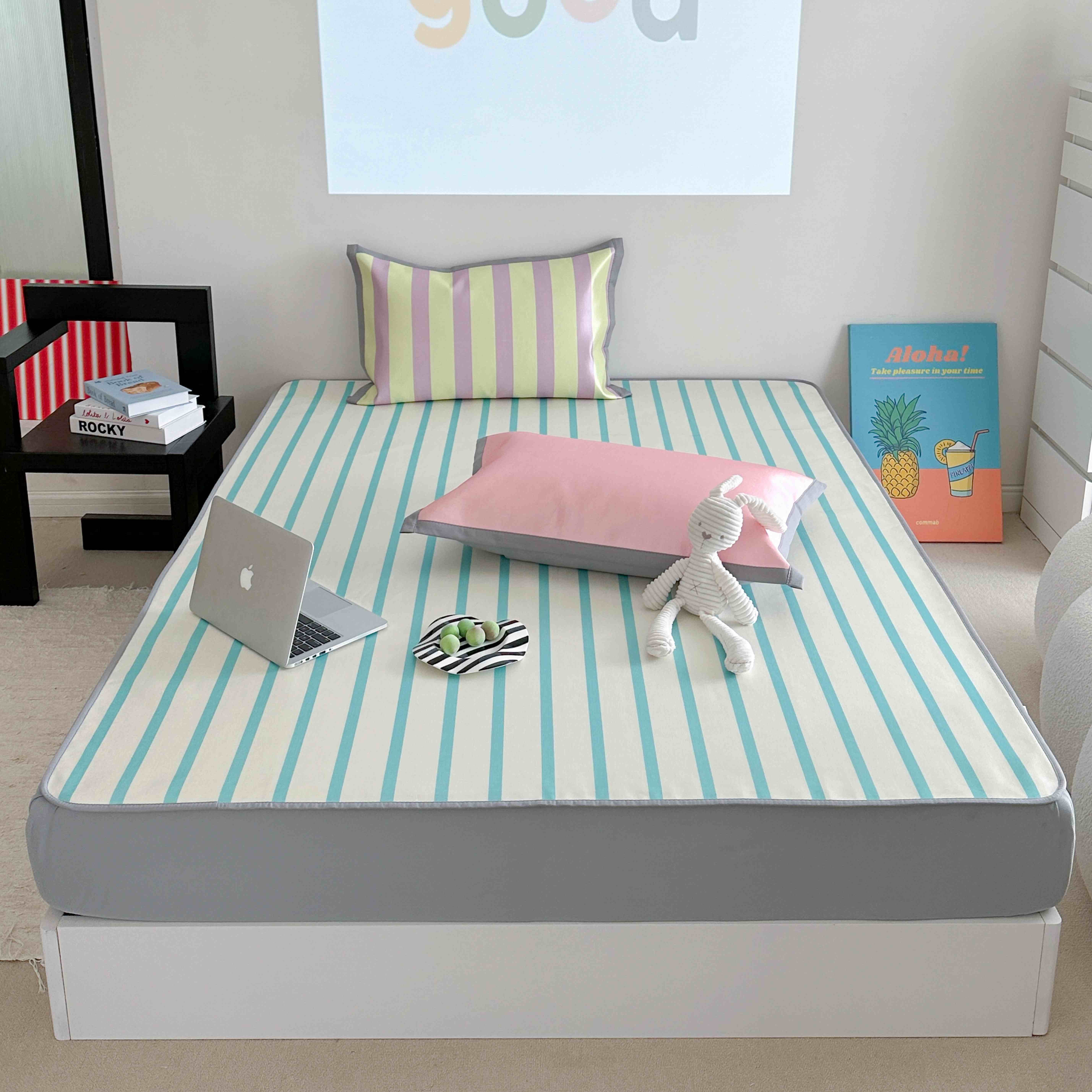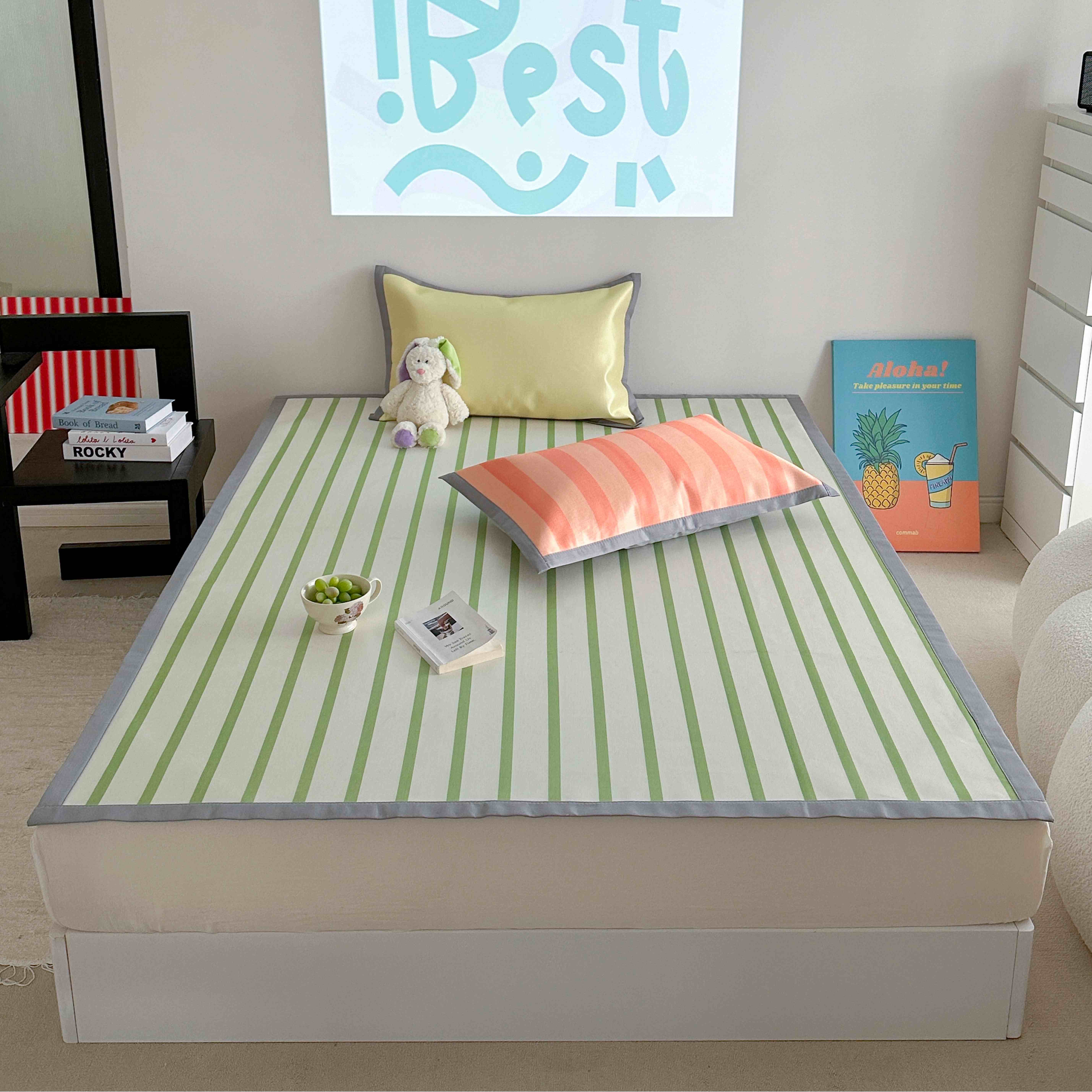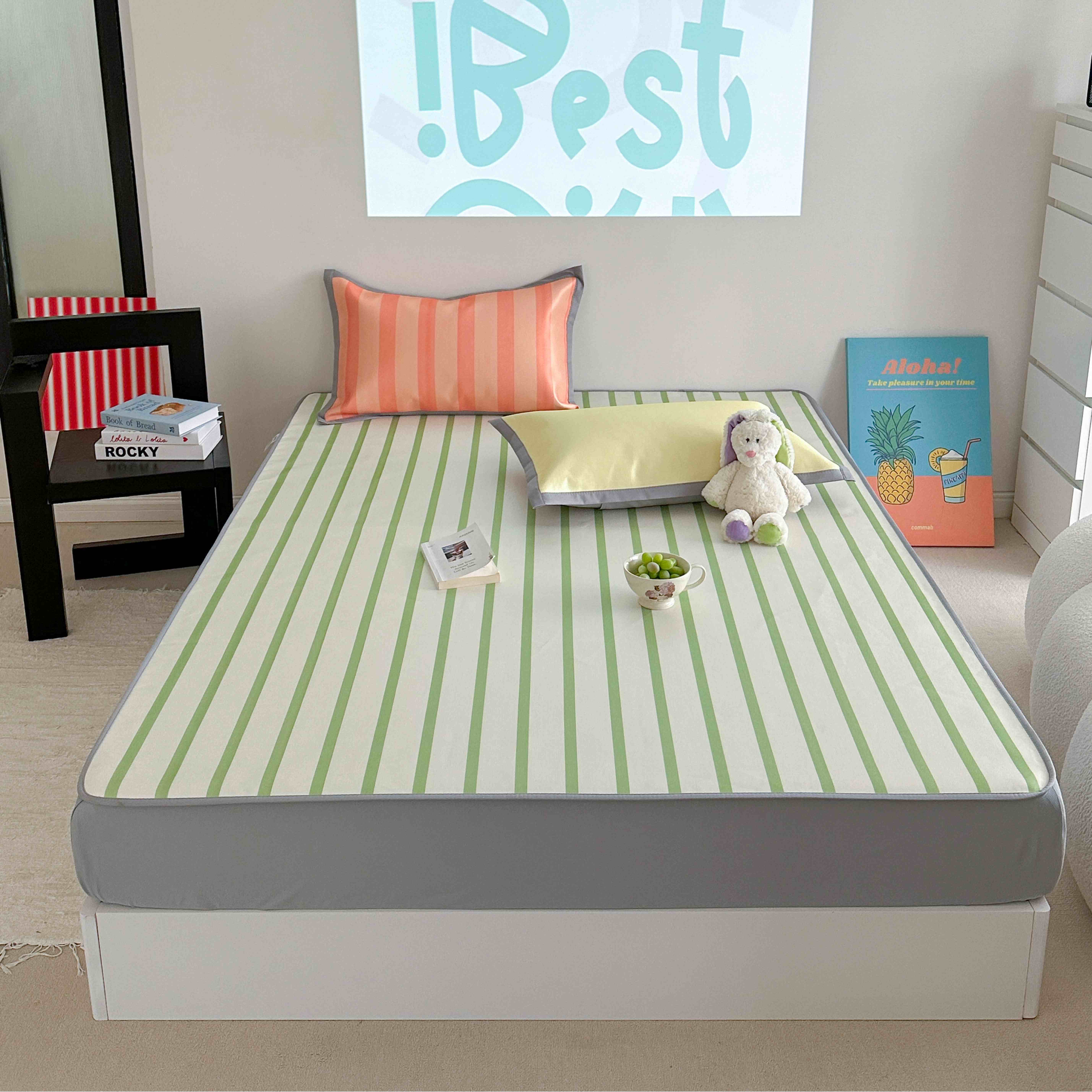 柚子YOUTH 2024新款900D简约条纹拼色冰丝席 绿条三拼-床笠款
