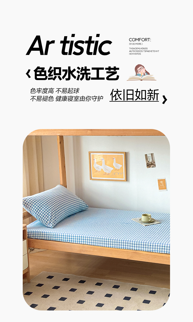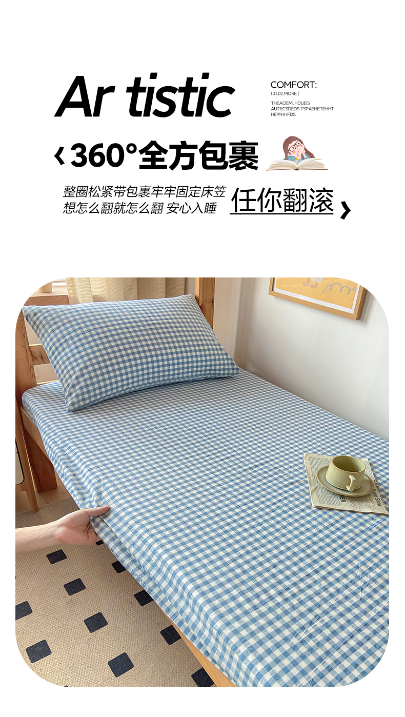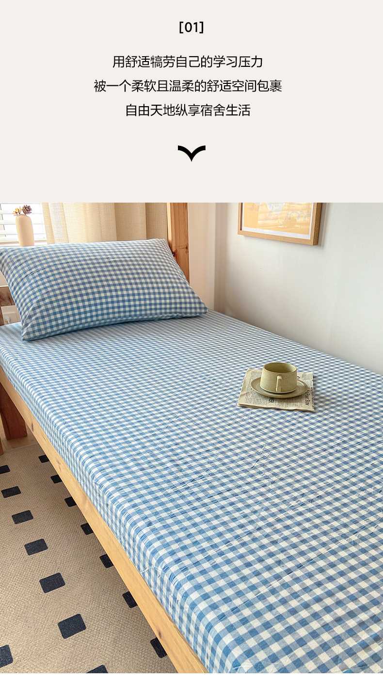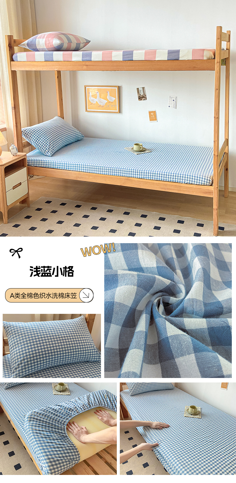 • 91家纺网 家纺一手货源 找家纺 卡伦家纺 2025新款全棉色织水洗棉单层宿舍学生床笠 浅蓝小格