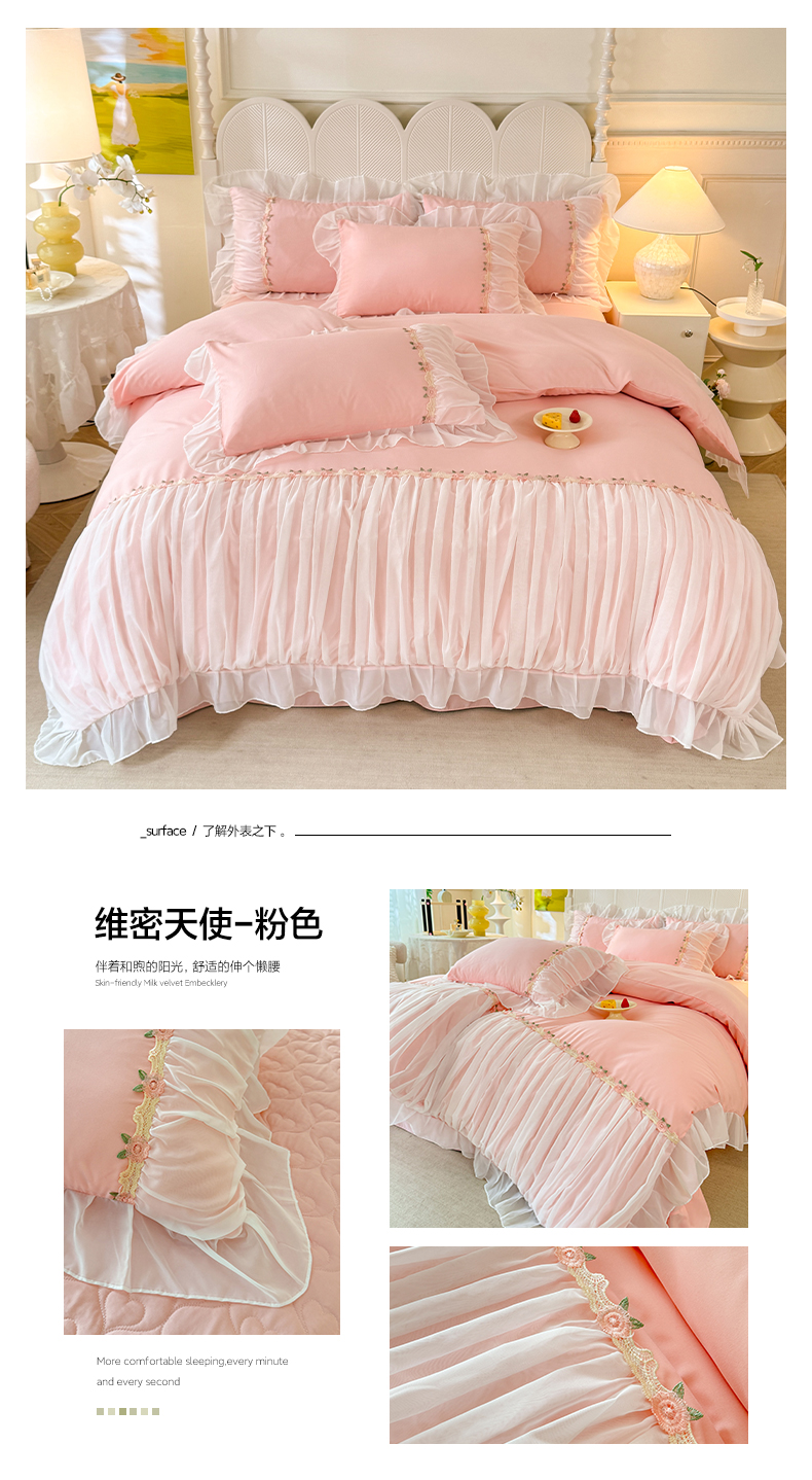 当前位置: 91家纺网 > 商品网购 > 床品套件 > 四件套 > 其它四件套 > 逸尚阁 2024新款水洗磨毛蕾丝拼接四件套--维密天使系列 维密天使-粉色