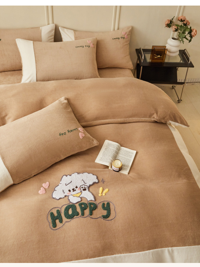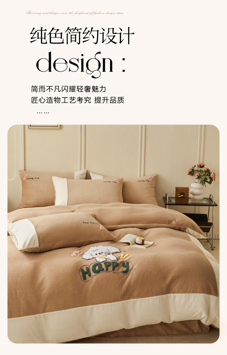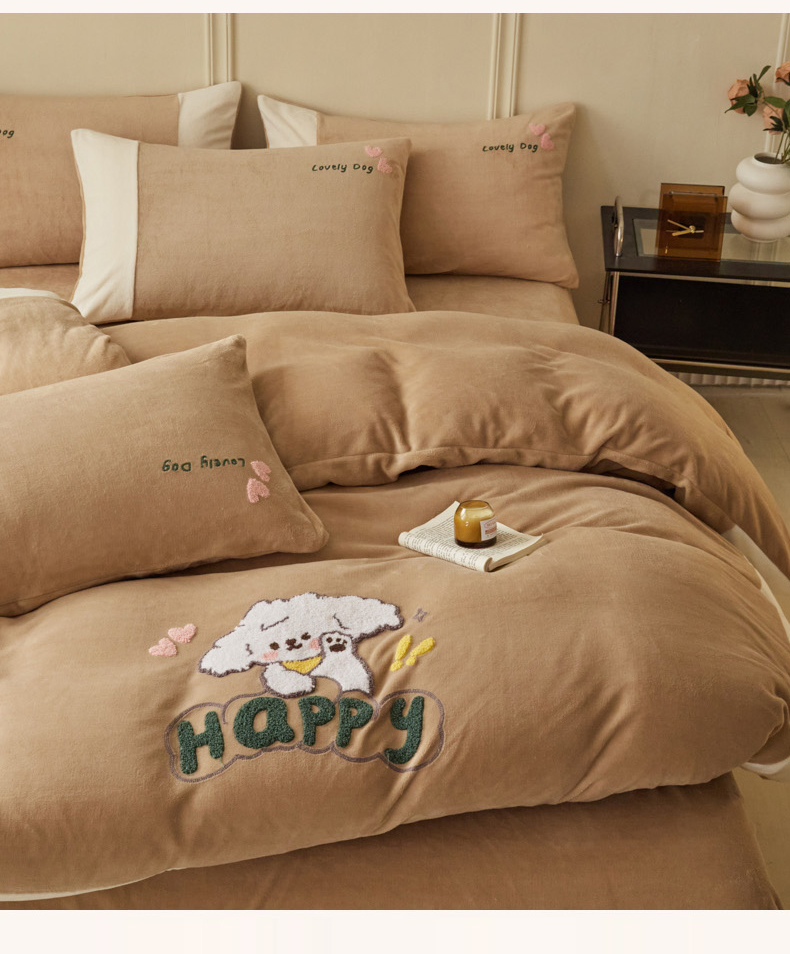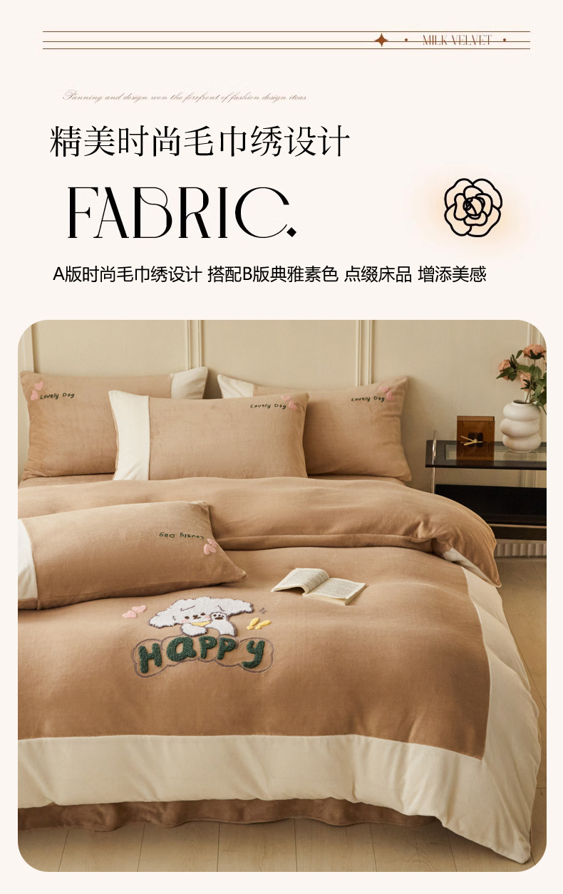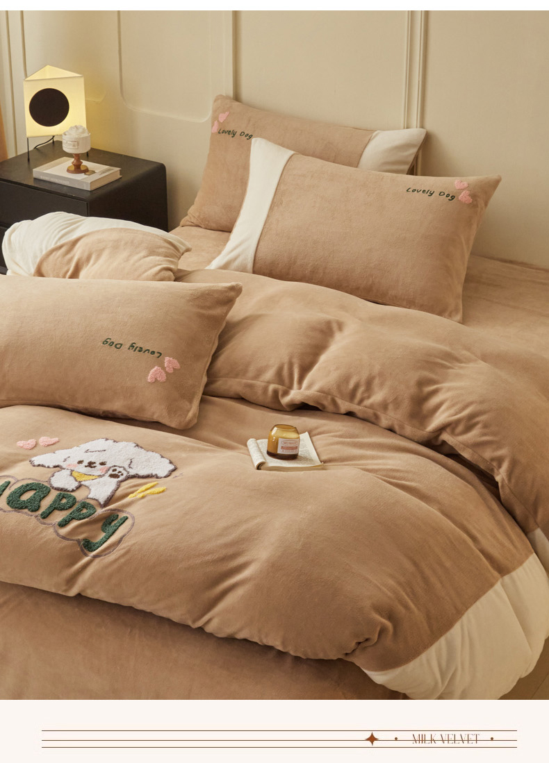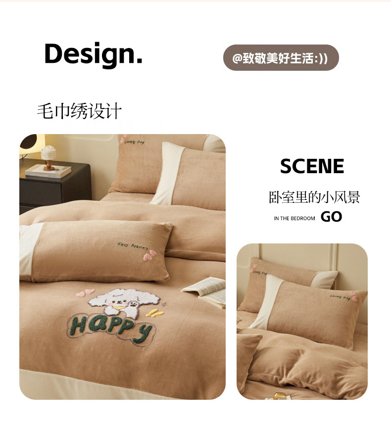 商品名称:恋佳居 2025新款高克重全工艺牛奶绒毛巾绣四件套 嗨皮狗咖色