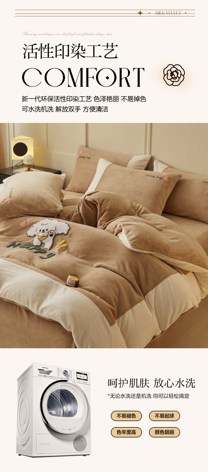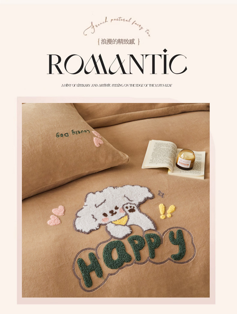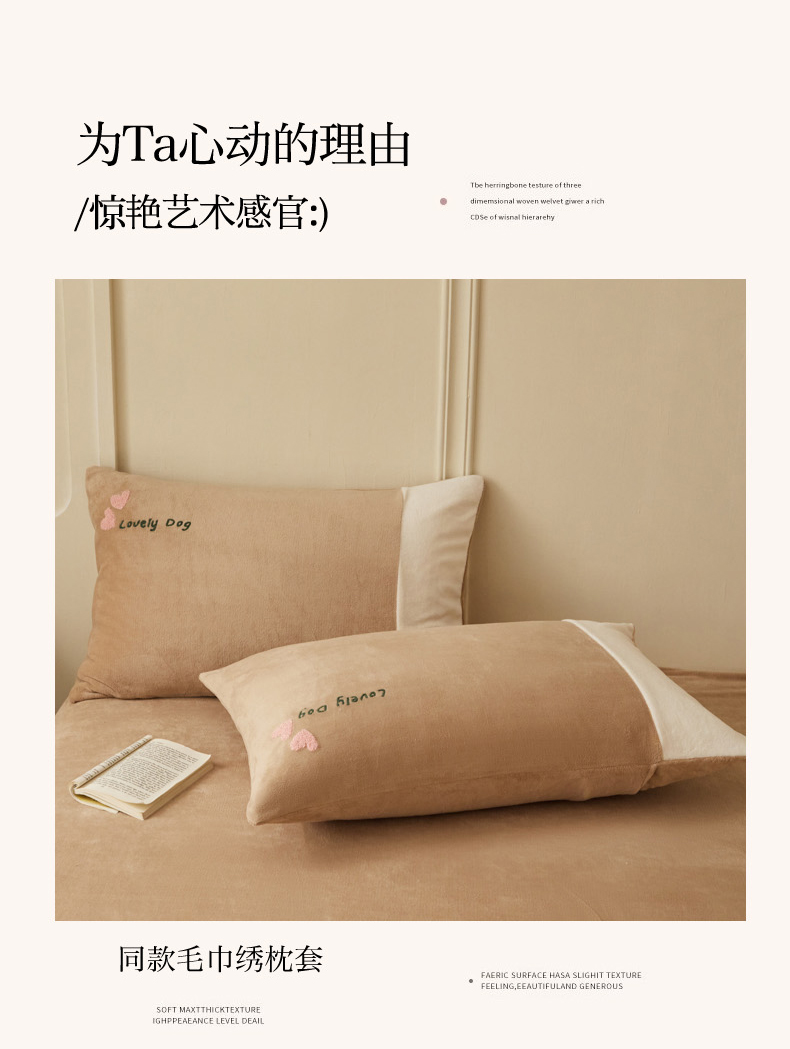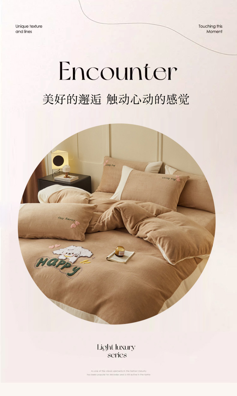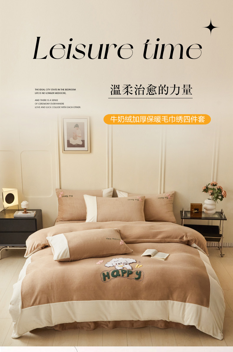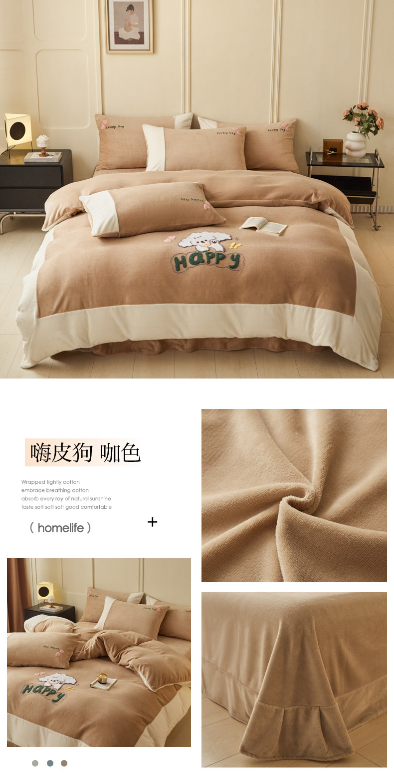 商品名称:恋佳居 2025新款高克重全工艺牛奶绒毛巾绣四件套 嗨皮狗咖色