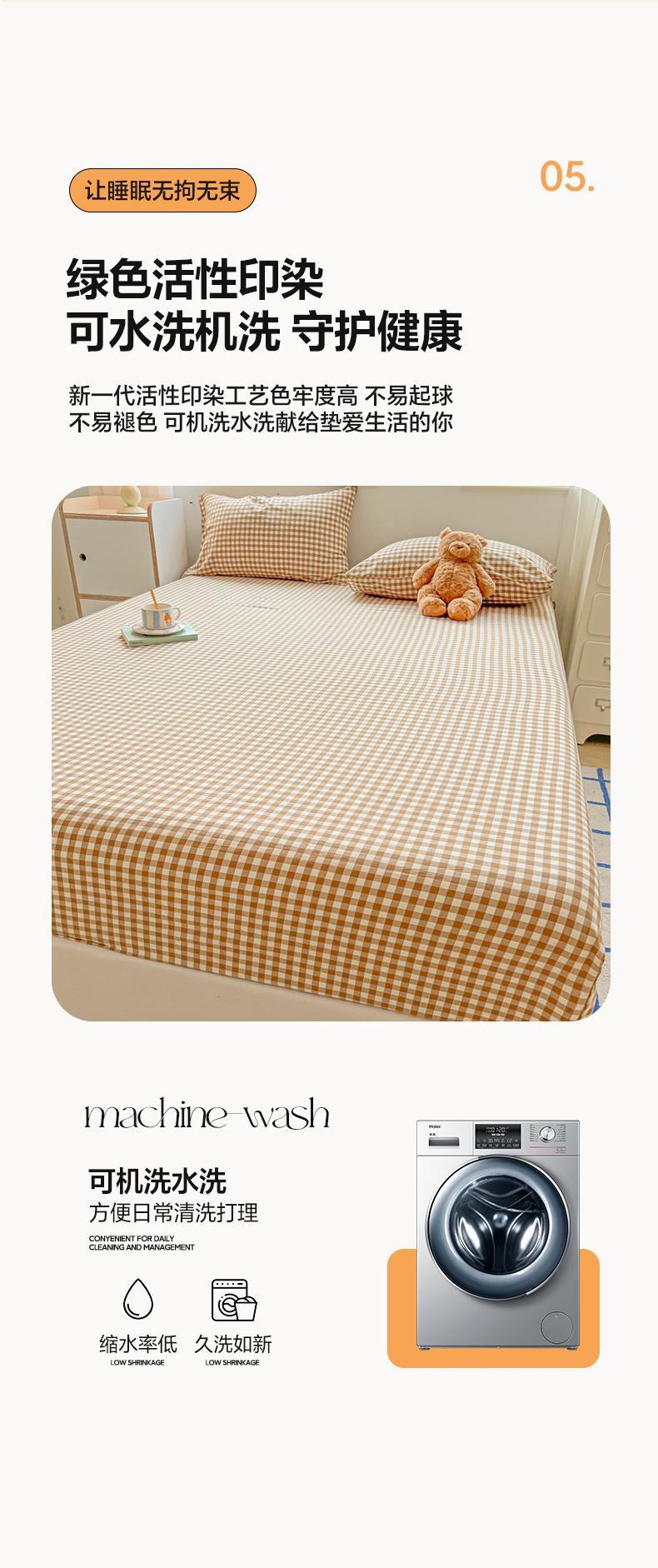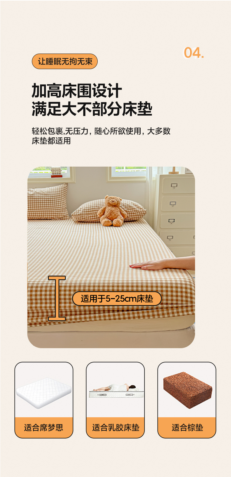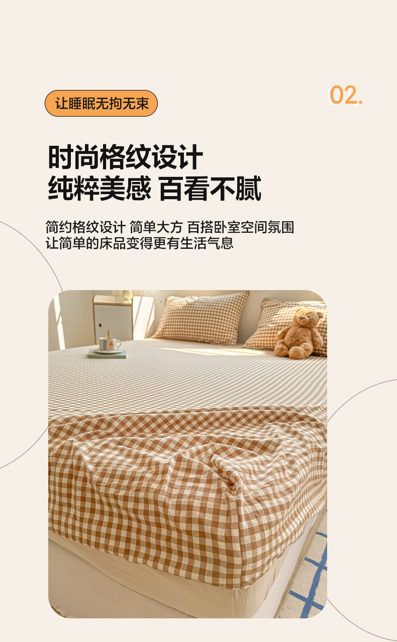 韩巢家纺 2024新款A类纯色良品格子水洗棉床笠单件全包围防滑床单床罩保护套 A类杏色格-床笠
