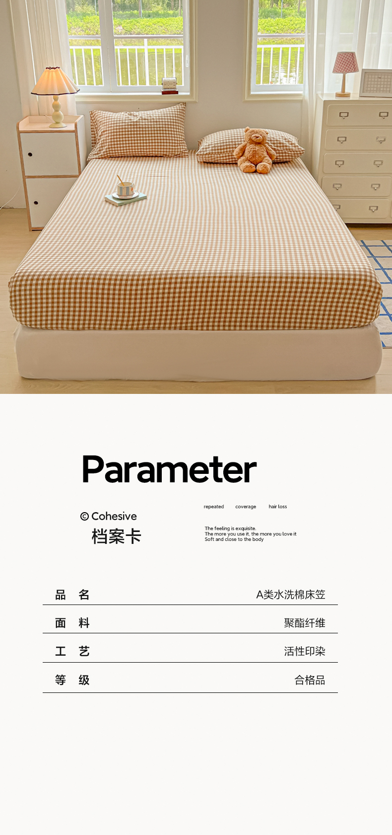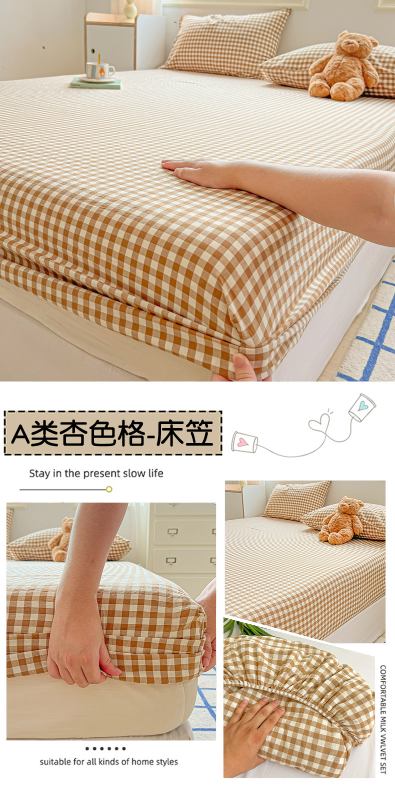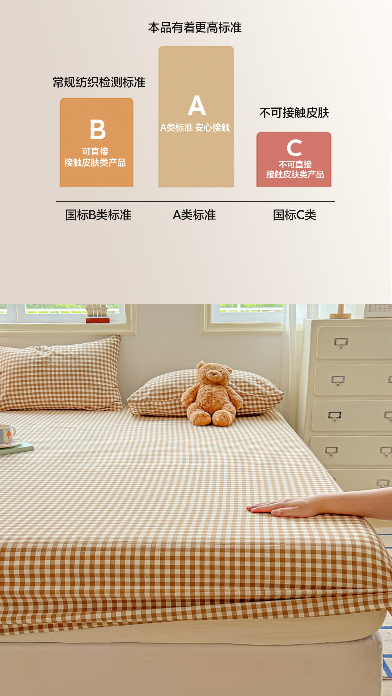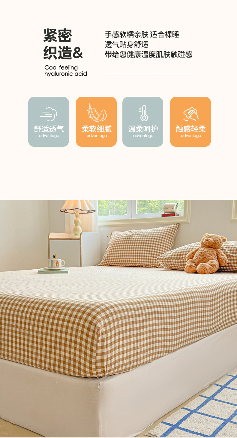 • 91家纺网 家纺一手货源 找家纺 韩巢家纺 2024新款A类纯色良品格子水洗棉床笠单件全包围防滑床单床罩保护套 A类杏色格-床笠