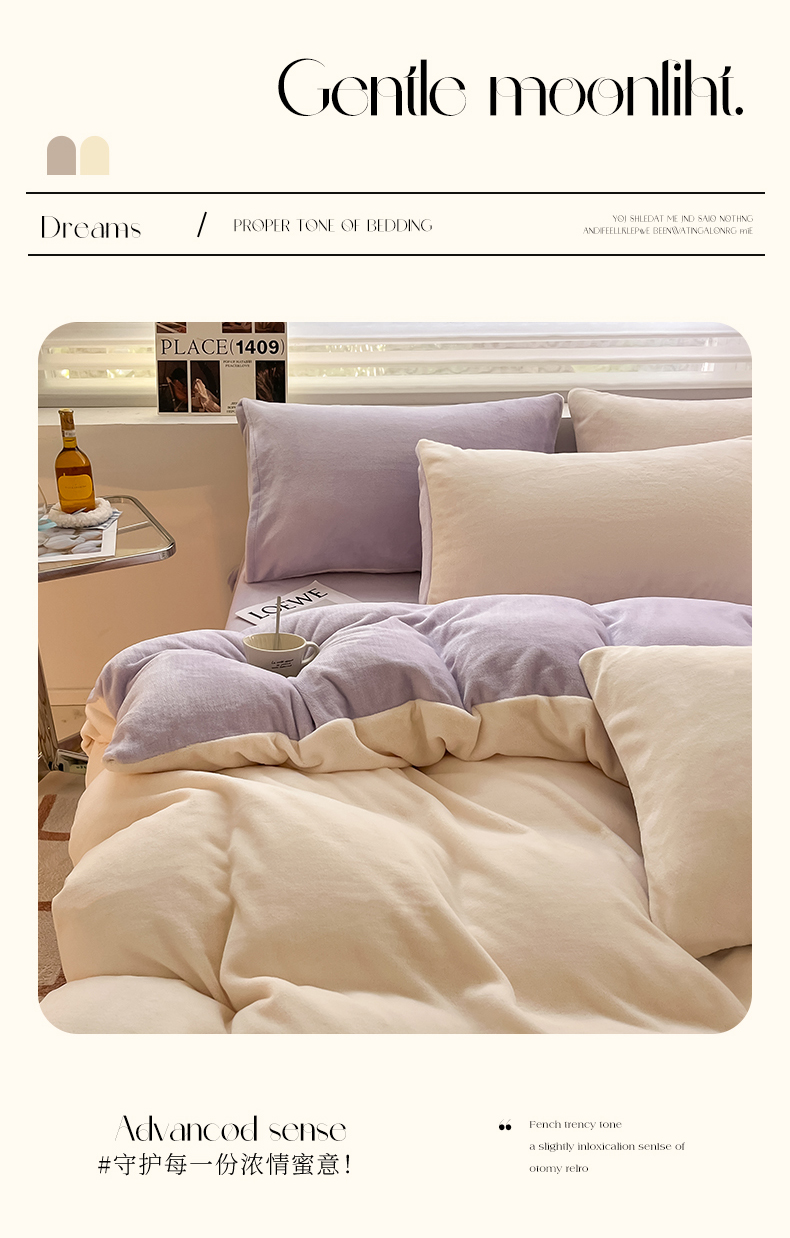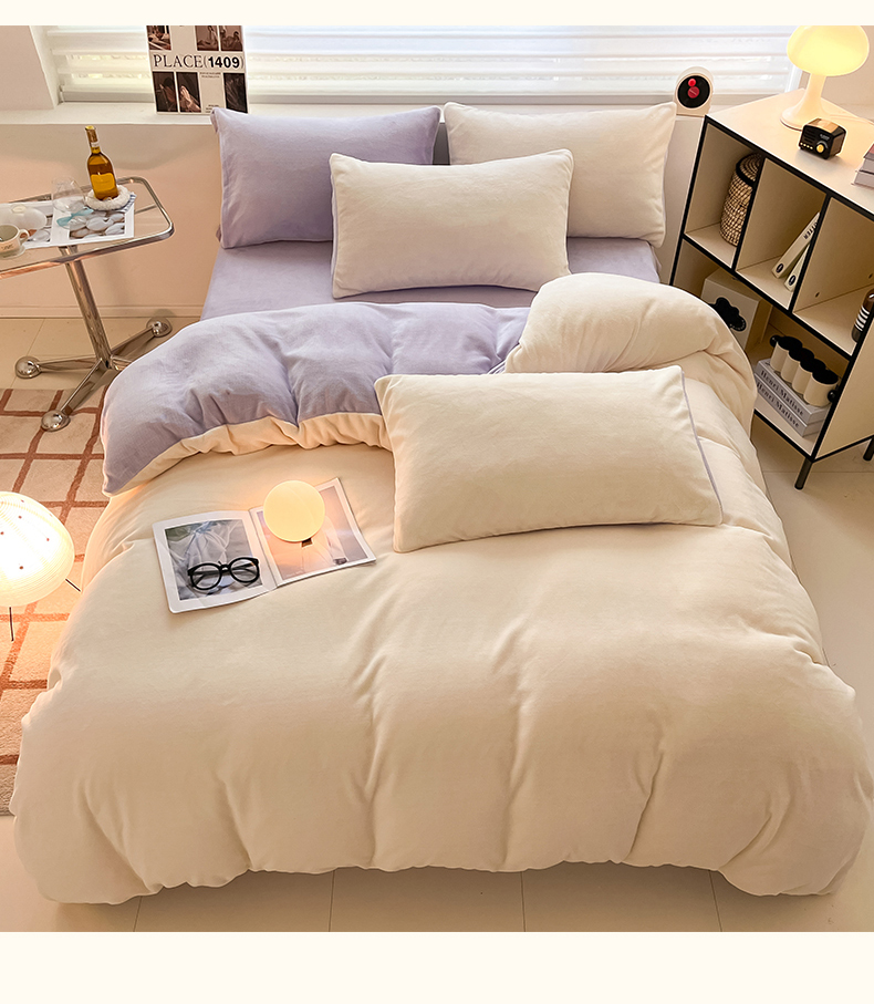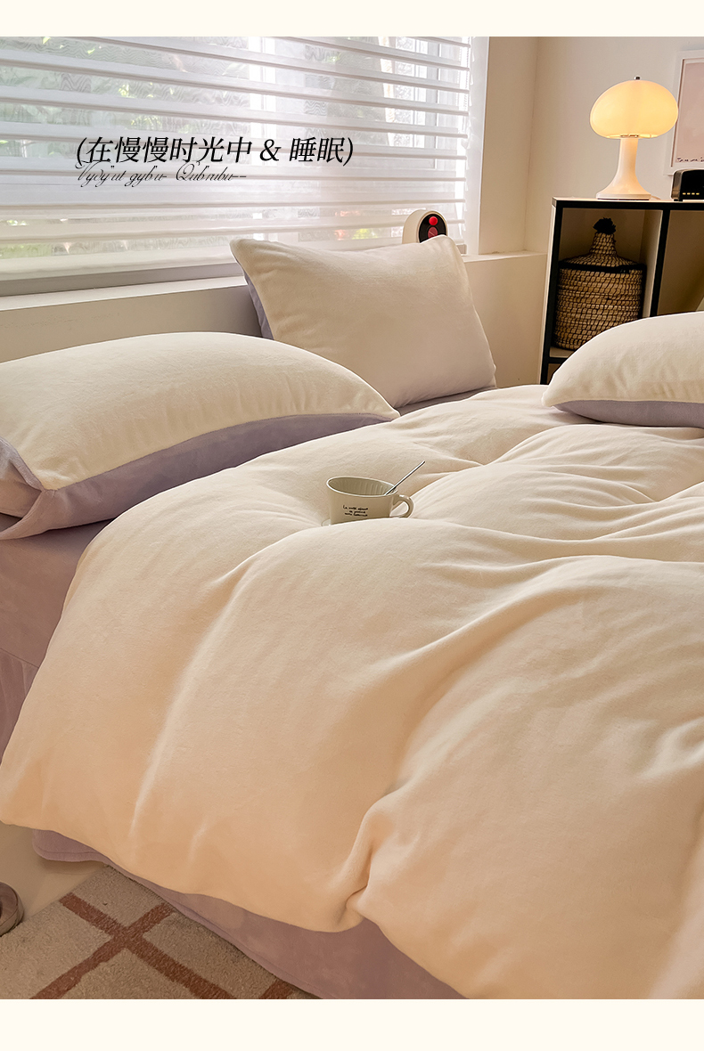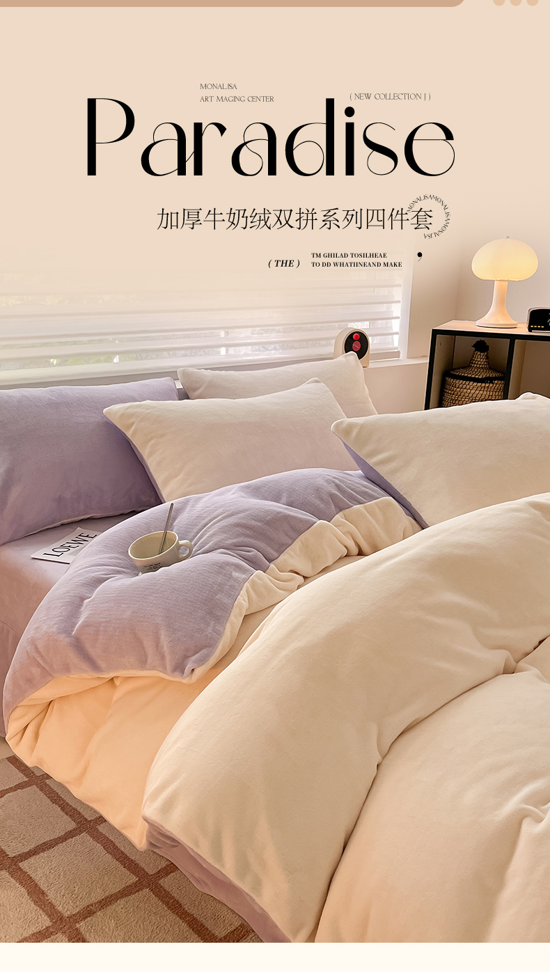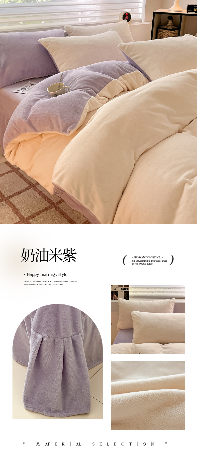 商品名称:绘萱 2025新款高克重纯色双拼牛奶绒四件套 奶油米紫