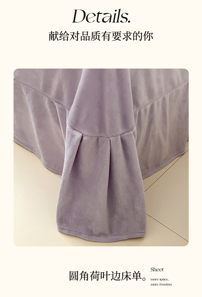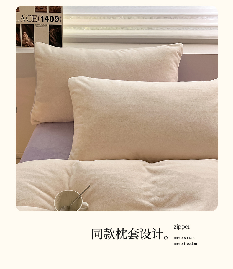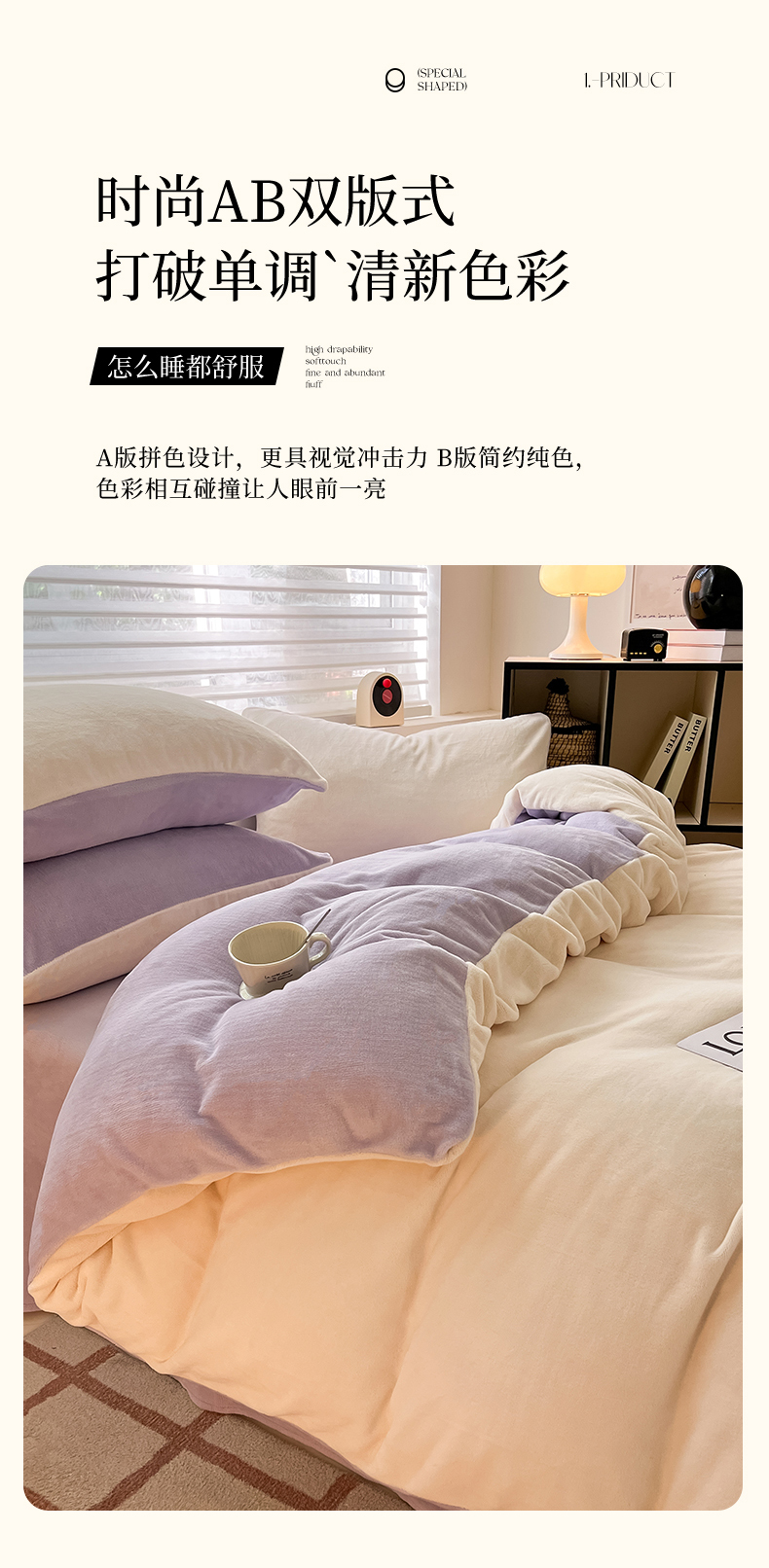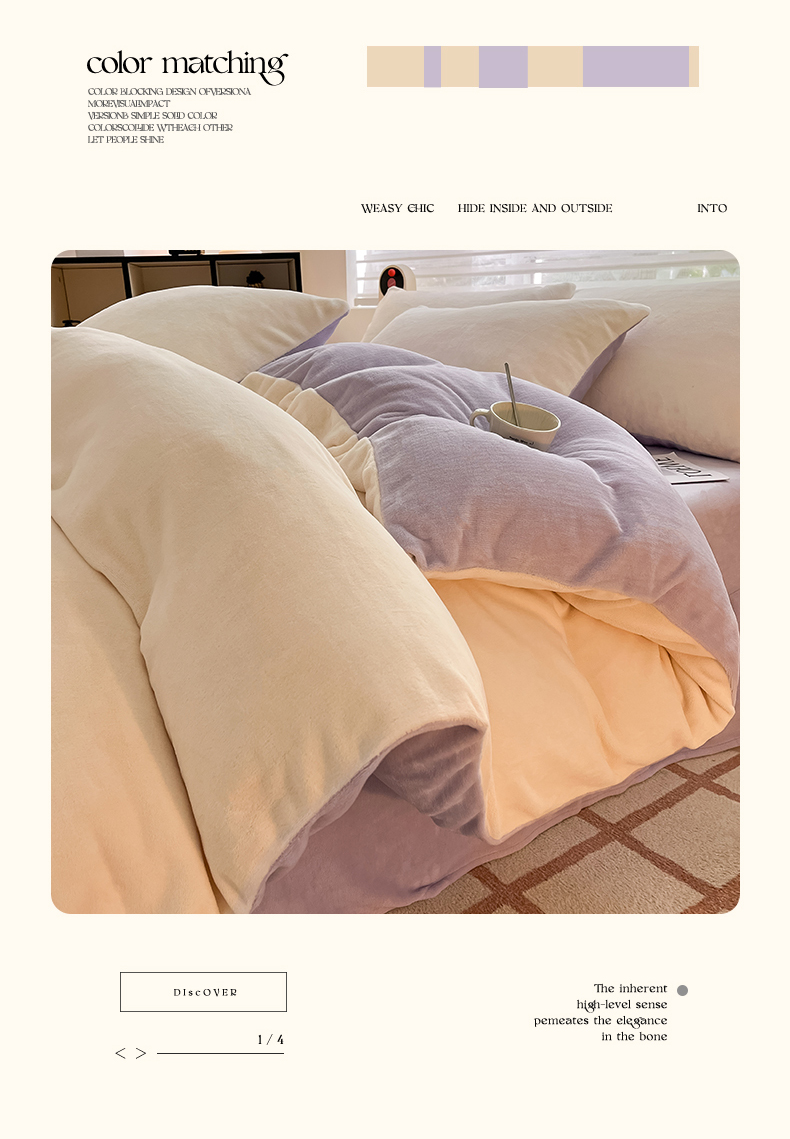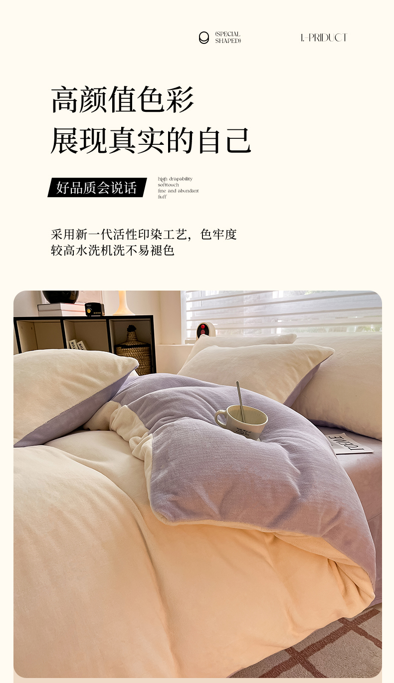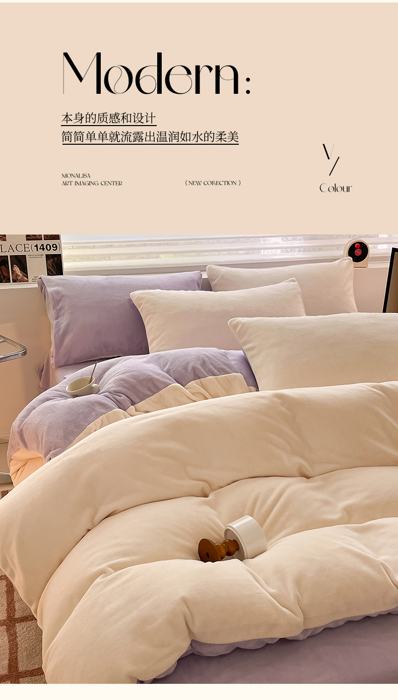 商品名称:绘萱 2025新款高克重纯色双拼牛奶绒四件套 奶油米紫