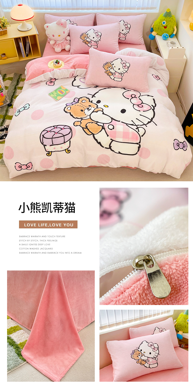 商品名称:米帛家纺 2024新款正版授权大版三丽鸥牛奶绒四件套 小熊凯蒂猫