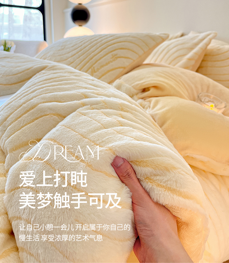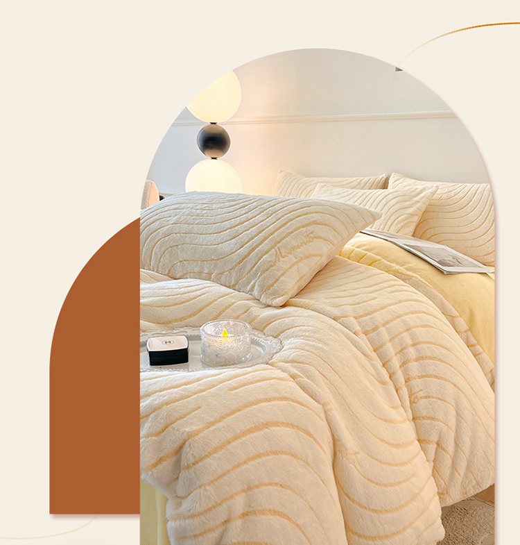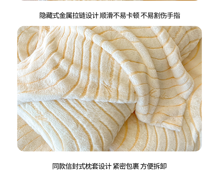 商品名称:2024新款高克重着色烂花兔毛绒牛奶绒四件套宝宝绒婴儿绒秋冬加厚法莱绒法兰绒珊瑚绒三件套 波浪-芝士黄