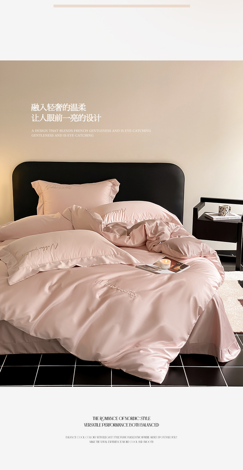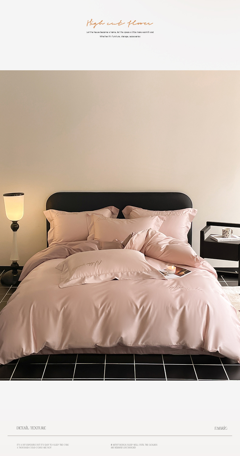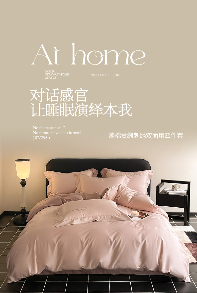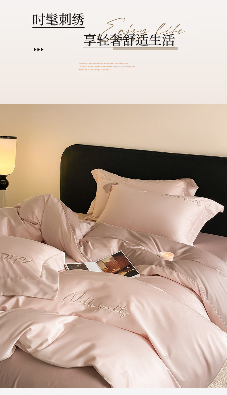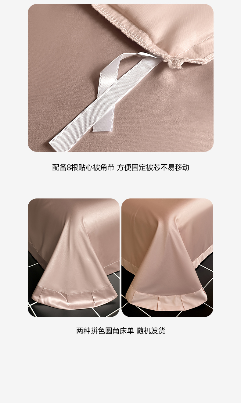 商品名称:由丽家纺 2025新款贡缎纯色刺绣双拼隐形双面用四件套 蜜汁粉+米驼