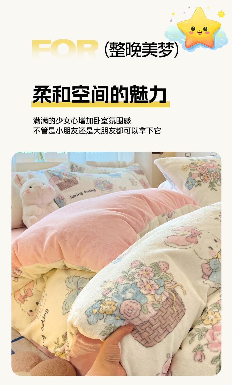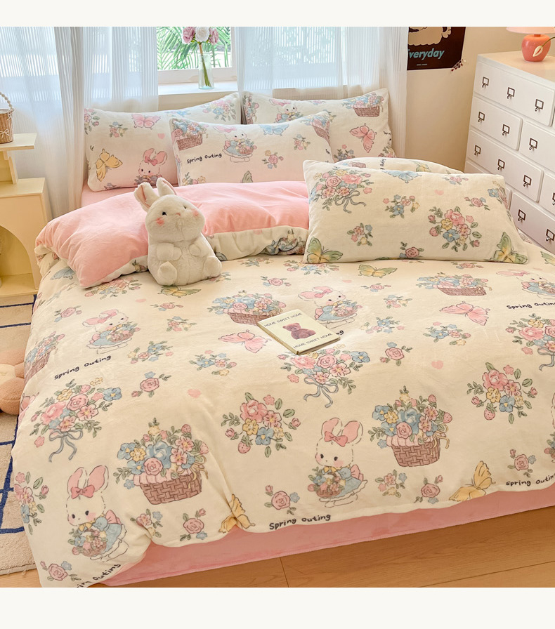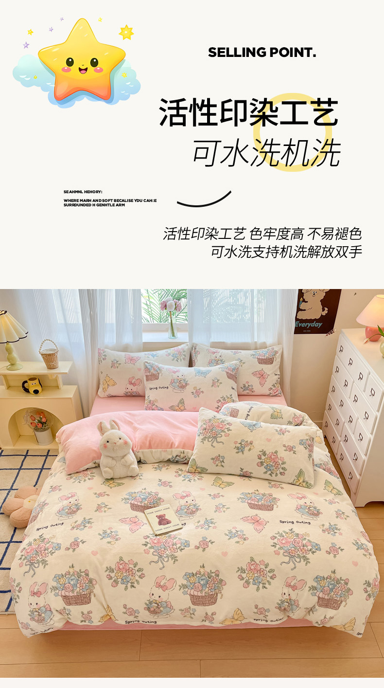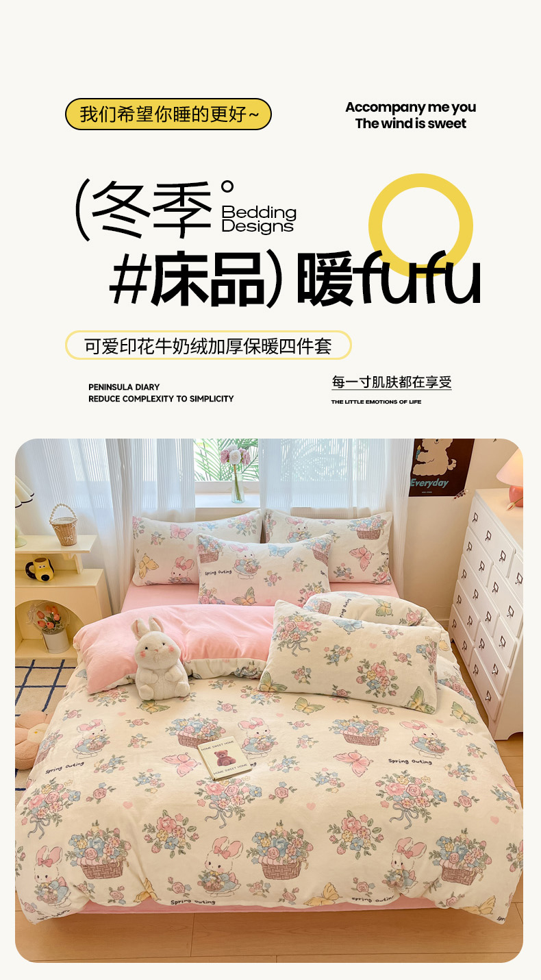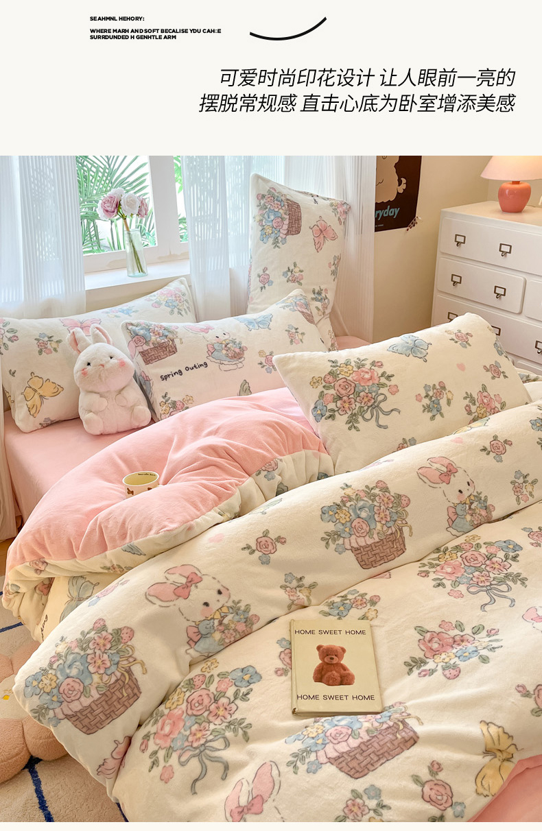 当前位置: 91家纺网 > 商品网购 > 床品套件 > 四件套 > 牛奶绒四件套 > 慕澄家纺 2024新款小清新可爱印花牛奶绒加厚保暖四件套 花篮兔