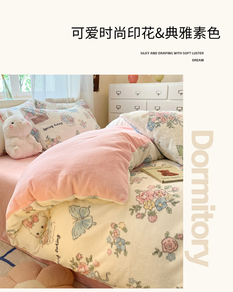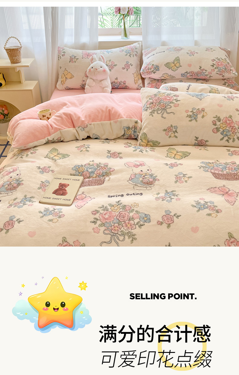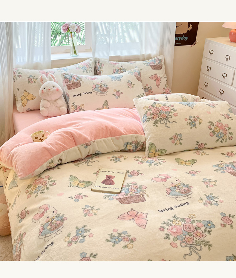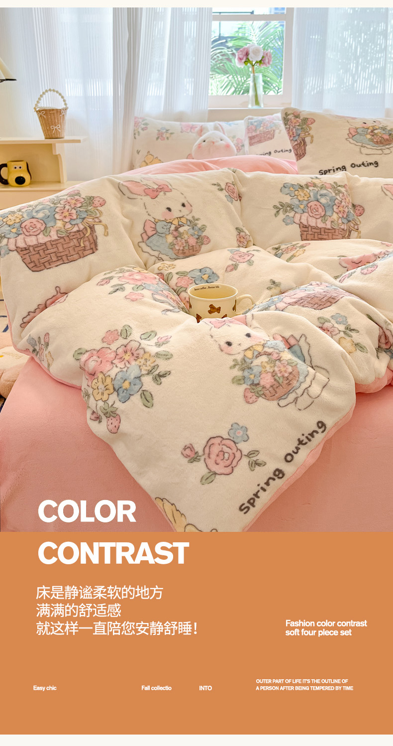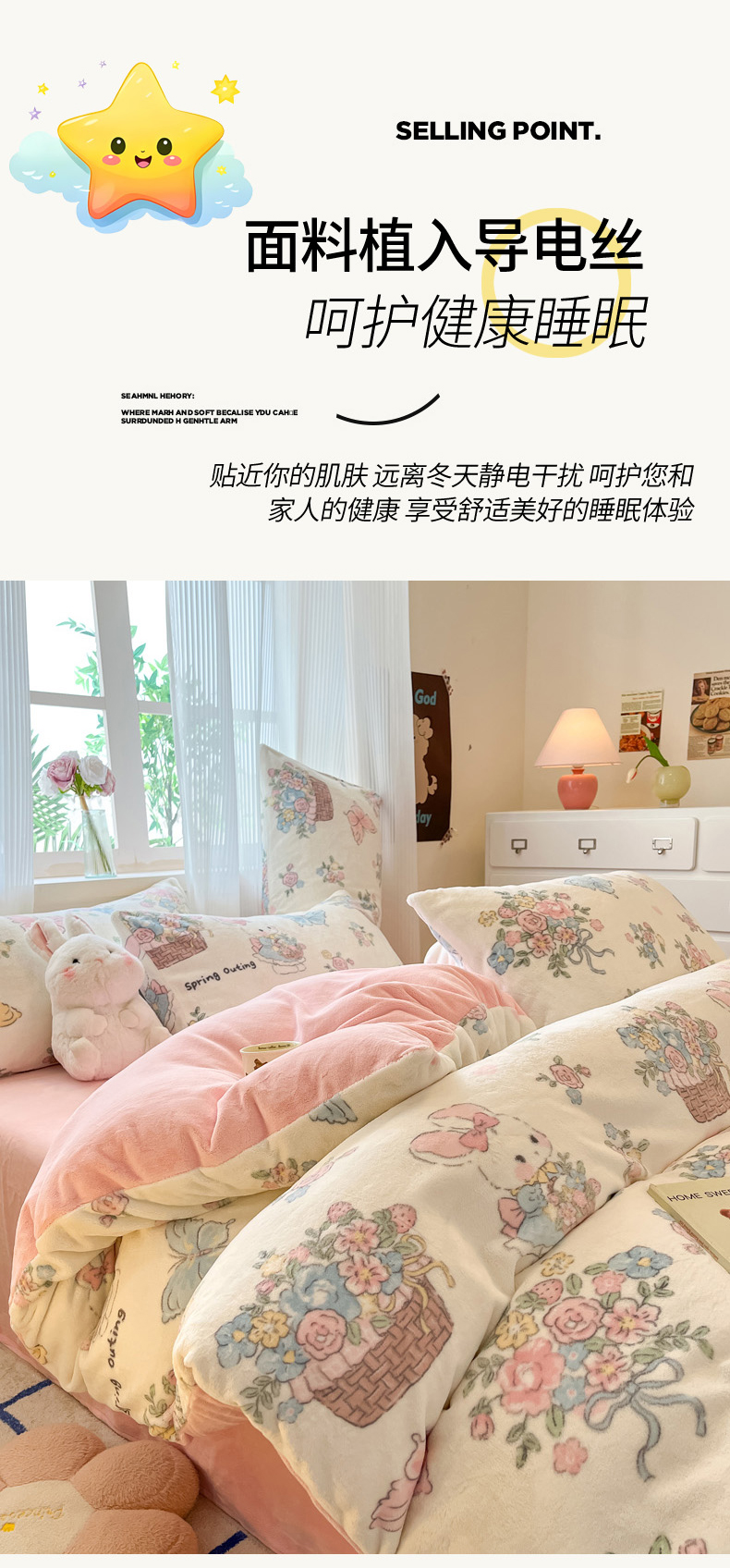 当前位置: 91家纺网 > 商品网购 > 床品套件 > 四件套 > 牛奶绒四件套 > 慕澄家纺 2024新款小清新可爱印花牛奶绒加厚保暖四件套 花篮兔
