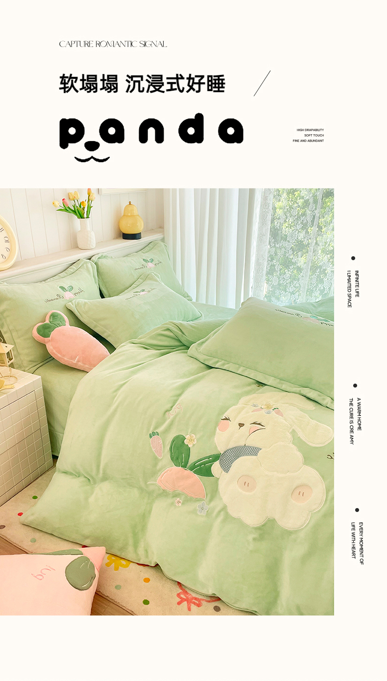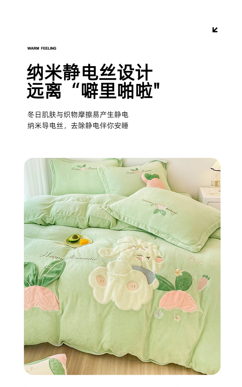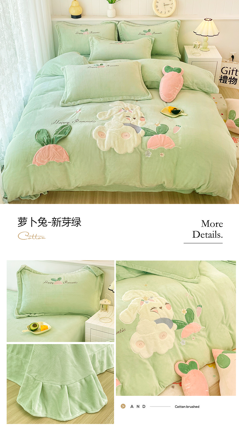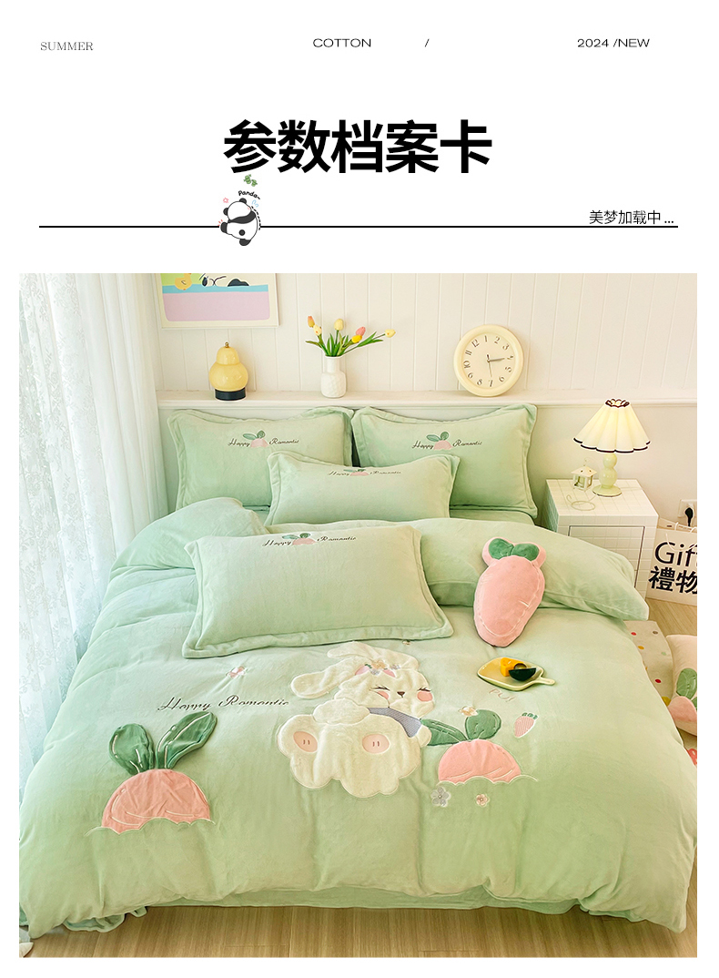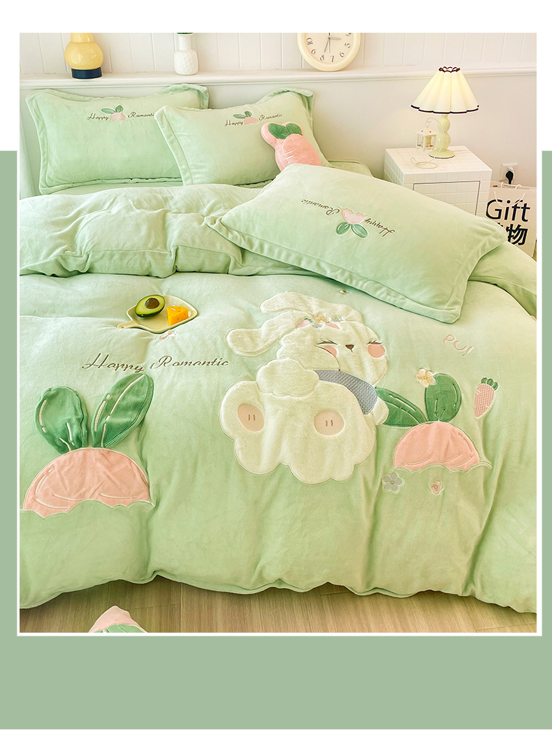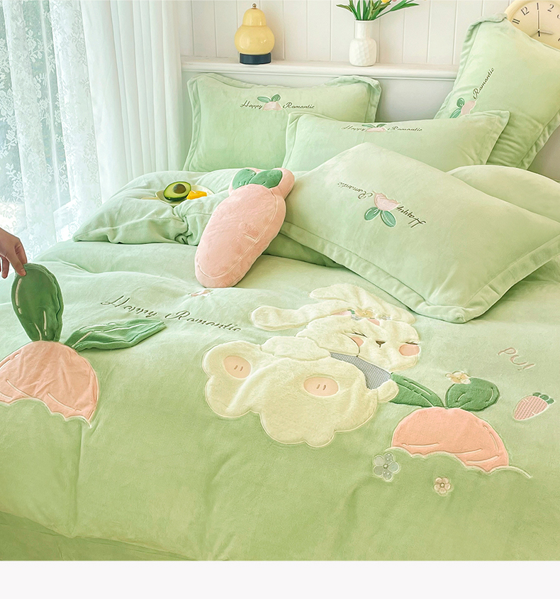 商品名称:金绣美居 2025新款牛奶绒兔毛绒贴布绣花保暖四件套-萝卜兔 新芽绿