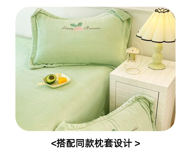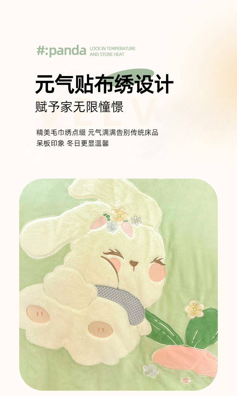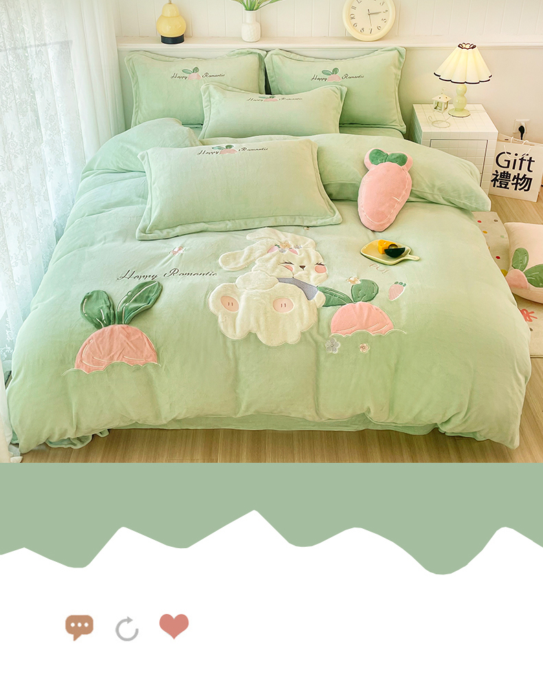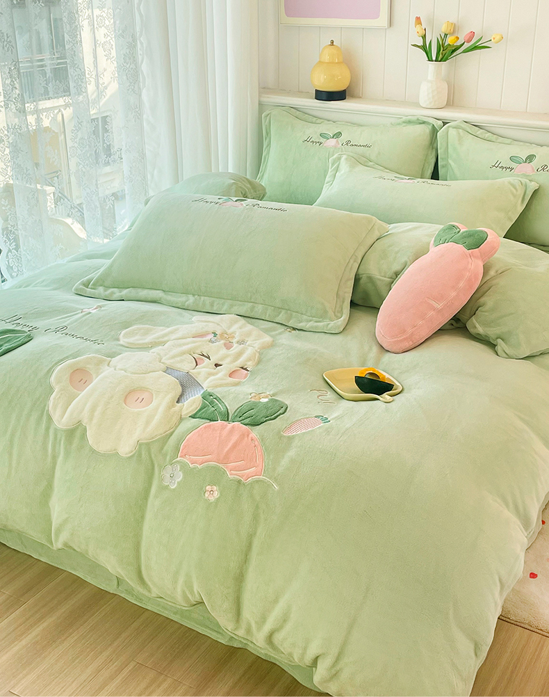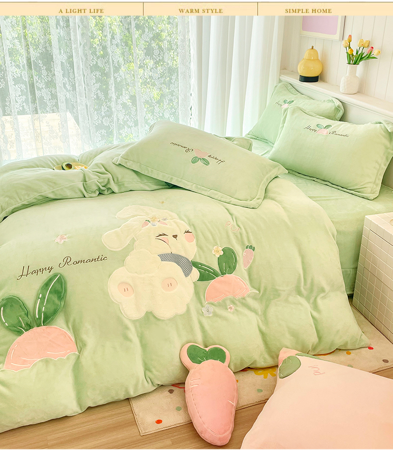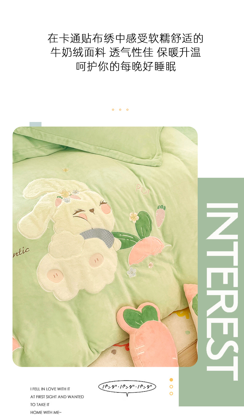 商品名称:金绣美居 2025新款牛奶绒兔毛绒贴布绣花保暖四件套-萝卜兔 新芽绿