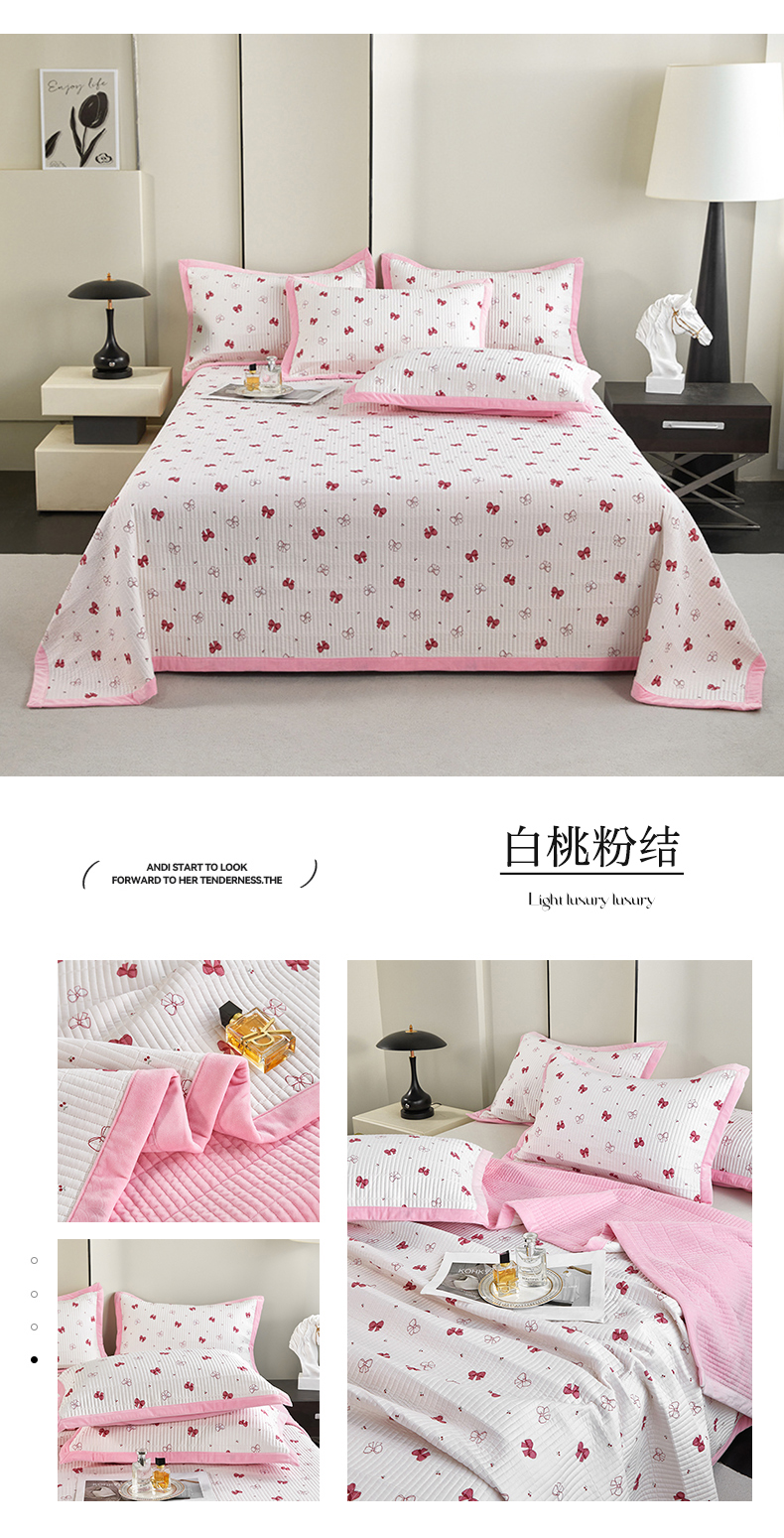 莎果家纺 2025秋冬一面天丝一面绒高温砂洗床盖三件套 白桃粉结