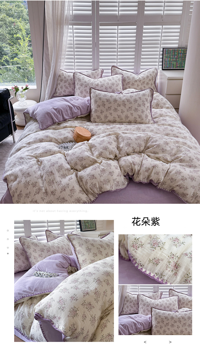 商品名称:眠屿家纺 2024新款全棉皱皱纱牛奶绒四件套 花朵紫