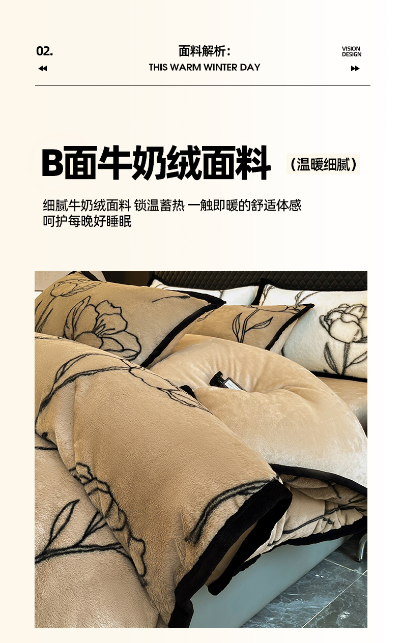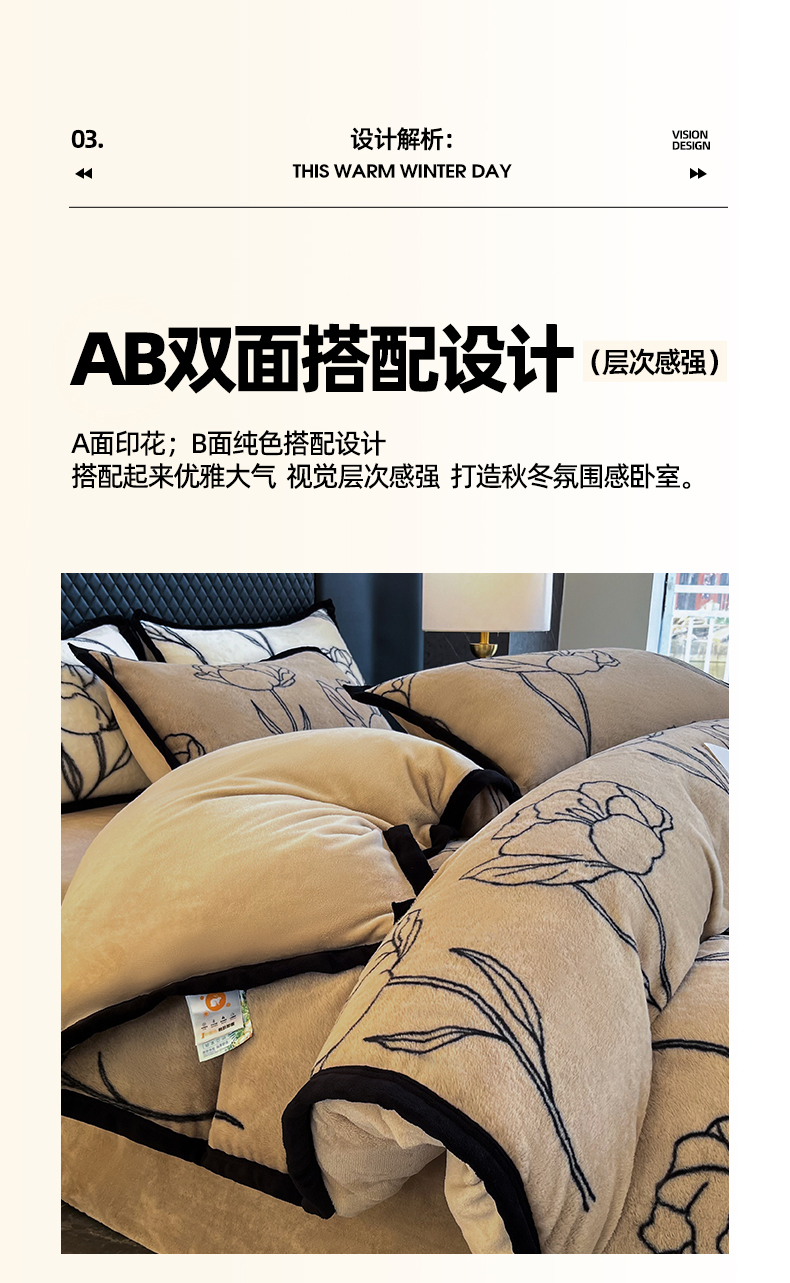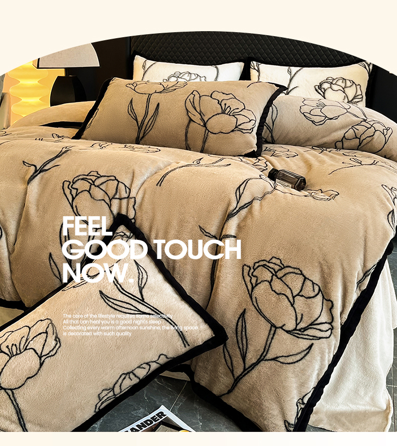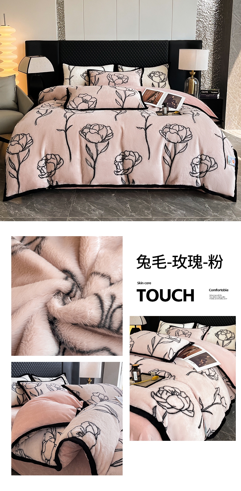 商品名称:多乐家纺 2024新款高克重加厚保暖轻奢印花兔毛绒宽包边四件套 兔毛-玫瑰-清新绿