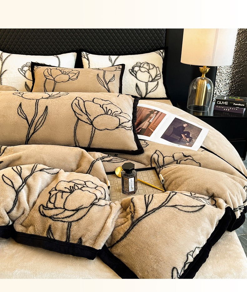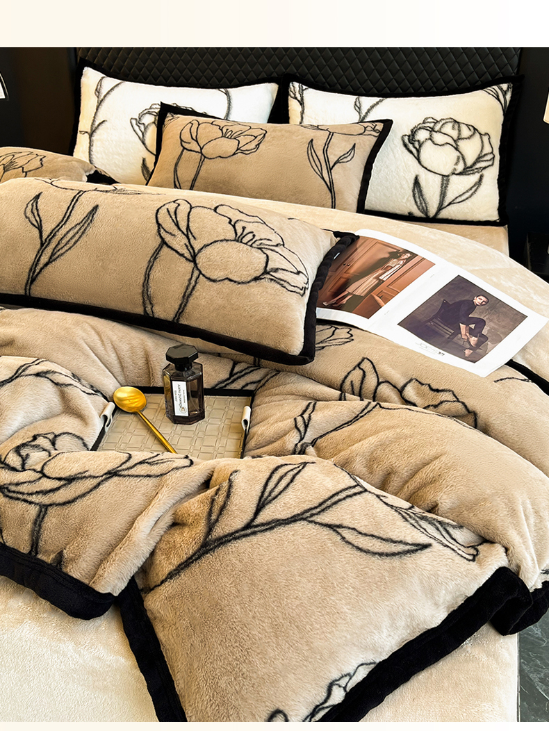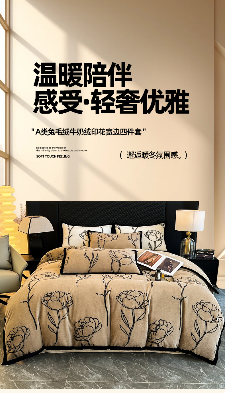 多乐家纺 2024新款高克重加厚保暖轻奢印花兔毛绒宽包边四件套 兔毛-玫瑰-清新绿