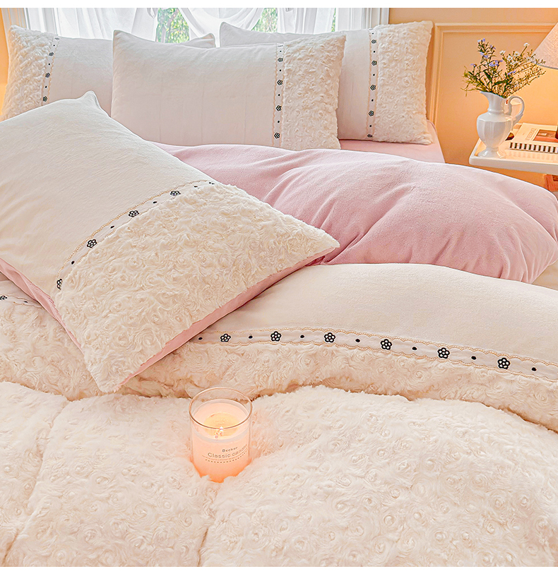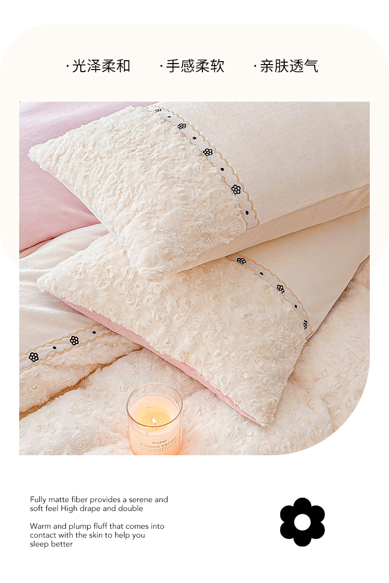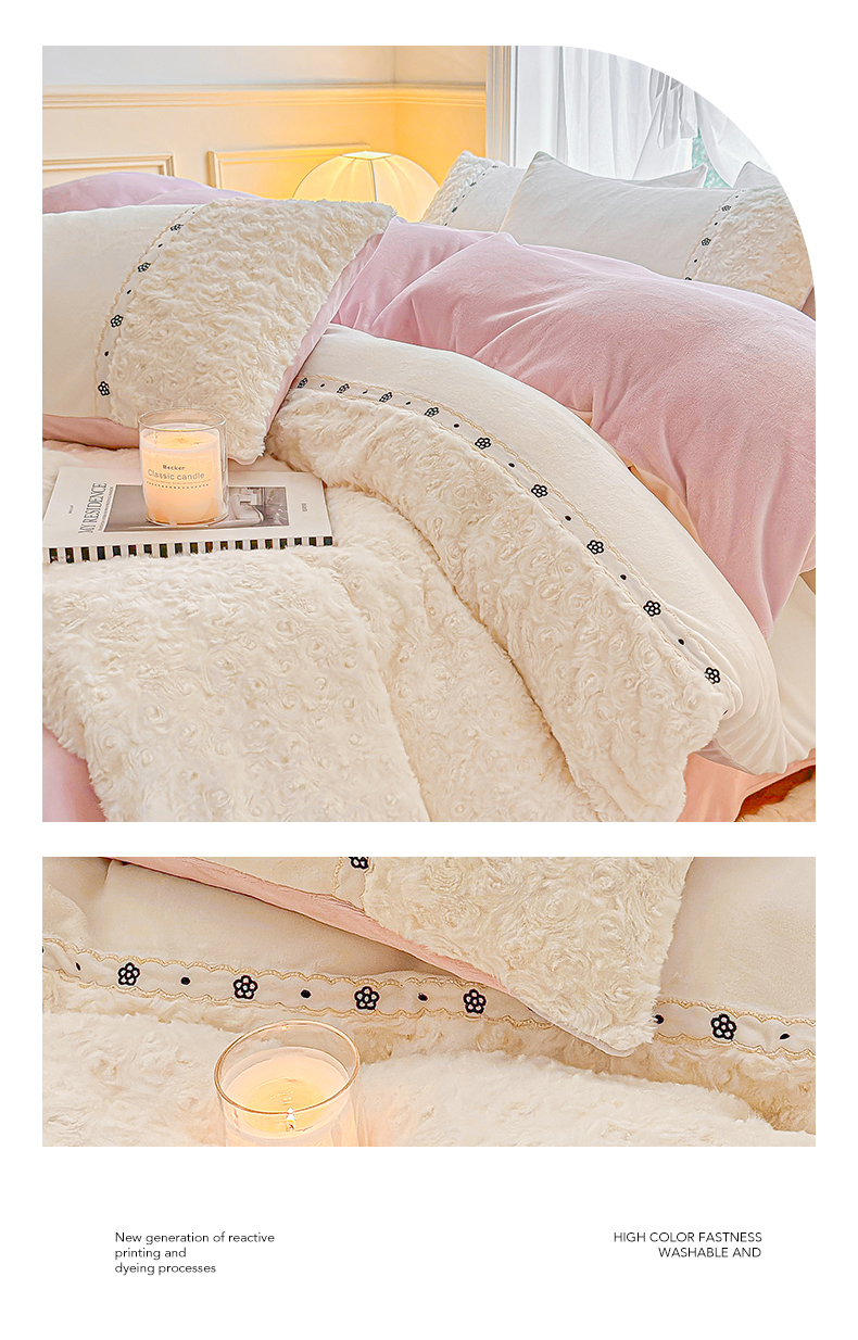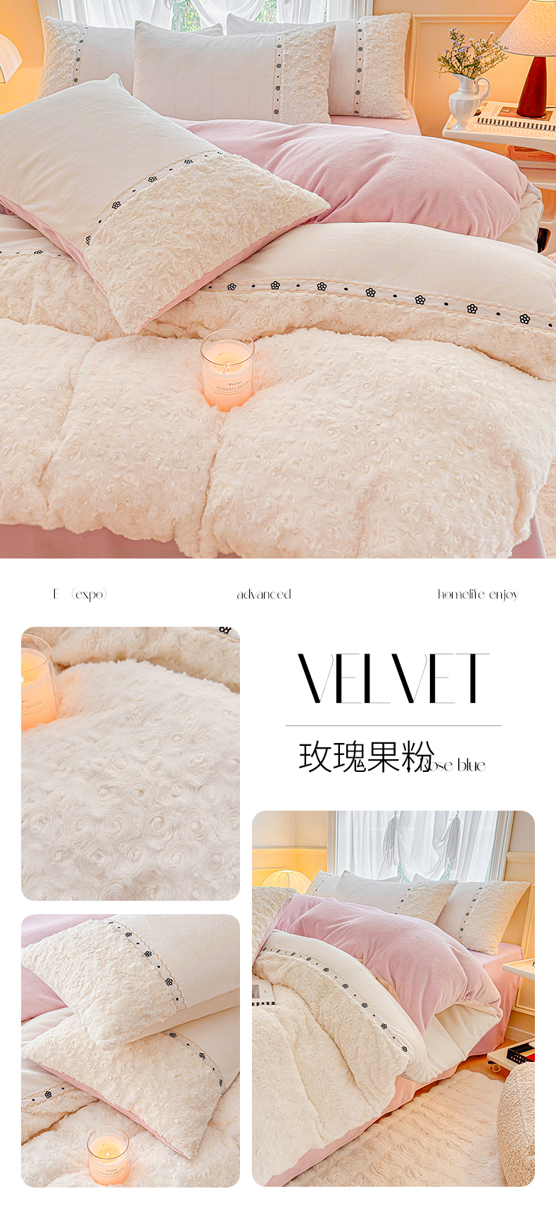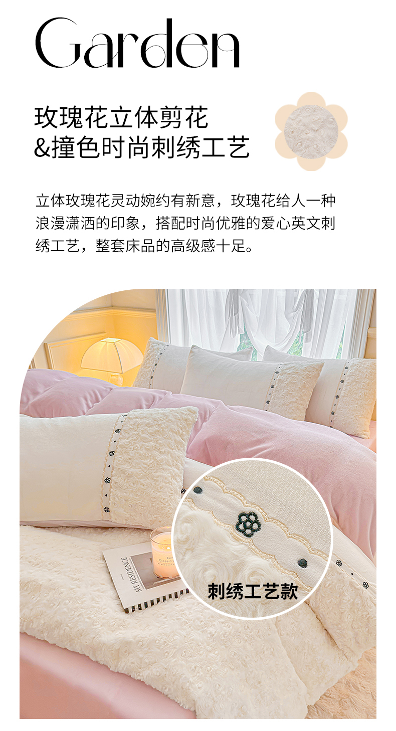 安莱生活 2024新款优雅獭兔牛奶绒刺绣工艺款四件套 暖暖恋-风格二 玫瑰果粉