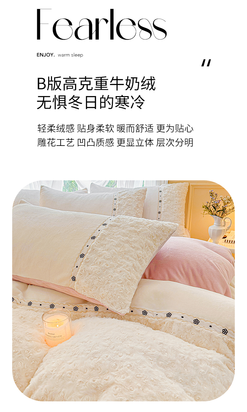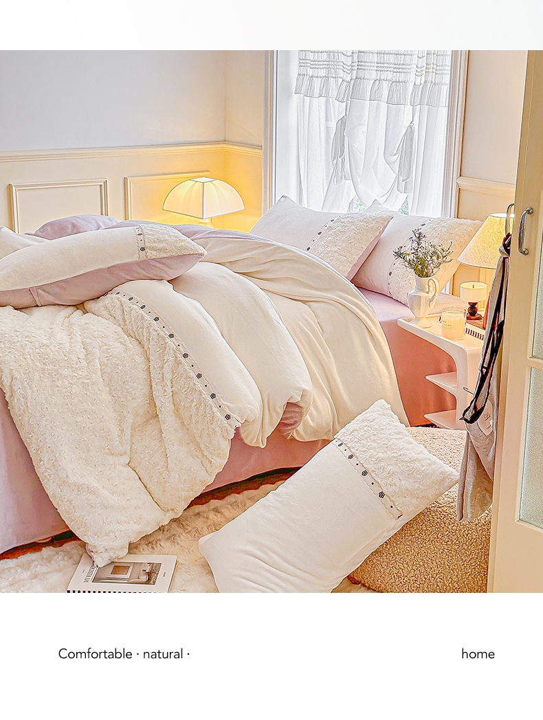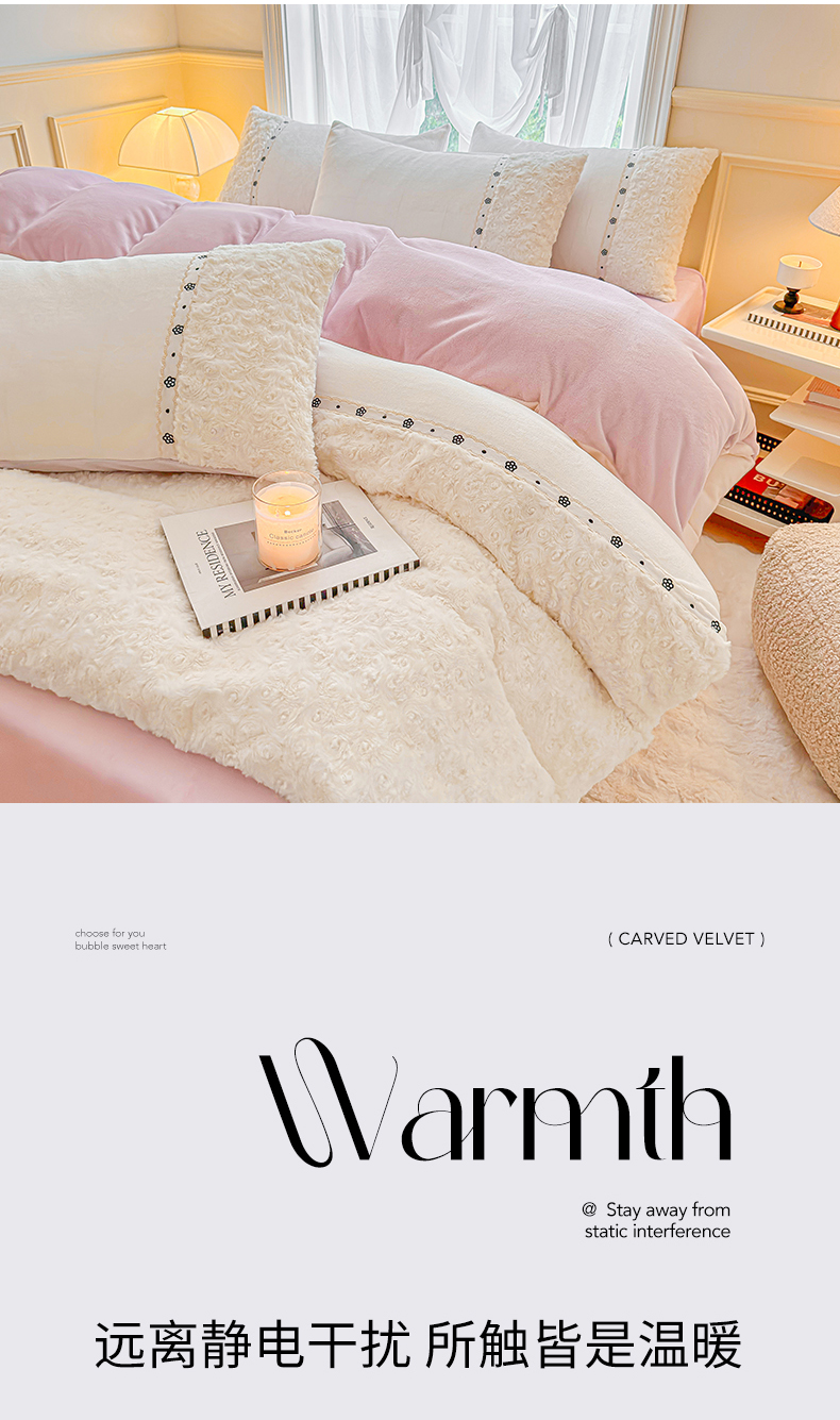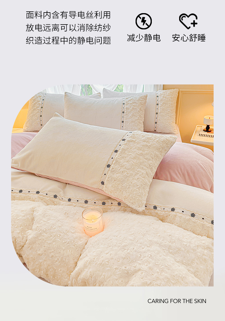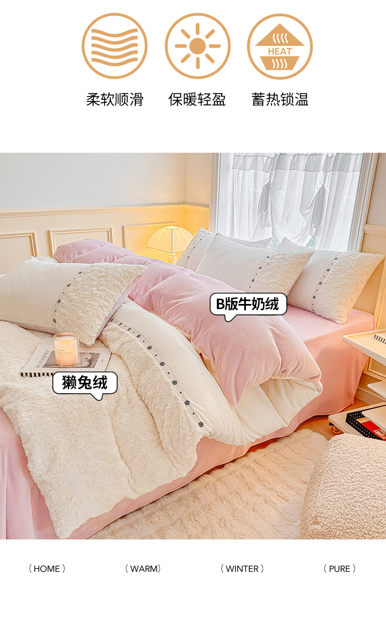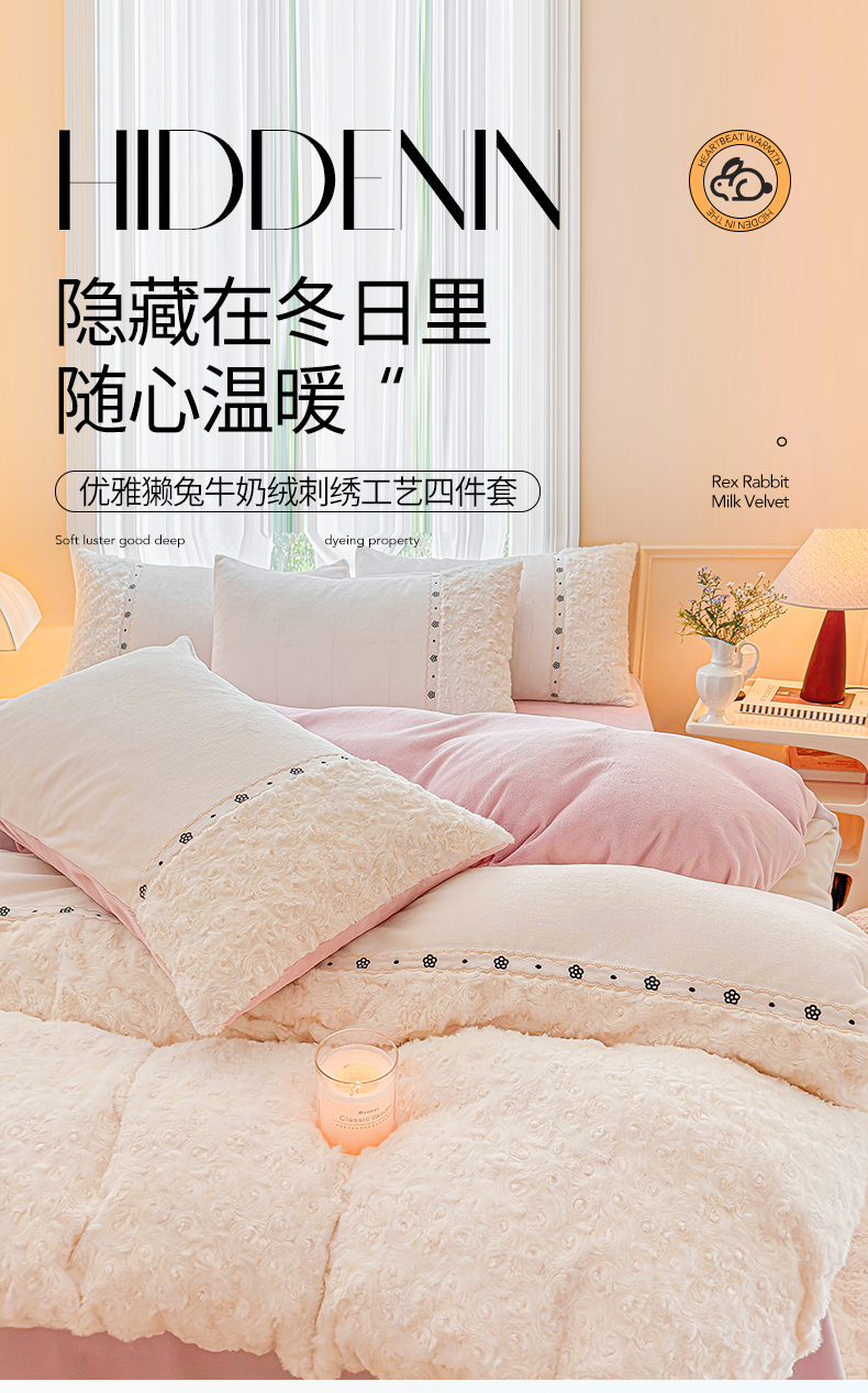 安莱生活 2024新款优雅獭兔牛奶绒刺绣工艺款四件套 暖暖恋-风格二 玫瑰果粉