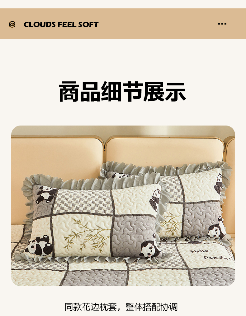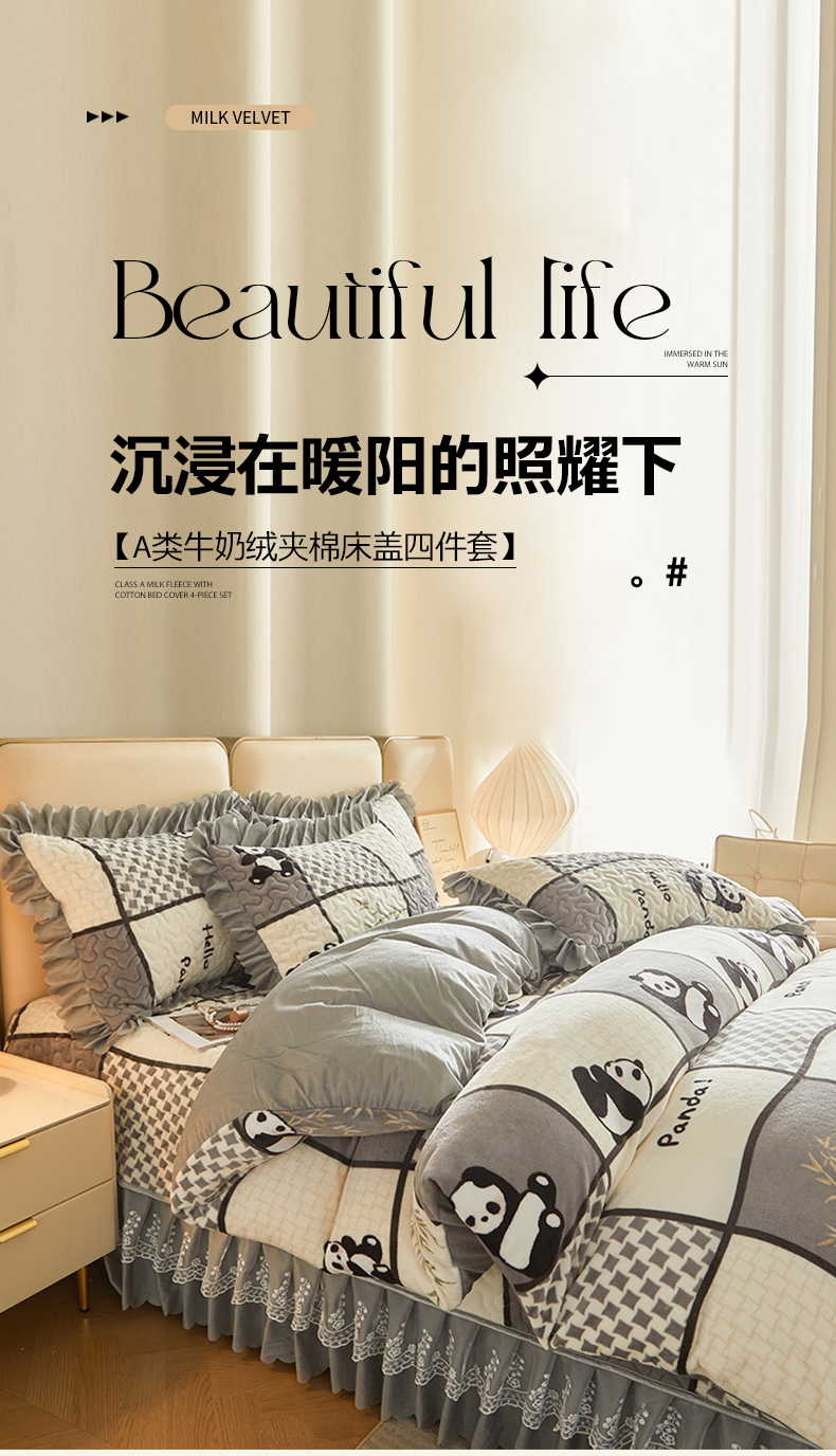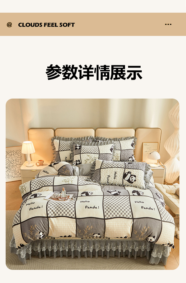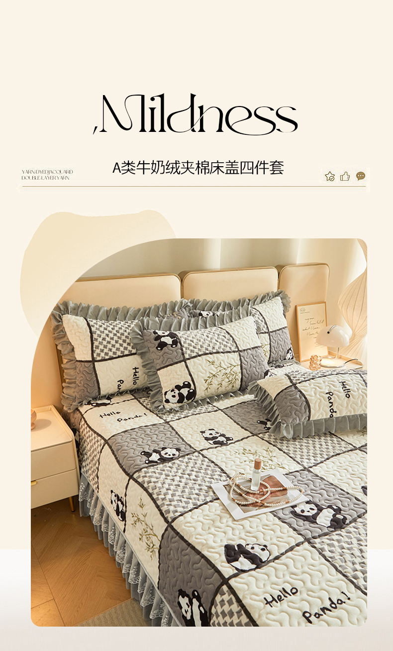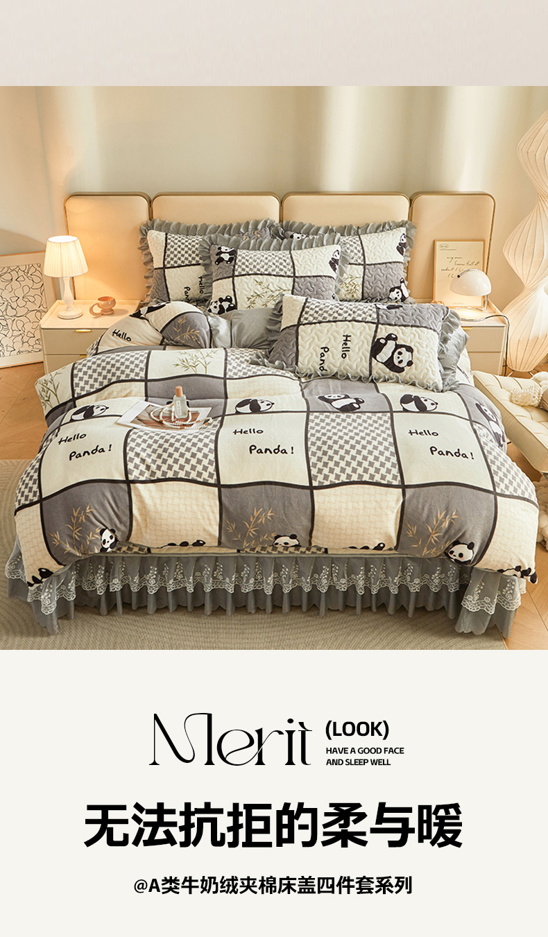 • 91家纺网 家纺一手货源 找家纺 艾裙海 2025新款高克重加厚保暖A类牛奶绒夹棉床盖系列四件套 熊猫皮皮