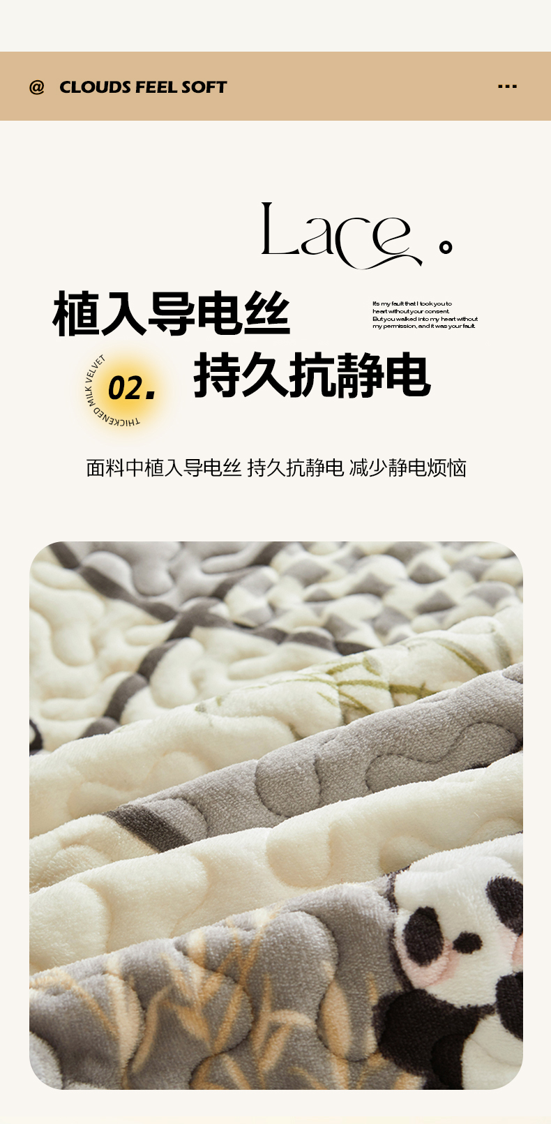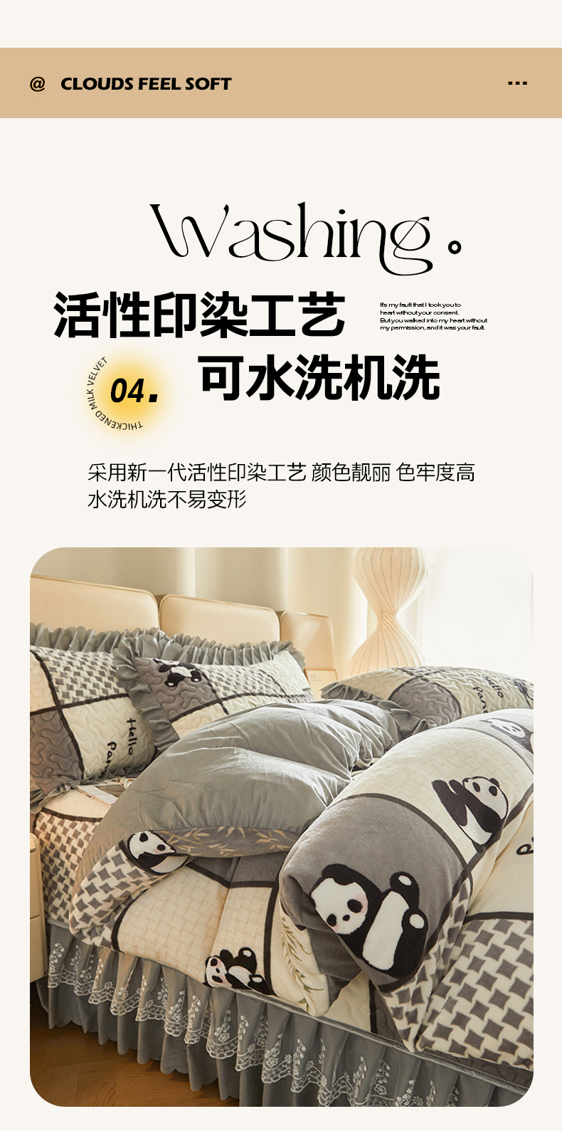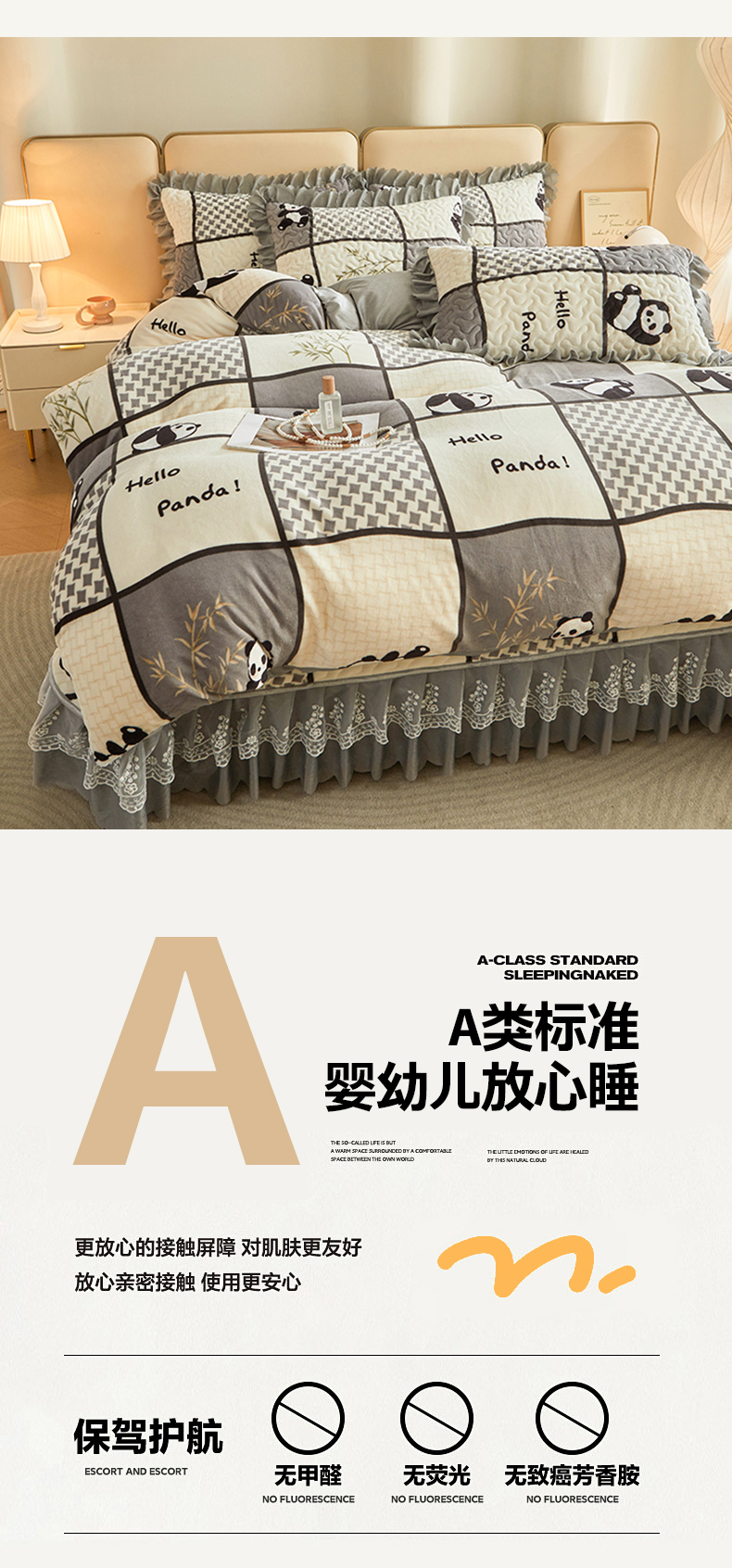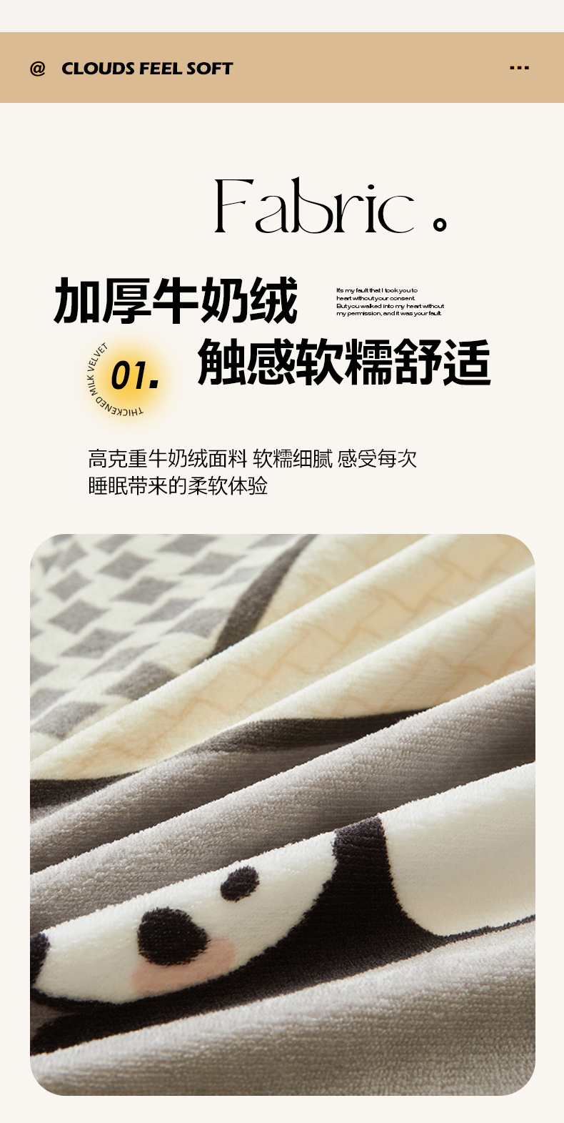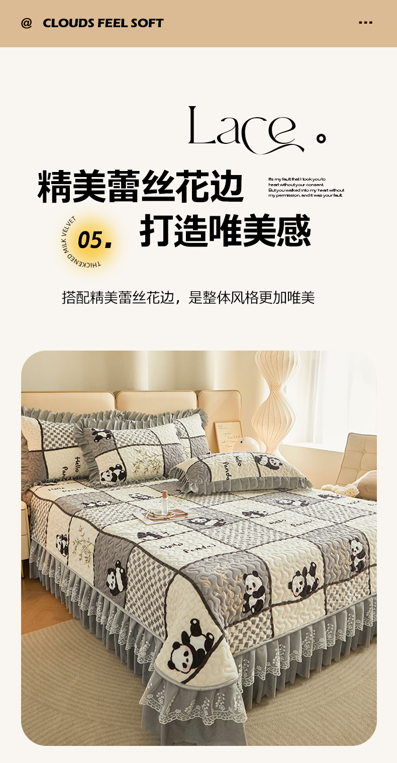 • 91家纺网 家纺一手货源 找家纺 艾裙海 2025新款高克重加厚保暖A类牛奶绒夹棉床盖系列四件套 熊猫皮皮