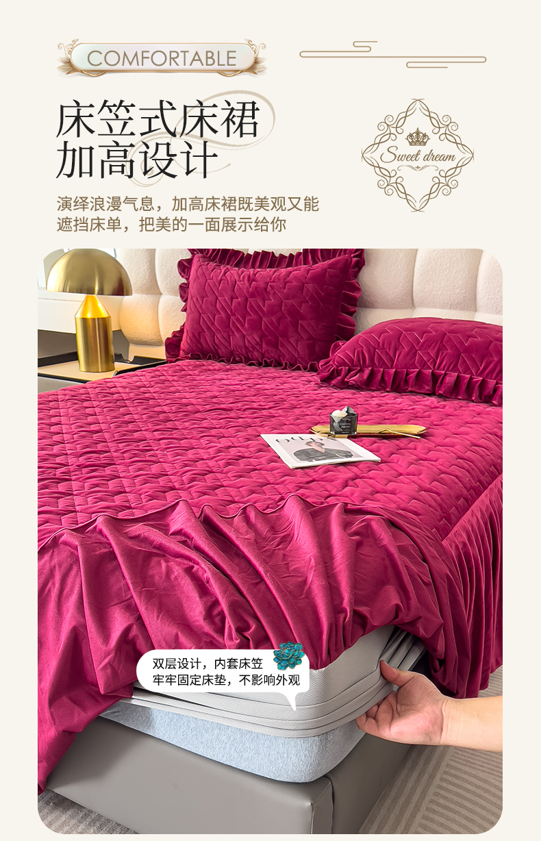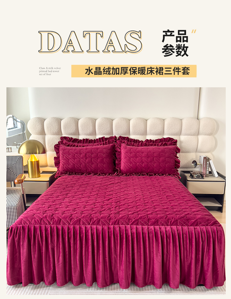 (总)屹成家纺2025新款水晶绒夹棉绗缝床裙四件套(塞纳河畔)四件套起售价不低于230元,大红,豆沙,翡翠绿,粉玉,橄榄绿,蔚蓝,银灰