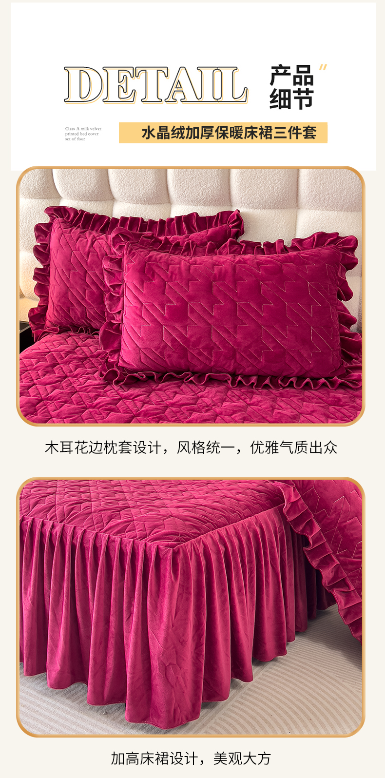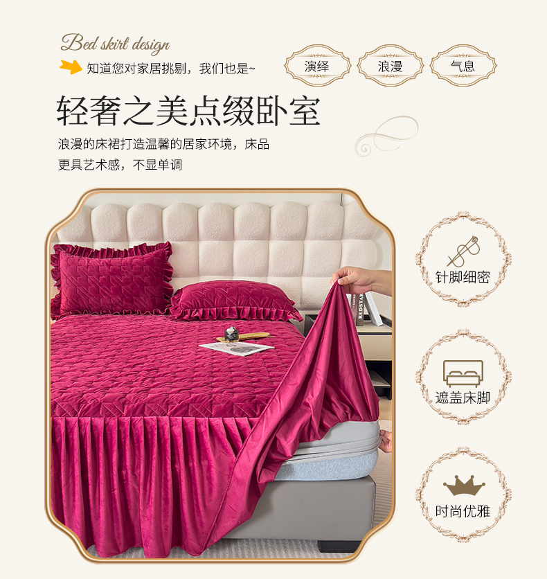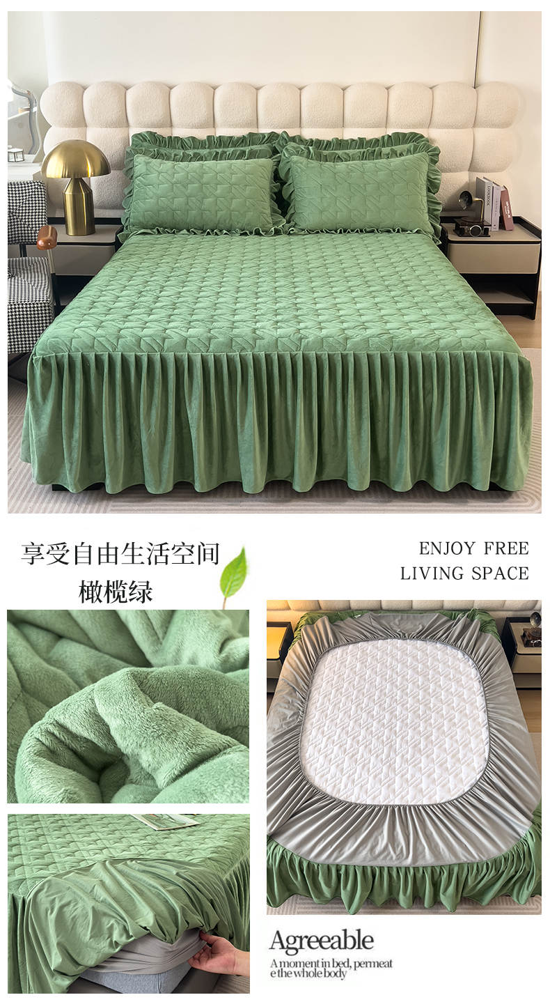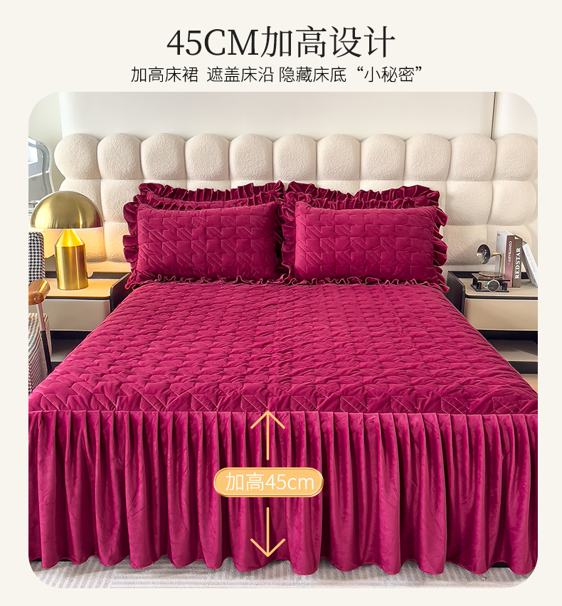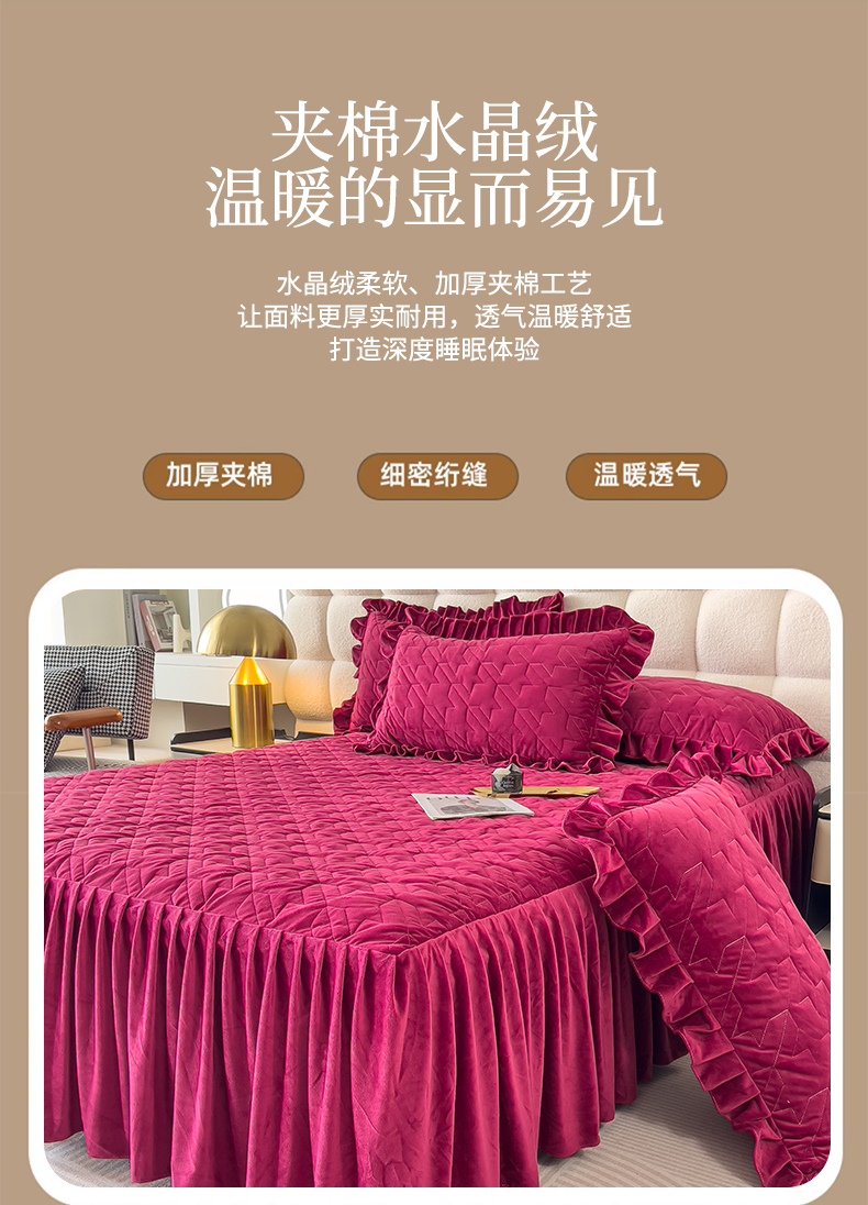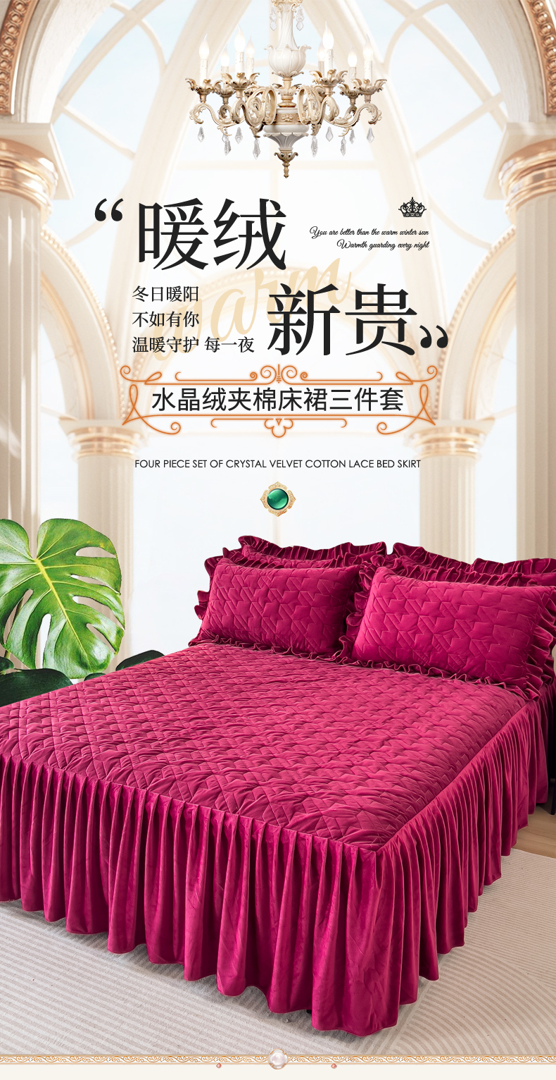 (总)屹成家纺2025新款水晶绒夹棉绗缝蕾丝床裙三件套(塞纳河畔)床裙单件起售价不低于105元,大红,豆沙,翡翠绿,粉玉,橄榄绿,蔚蓝,银灰