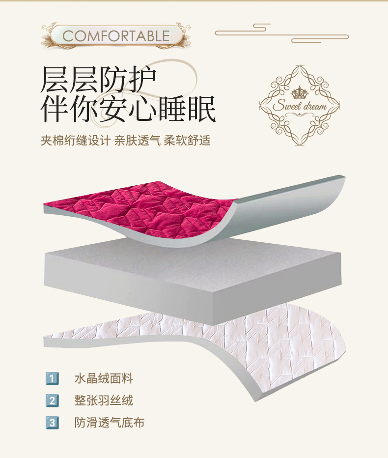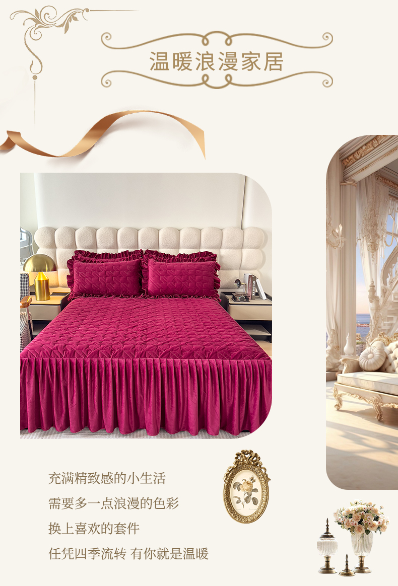 • 91家纺网 家纺一手货源 找家纺 (总)屹成家纺2025新款水晶绒夹棉绗缝蕾丝床裙三件套(塞纳河畔)床裙单件起售价不低于105元,大红,豆沙,翡翠绿,粉玉,橄榄绿,蔚蓝,银灰